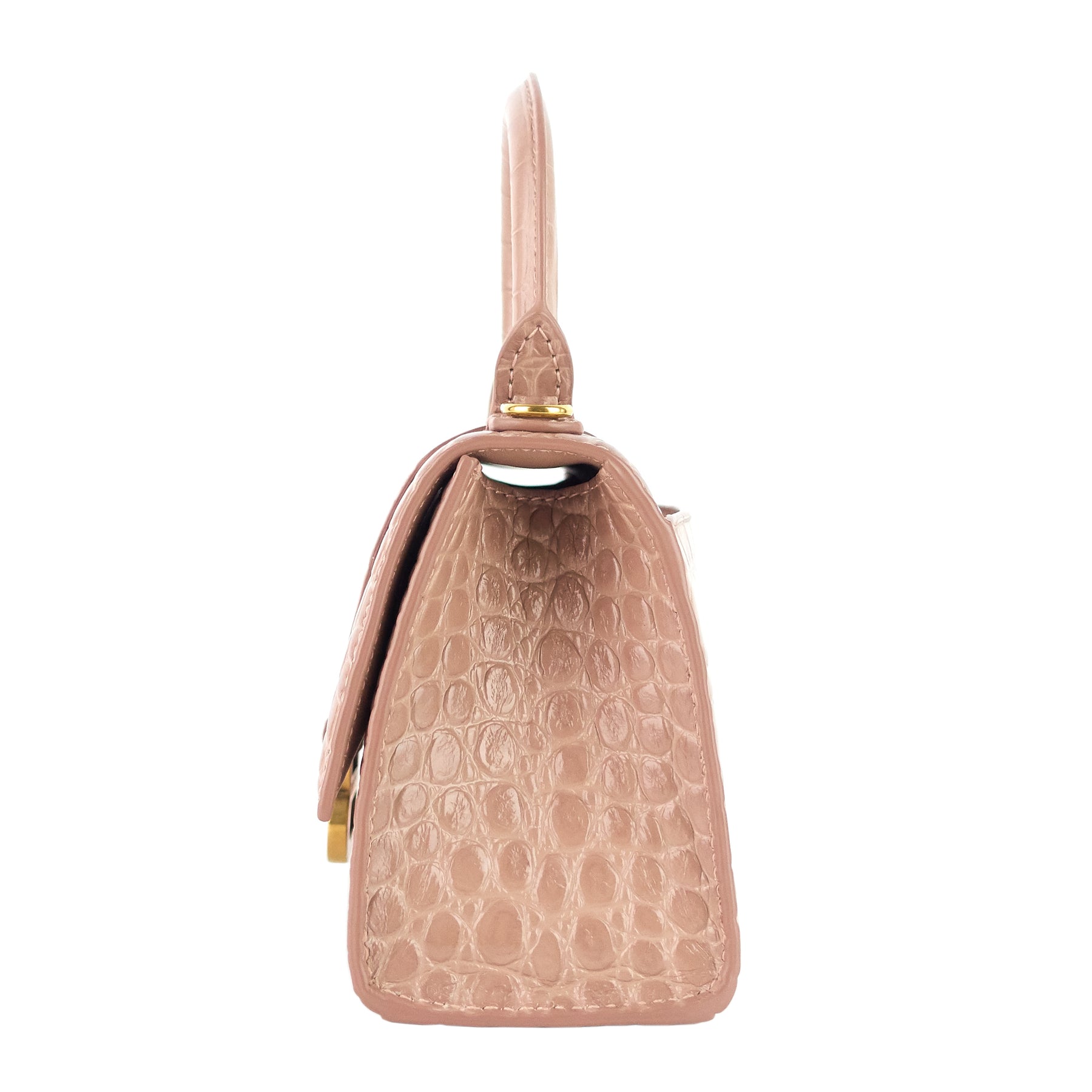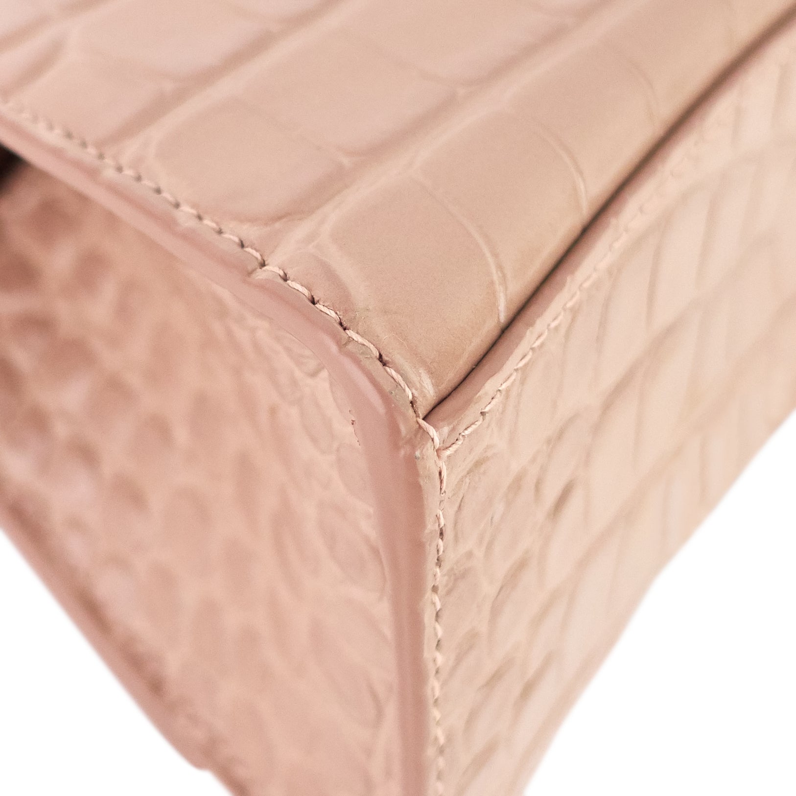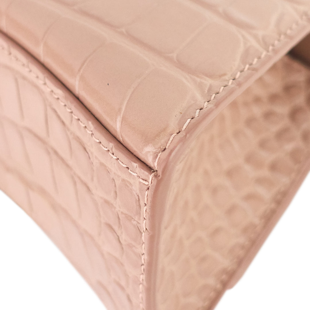 Allover croc embossing lends exotic appeal to an ultra-compact handbag featuring a curvilinear silhouette and an optional crossbody strap.