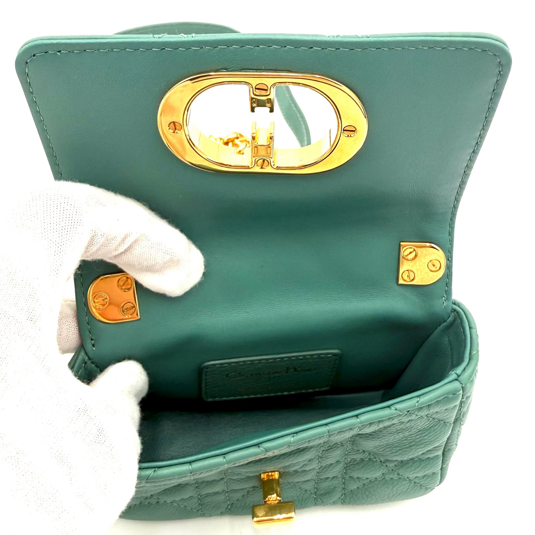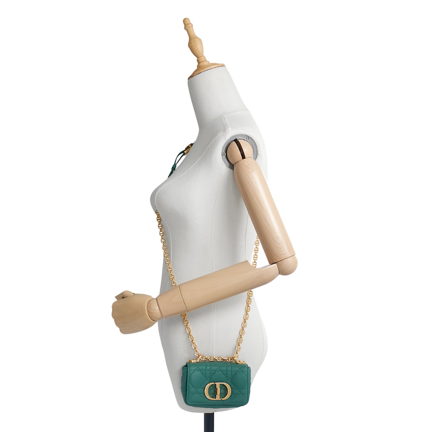 Crafted from calfskin, this petite bag is beautifully textured with meticulous microcannage stitching and finised with a bold, chunky metal CD twist clasp. It swings from a chain strap with iconic CD links.