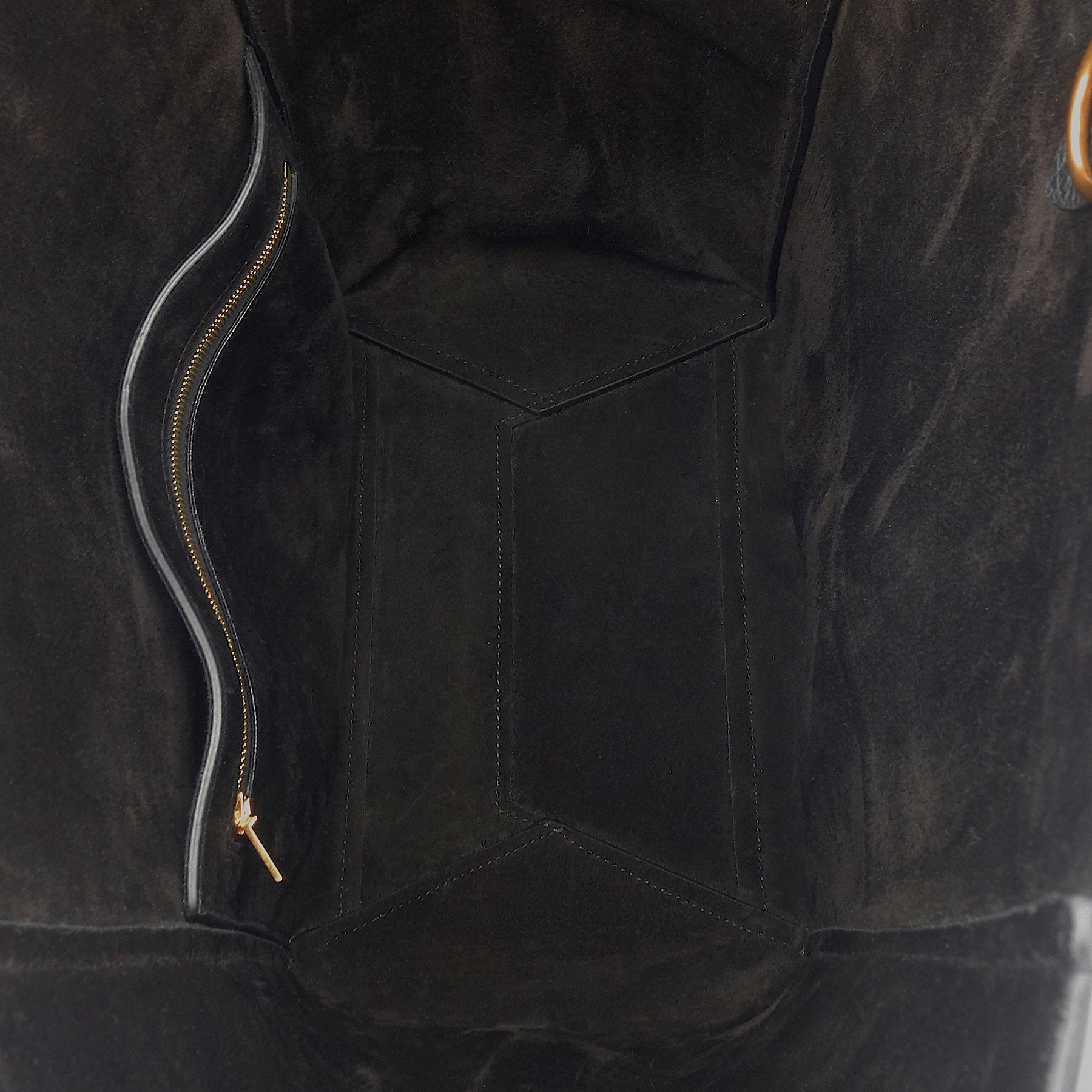 Overall: The exterior leather is largely pristine, with only several minor scuff marks and surface scratches present. The suede lining is clean with signs of rubbing consistent with use. The wool strap and hardware have no noticeable wear.