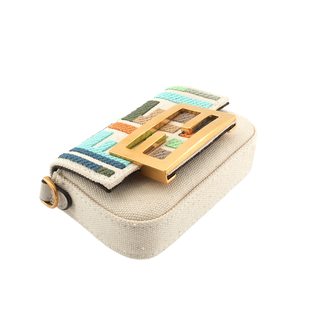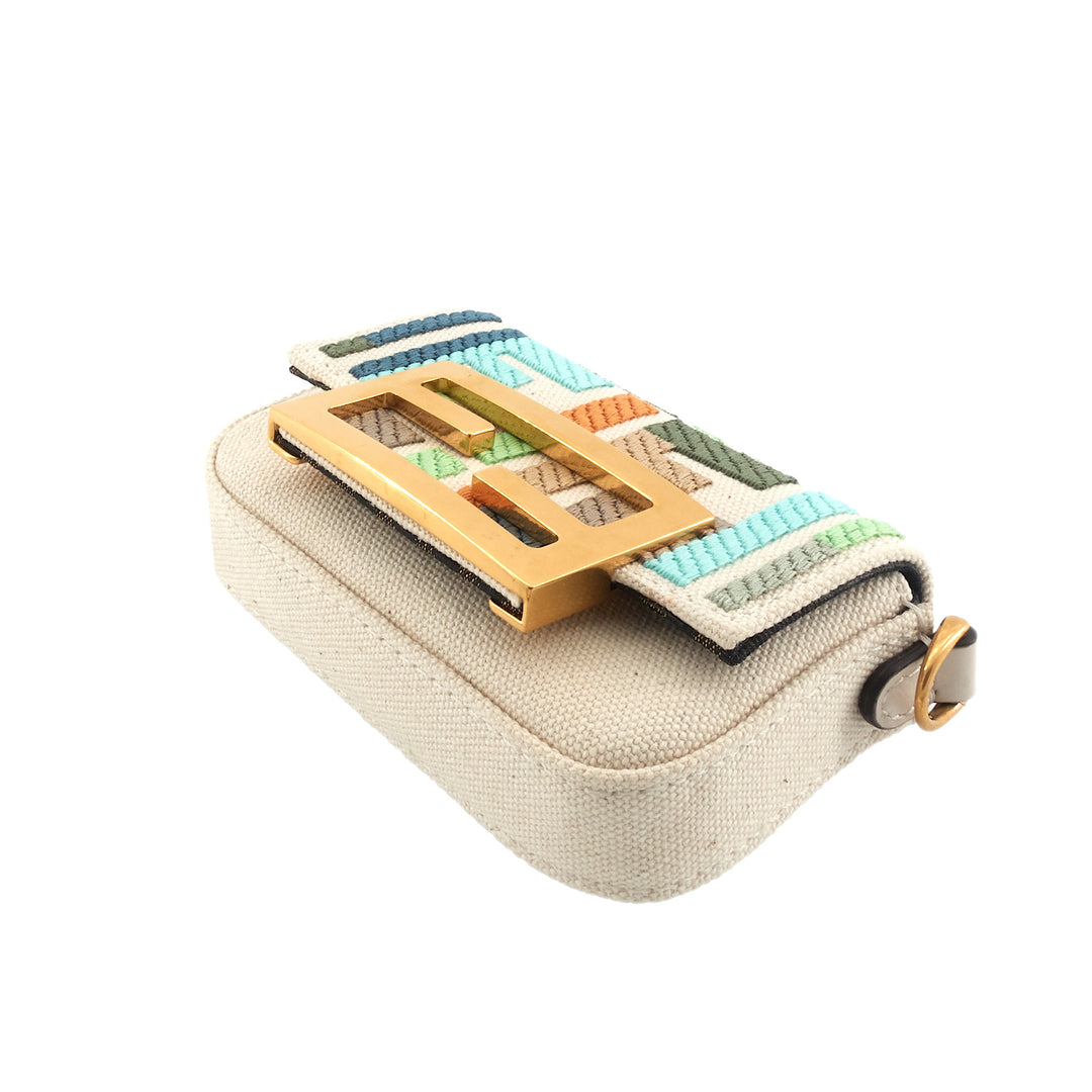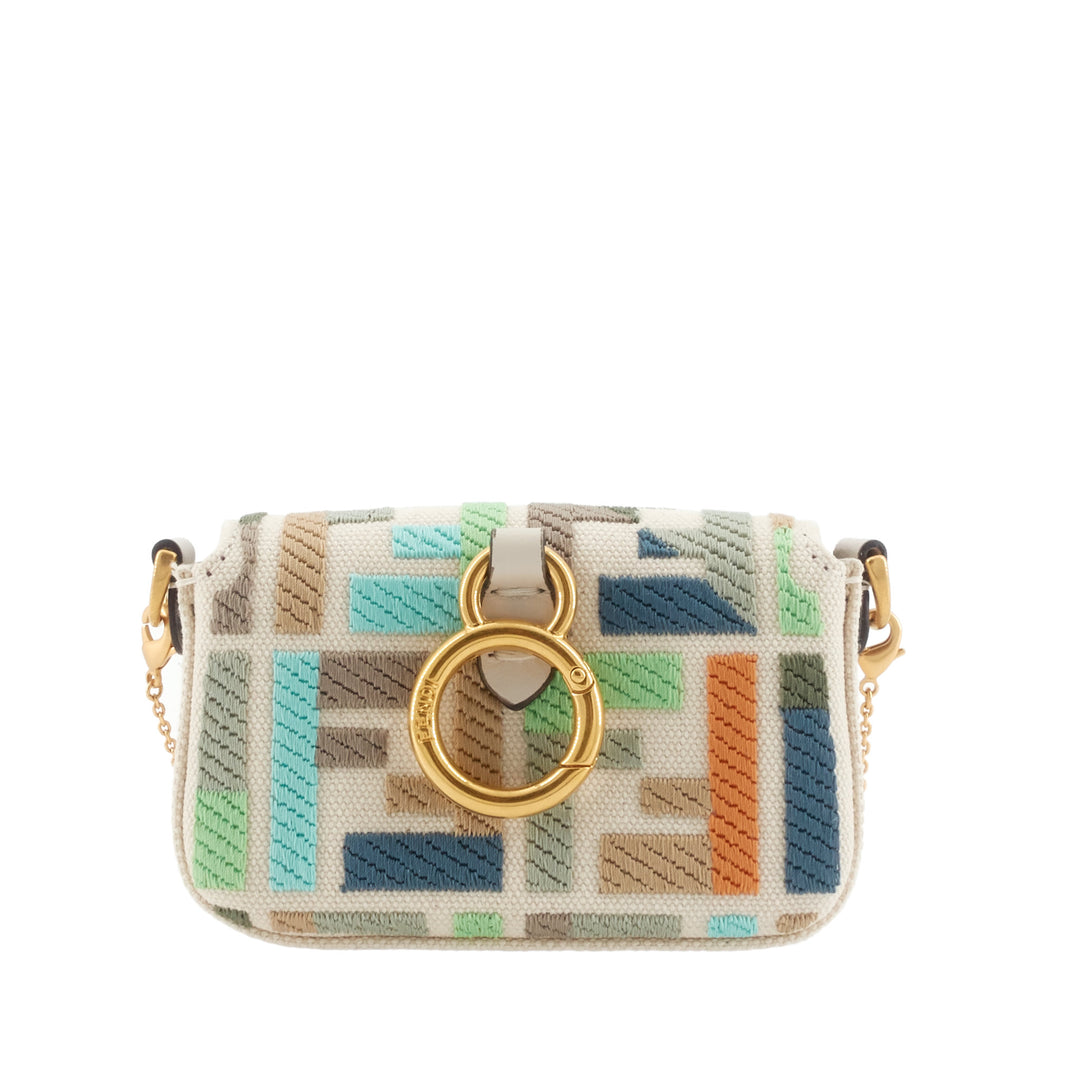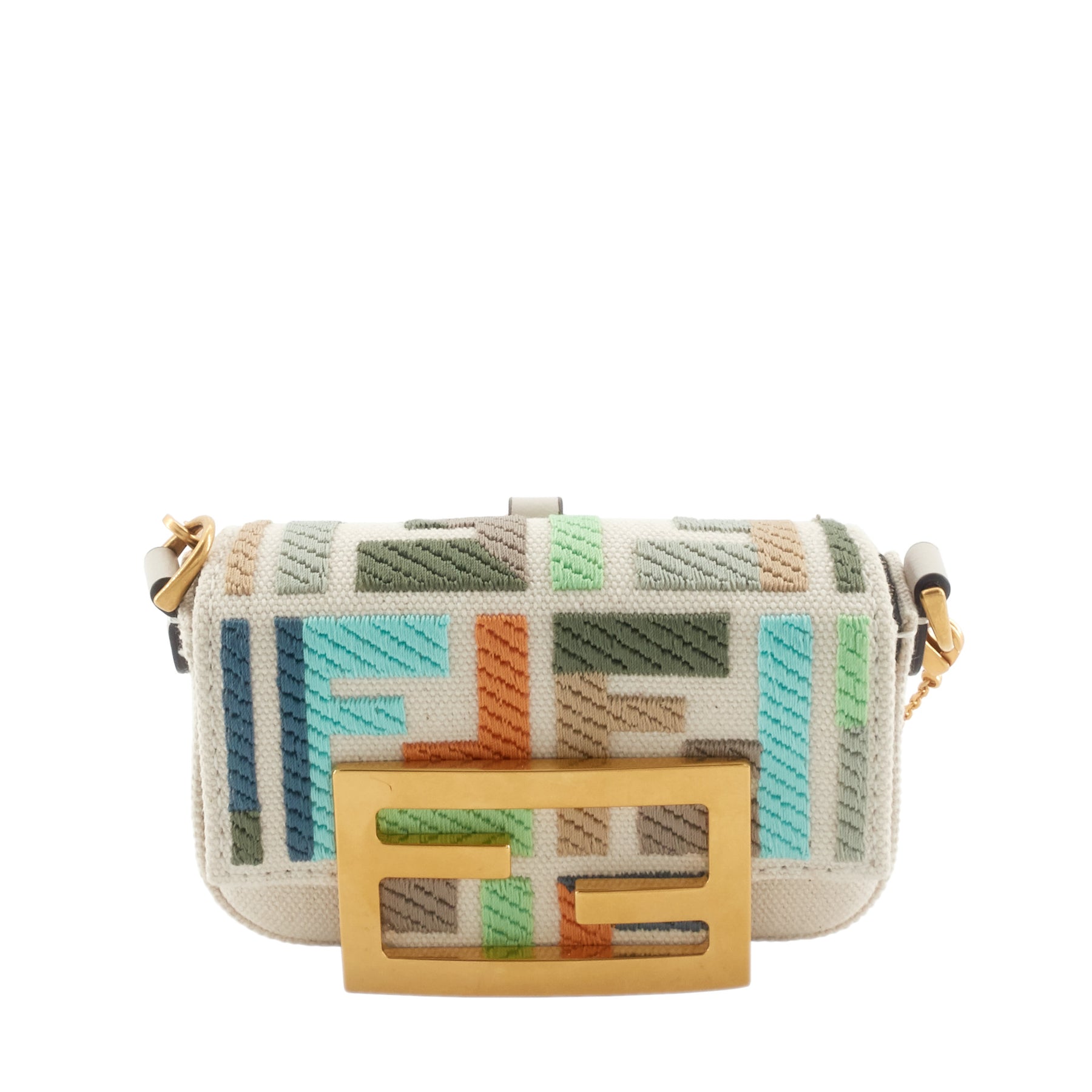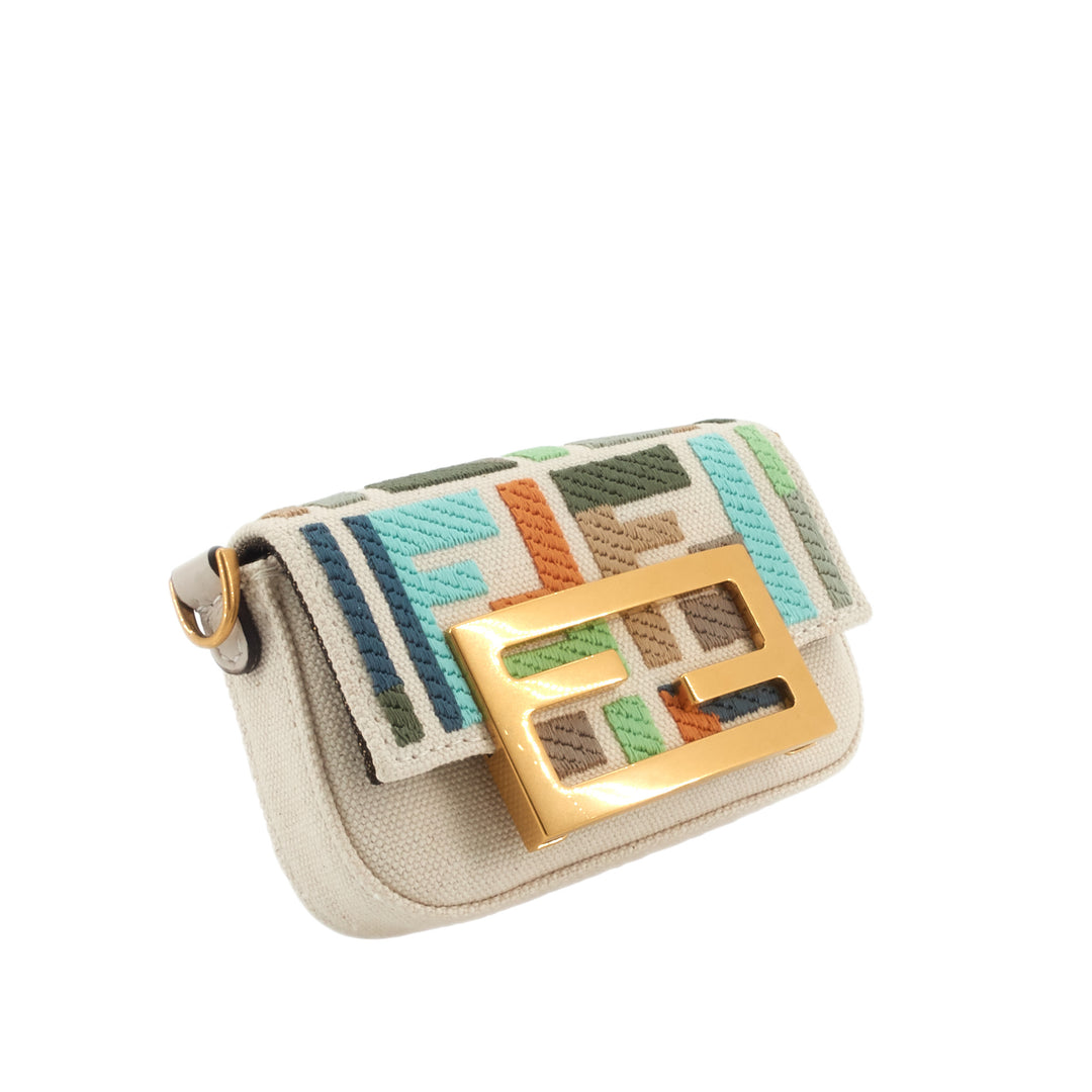 Fendi's iconic double-F logo distinguishes both the hardware and embroidered canvas of a baguette bag that's small in size but big in style.