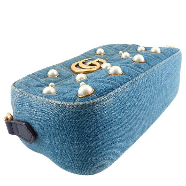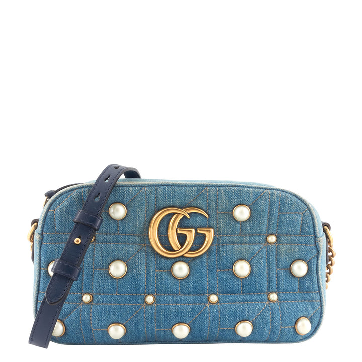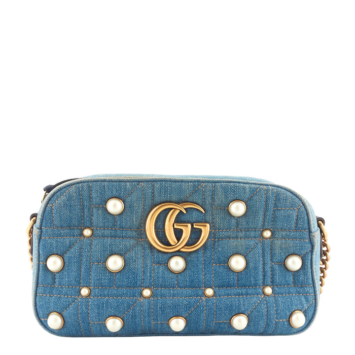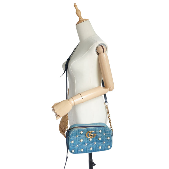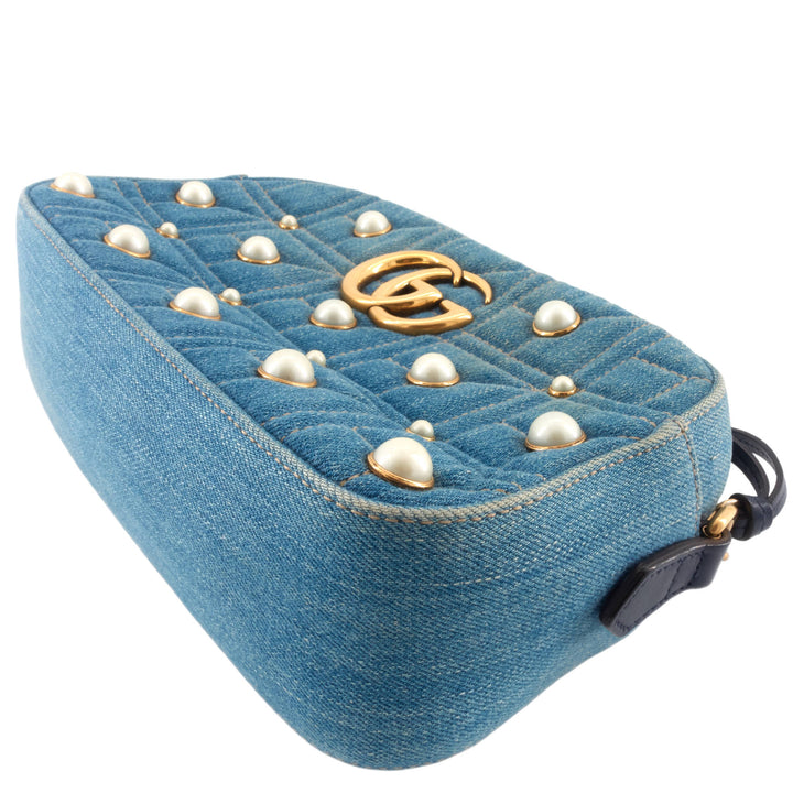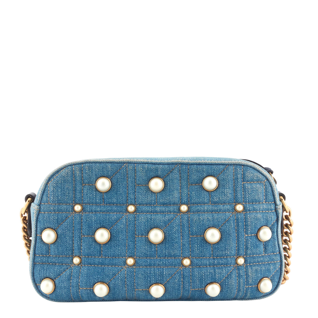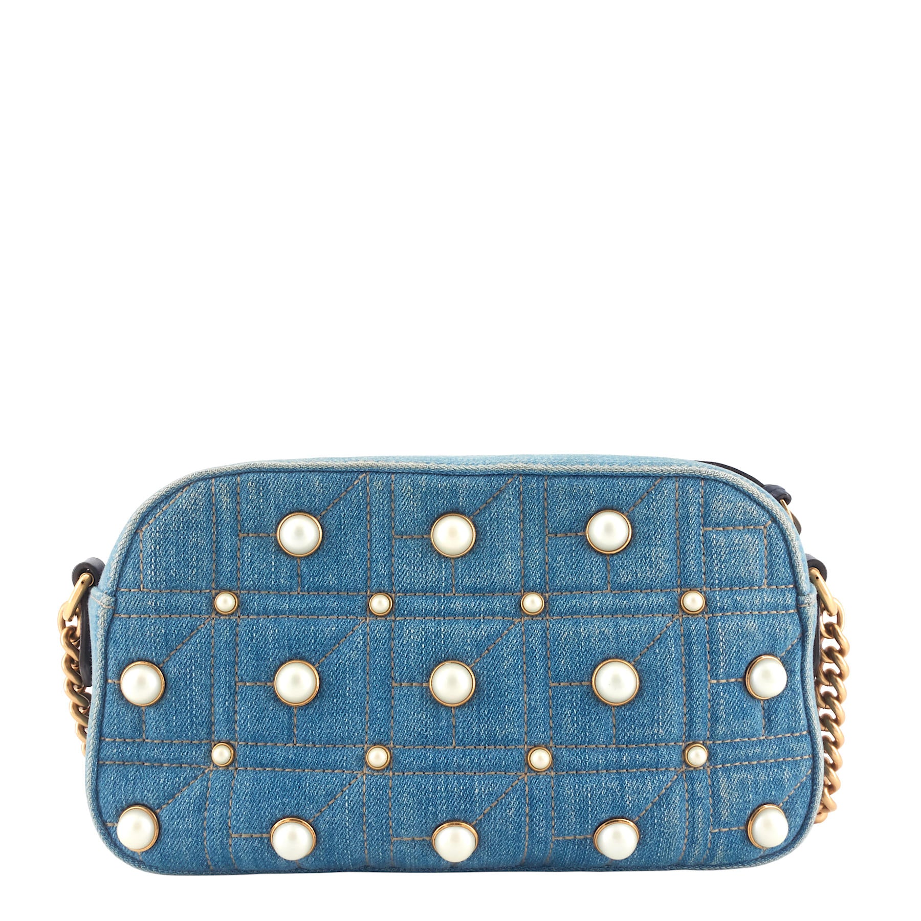 Faux pearls dot the exterior of this faded denim crossbody, while a satin lining and double-G hardware inspired by archival designs complete the luxe look.