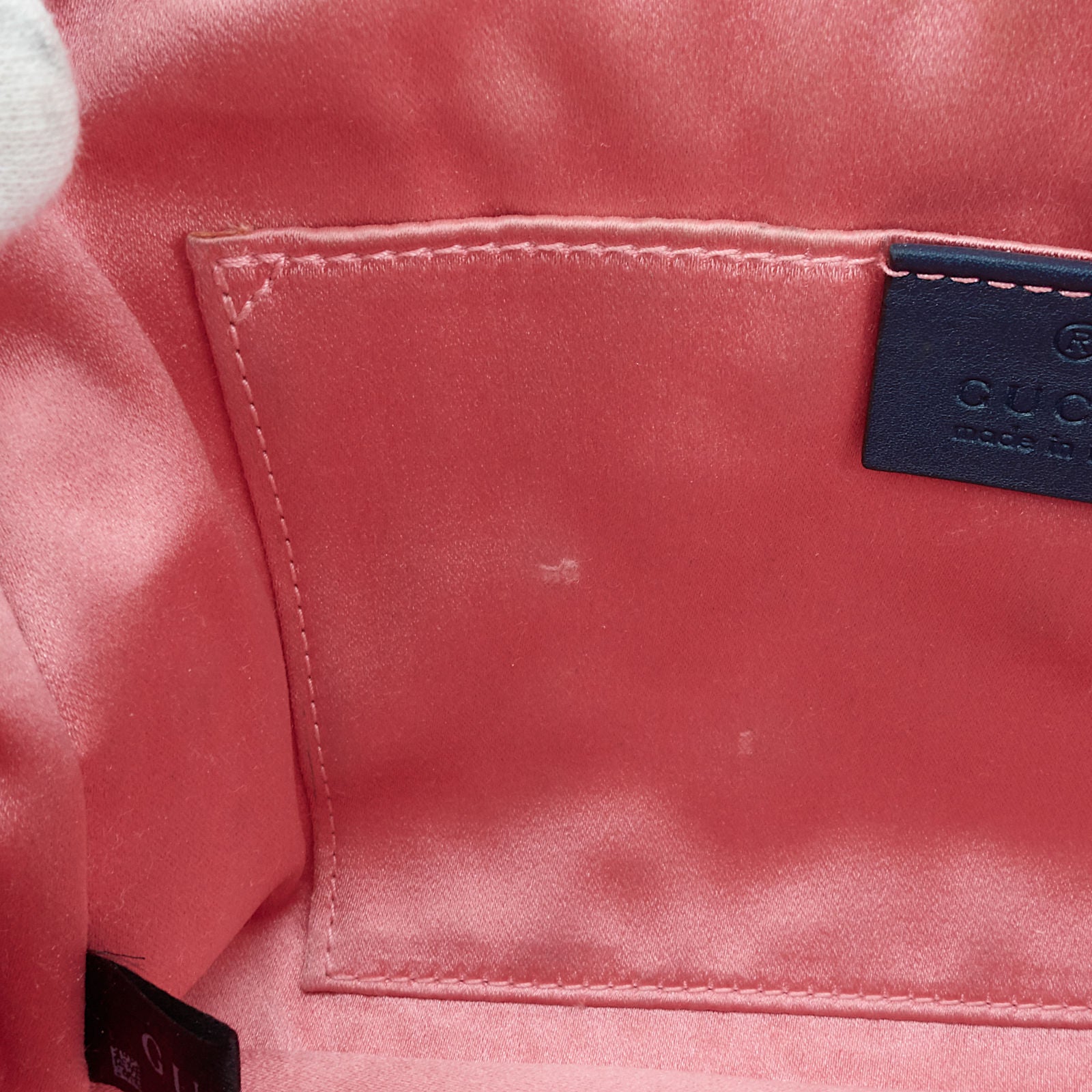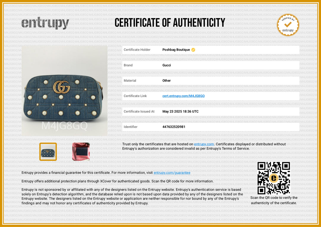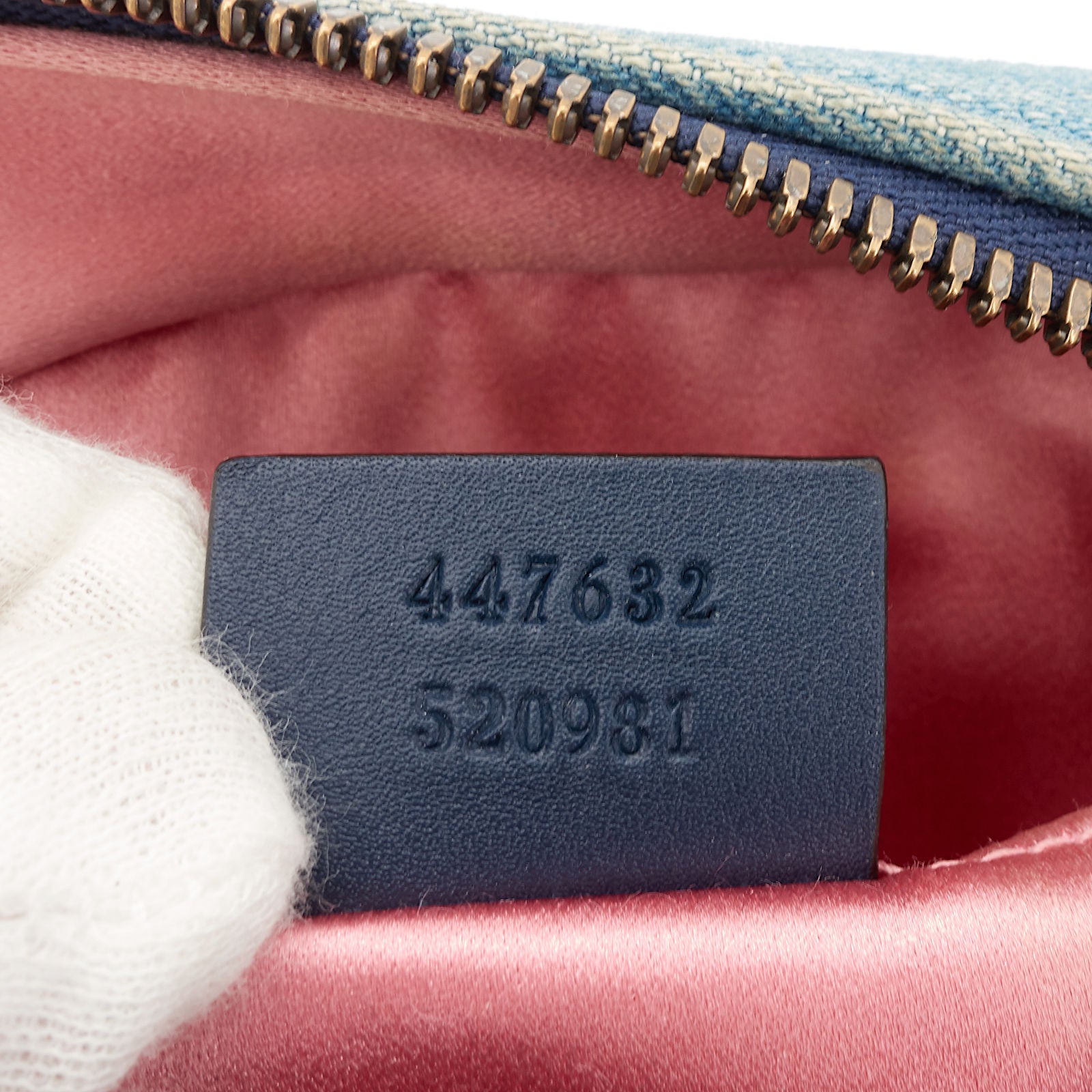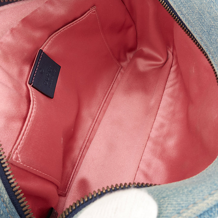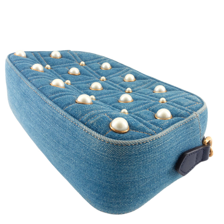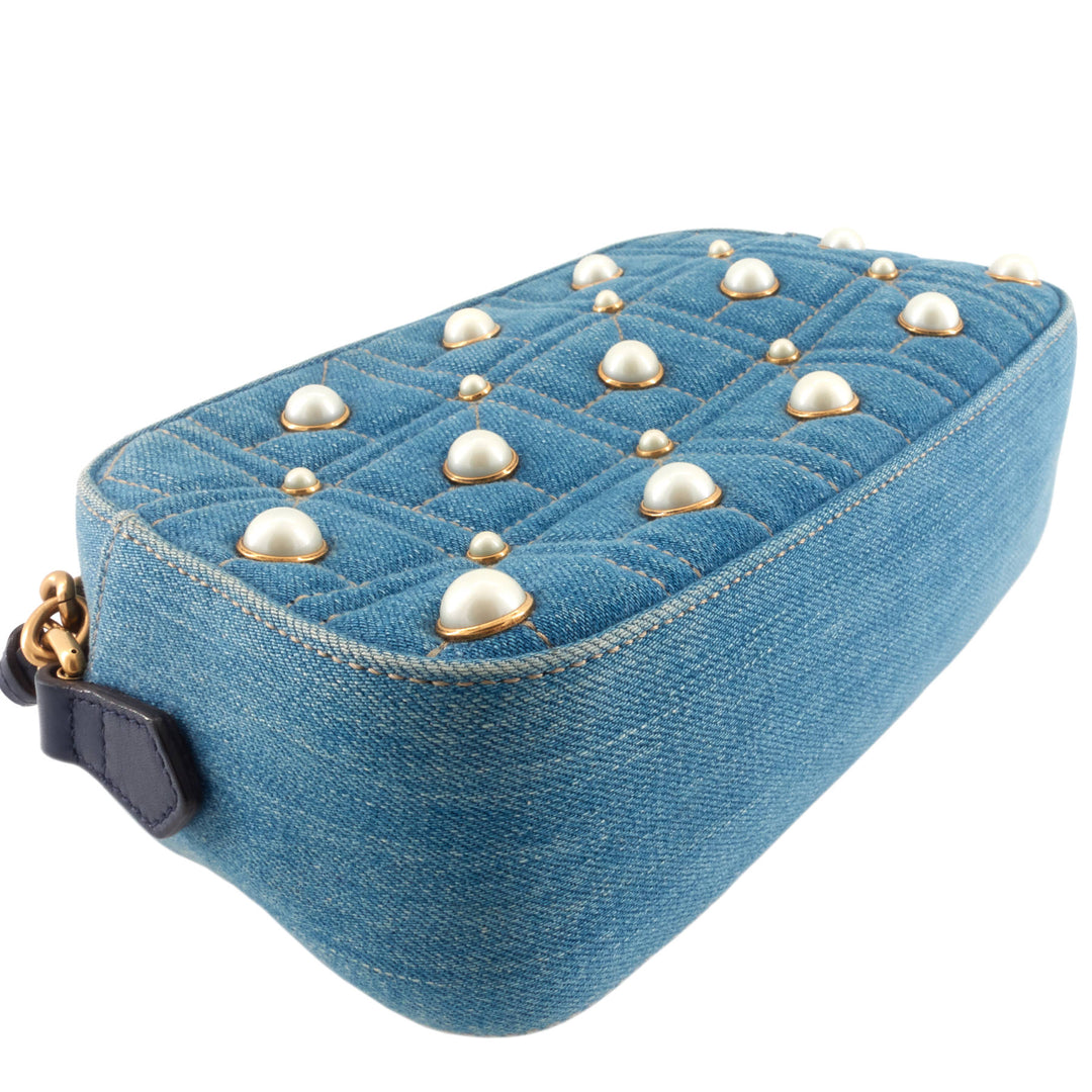 Faux pearls dot the exterior of this faded denim crossbody, while a satin lining and double-G hardware inspired by archival designs complete the luxe look.