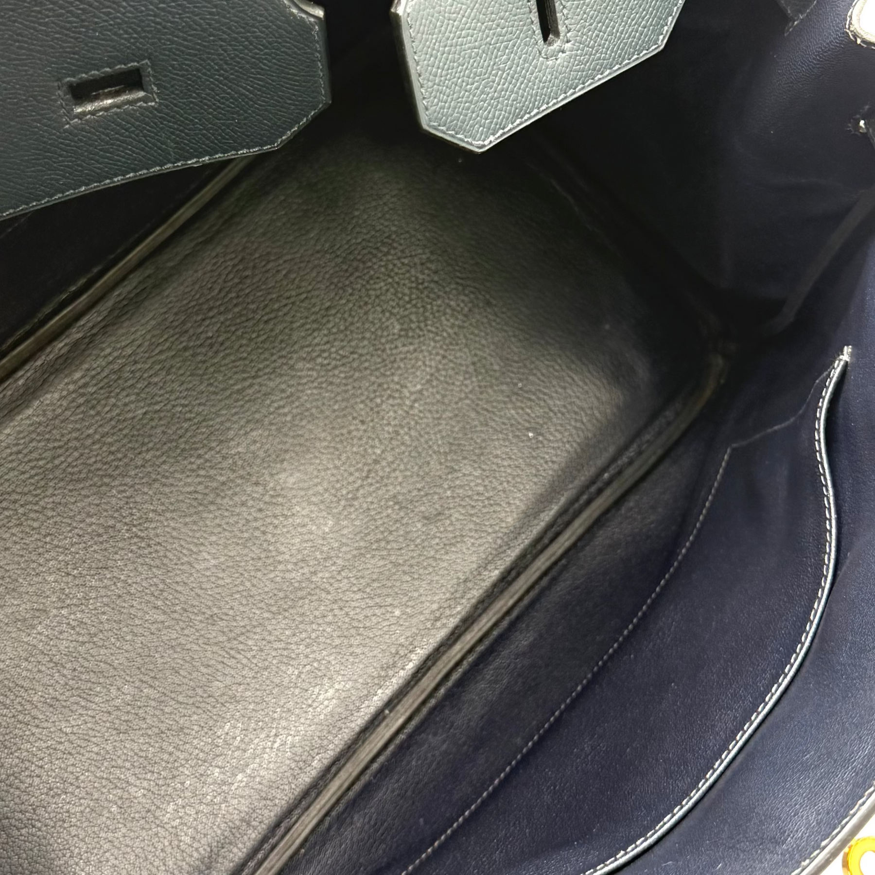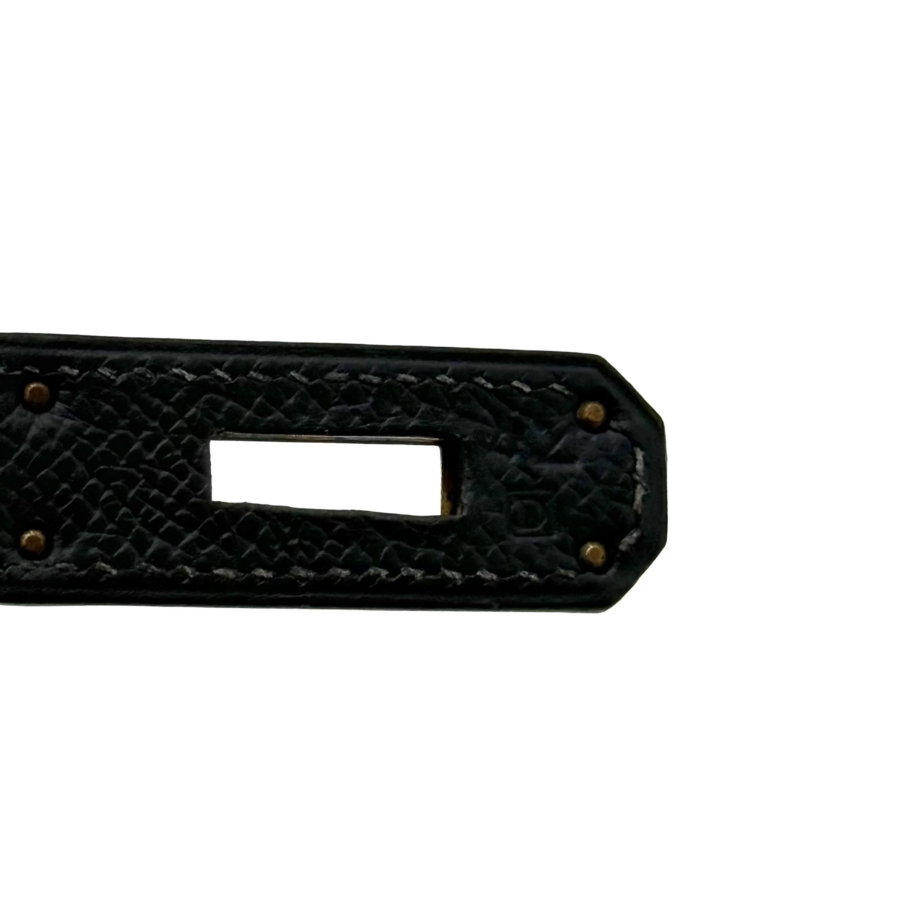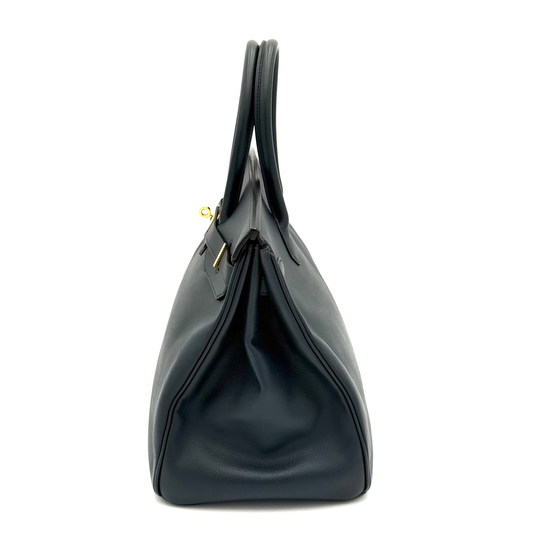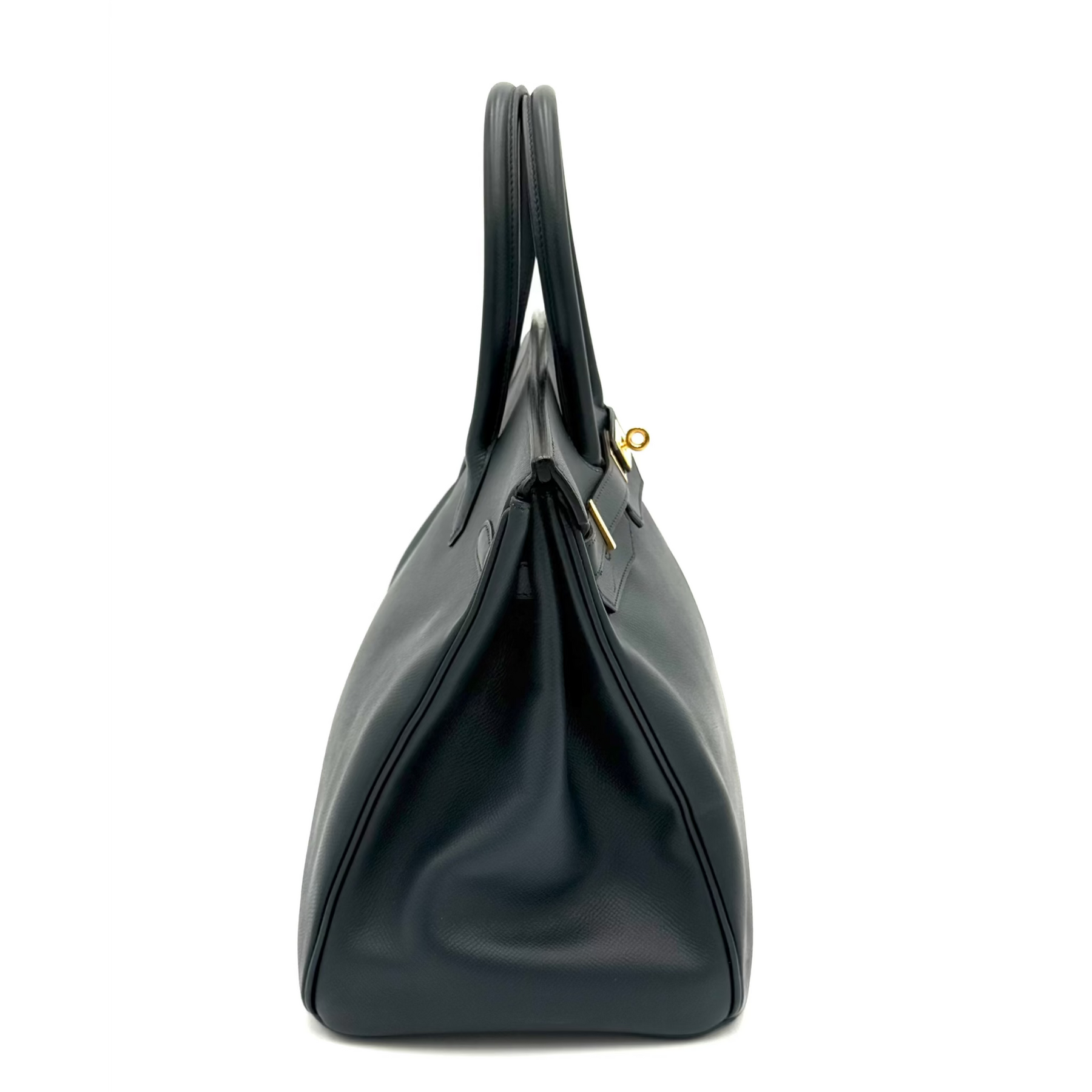 An epsom leather Hermès Birkin 35 in indigo. Not a blue yet not a true black, this ink coloured leather bag is a beautiful neutral. The gold tone hardware has some surface scratches consistent with age. The corners, leather and interior are in good condition. 3rd party authentication included. Please note that Birkin and Kelly products are final sale.