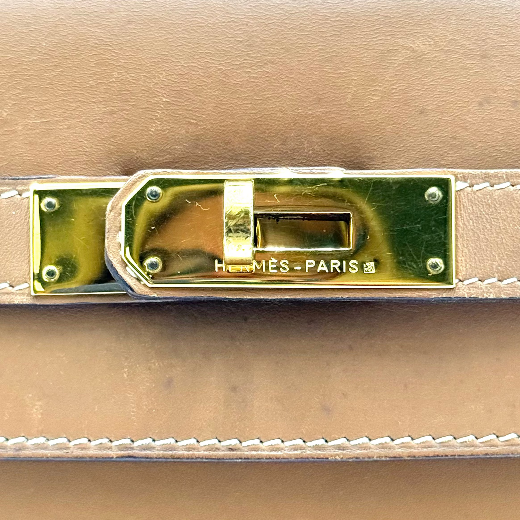 Hermès Kelly 32 in box leather, sellier style with contrast stitching.