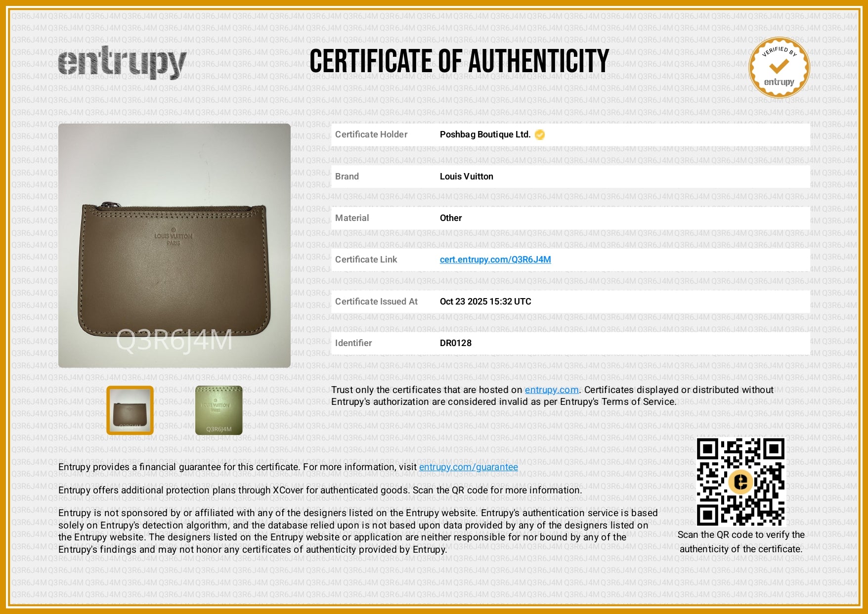 Crafted from smooth taupe calfskin, this piece features silver-toned hardware and a detachable strap that can be worn on the wrist or clipped inside a bag. Detailed with tonal stitching and a subtle Louis Vuitton embossing, it’s perfect for carrying cards or small essentials.
