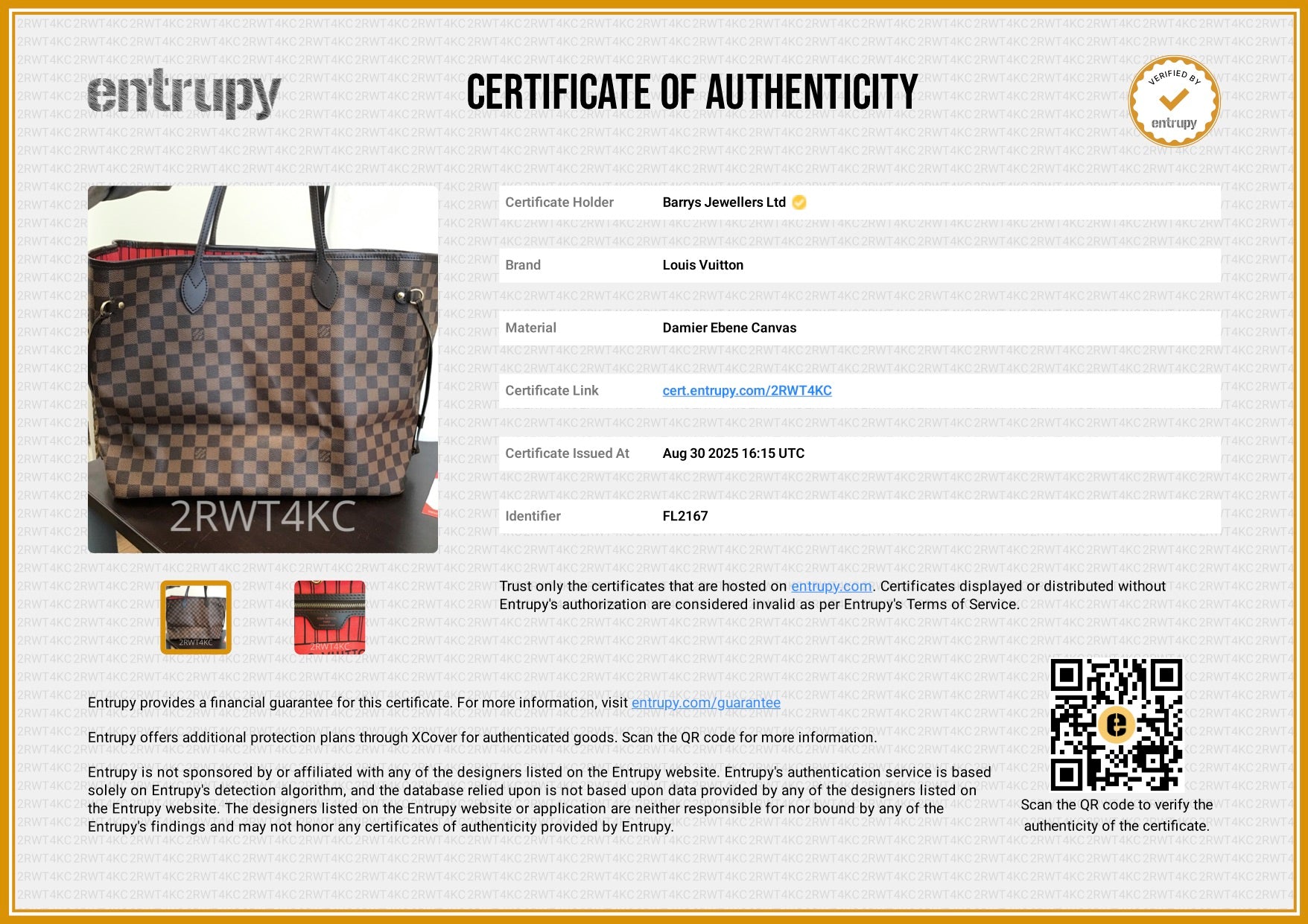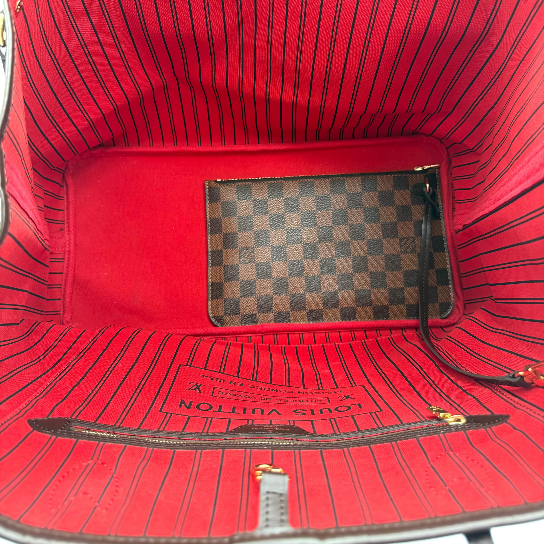Neverfull GM in Damier Ebene with vibrant red interior. Includes detachable pouch. The perfect tote for travel and everyday living.