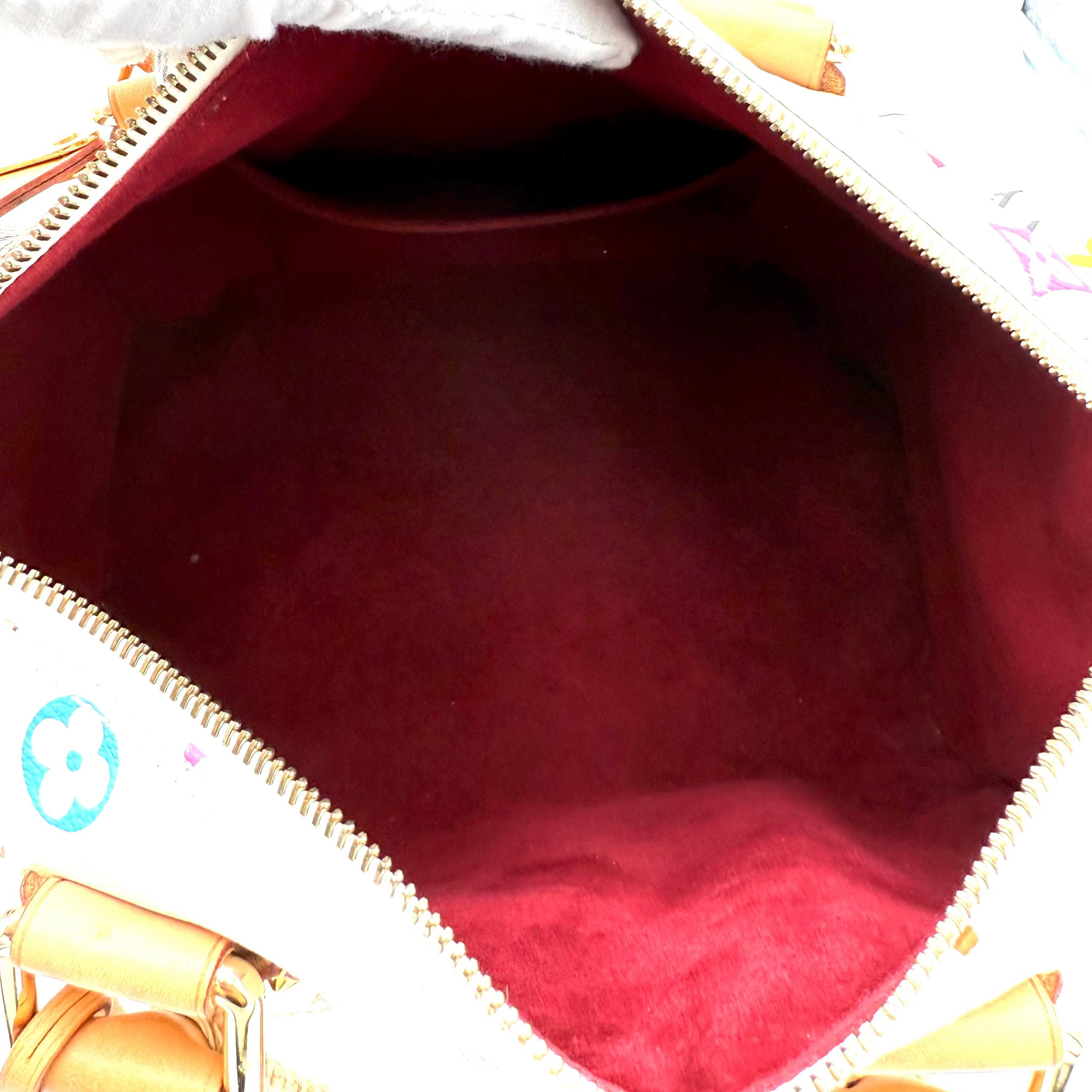 Overall: A great bag! An iconic choice in great condition. Interior suede appears nearly new. No marks or stains. White canvas is also clean and colours are bright. Covers have nicely protected the vachetta handles and kept them virtually mark free. Hardware is bright and shiny - corners have some scratches, but overall still look great.