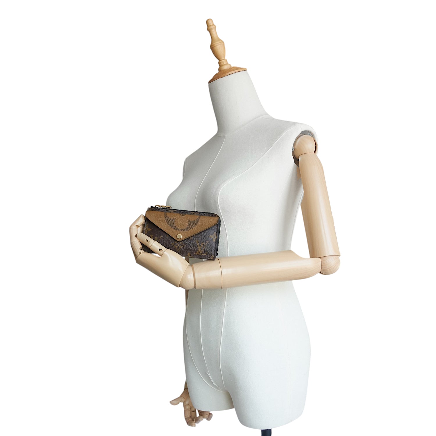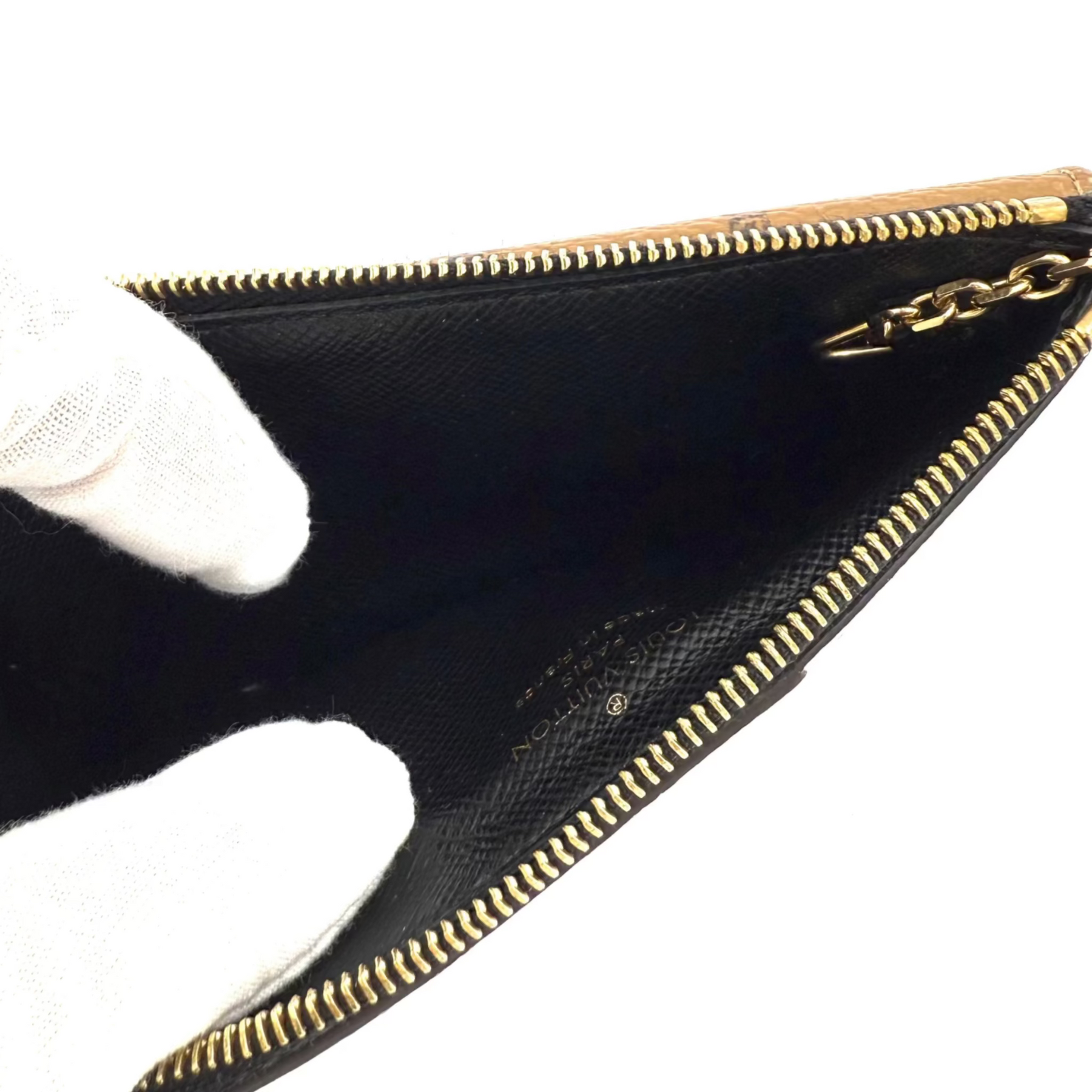 Three luxe materials—Monogram canvas, Monogram Reverse canvas, and grained calfskin leather—come together to form a slim wallet that attaches to a bag or belt via the hook and chain inside the zippered pocket.