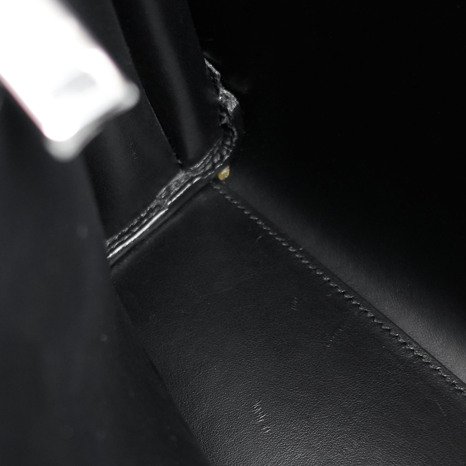 Overall: The exterior leather is in excellent condition with no conspicuous wear. The interior leather has several light scratches and a small blob of manufacturer's glue near one of the bottom corners (refer to photo). The hardware remains shiny and the protective feet still have their peelable plastic.