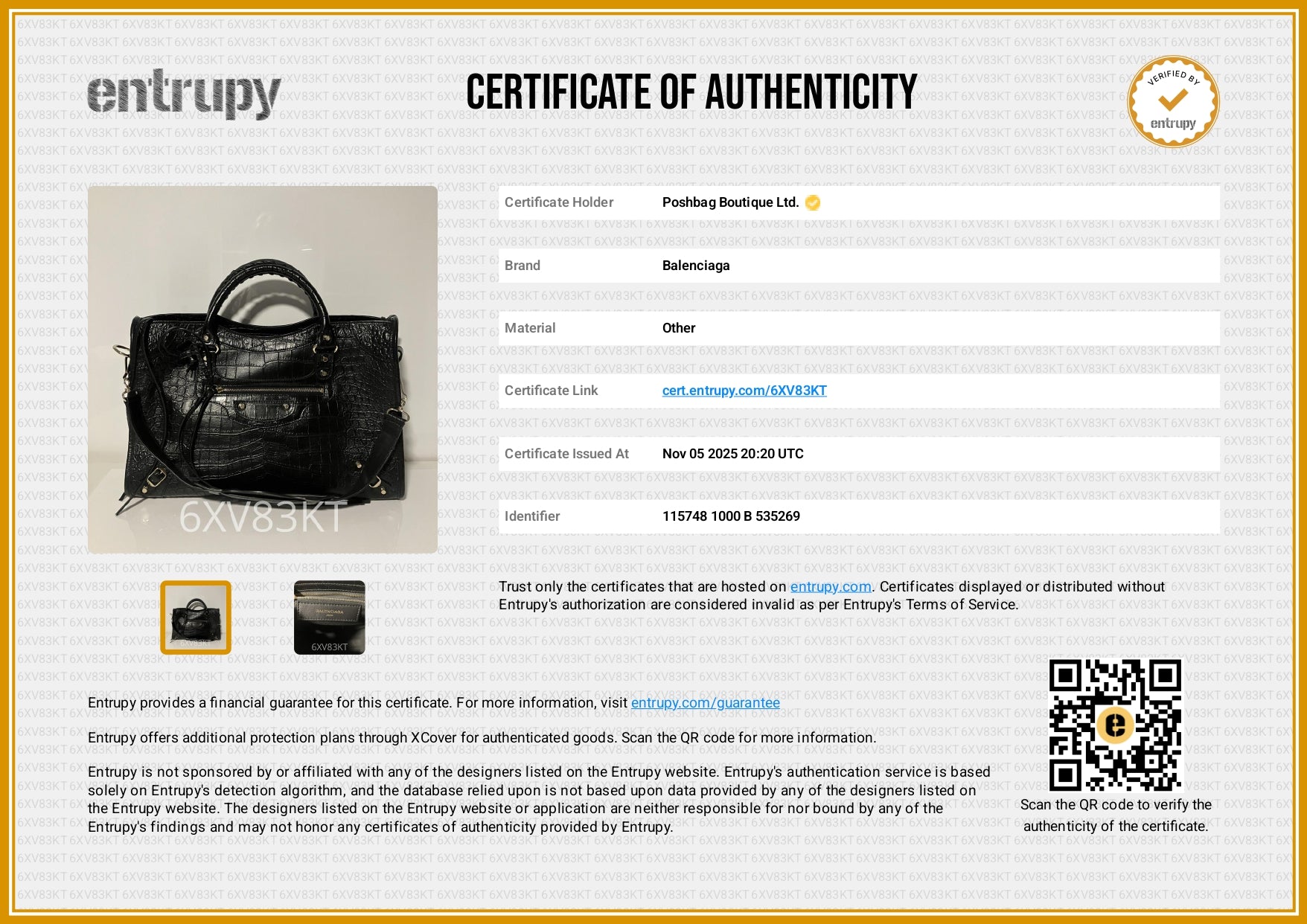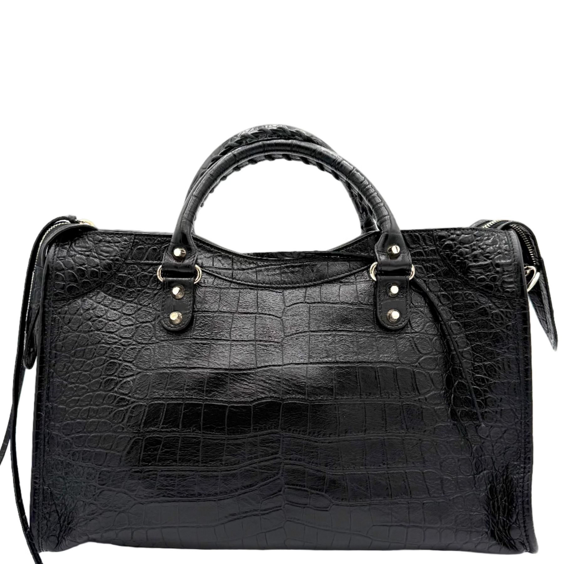 A classically designed, Italian-made handbag in croc-embossed agneau lambskin leather features trailing zipper pulls, whipstitched top handles, and an optional strap for easy shoulder carry.