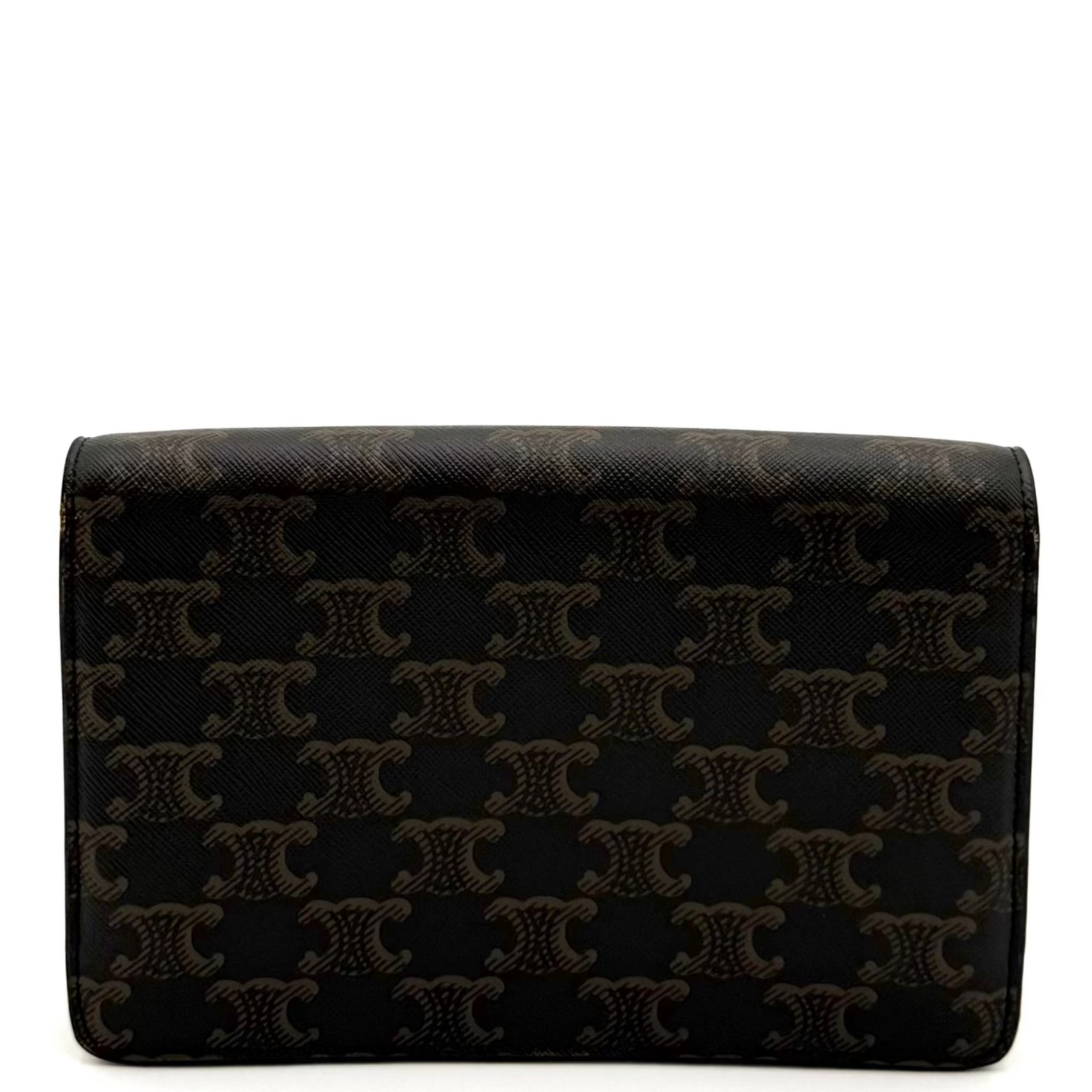 Triomphe coated canvas shapes a slim bag that can go from crossbody to clutch in an instant thanks to a removable chain-and-canvas strap.