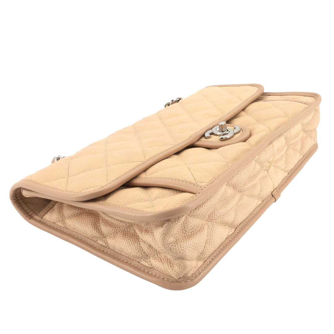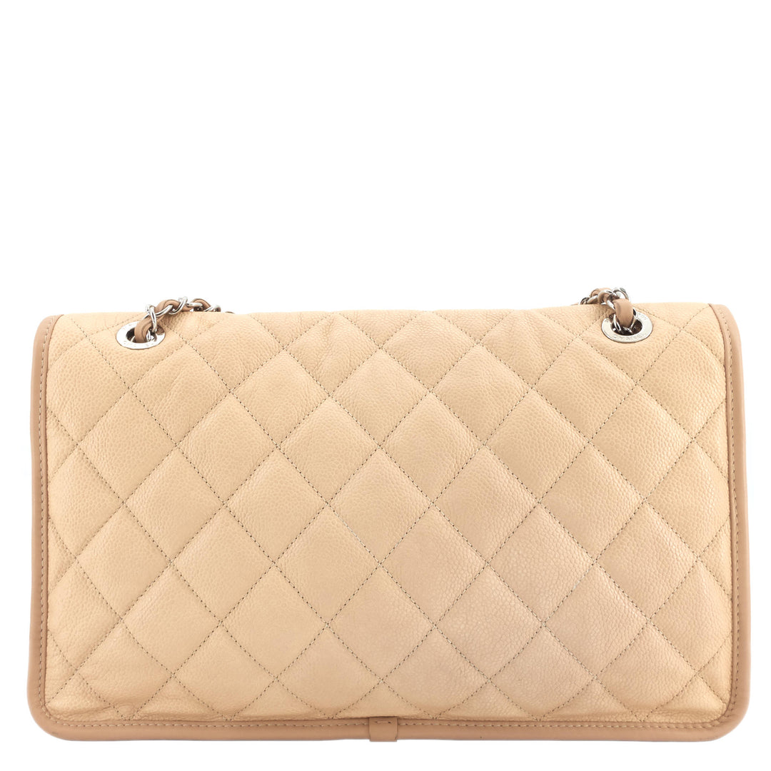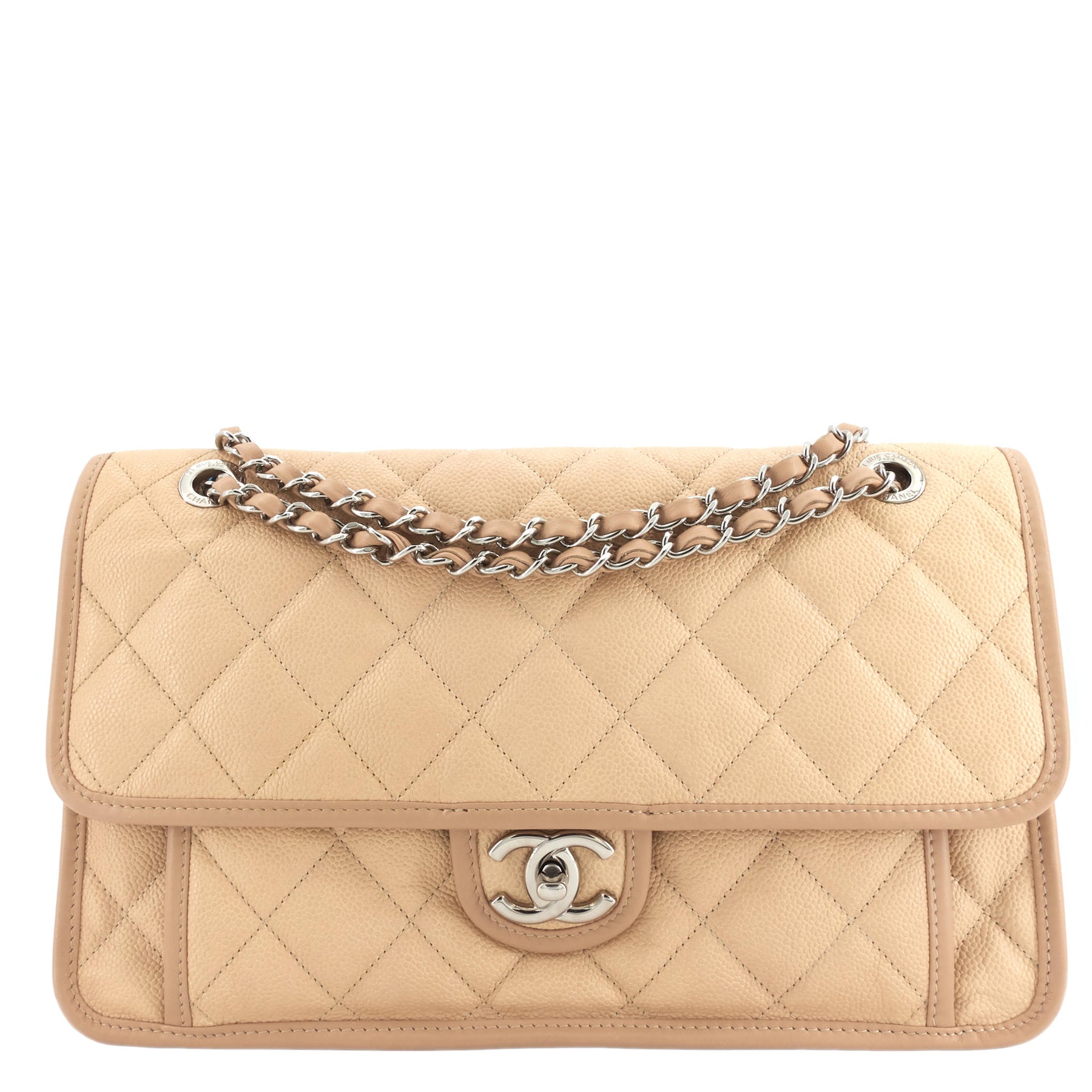 A Chanel Flap Bag in caviar leather. The Flap Bag has a storied history: it was first debuted by Gabrielle “Coco” Chanel in the '50s and then later re-envisioned by Karl Lagerfeld in the '80s.