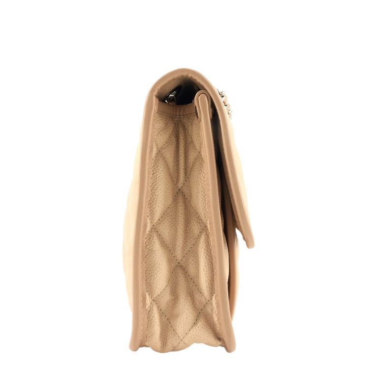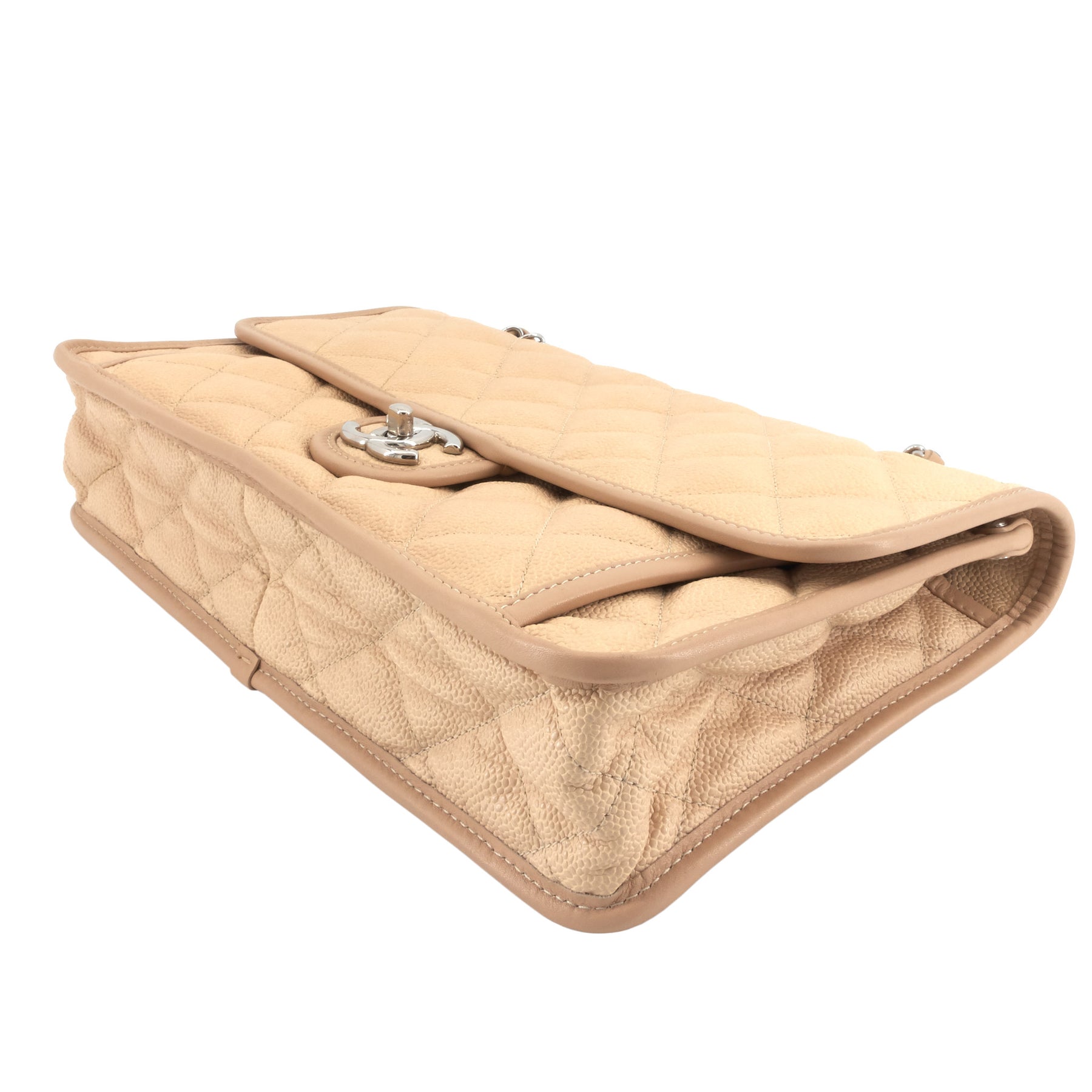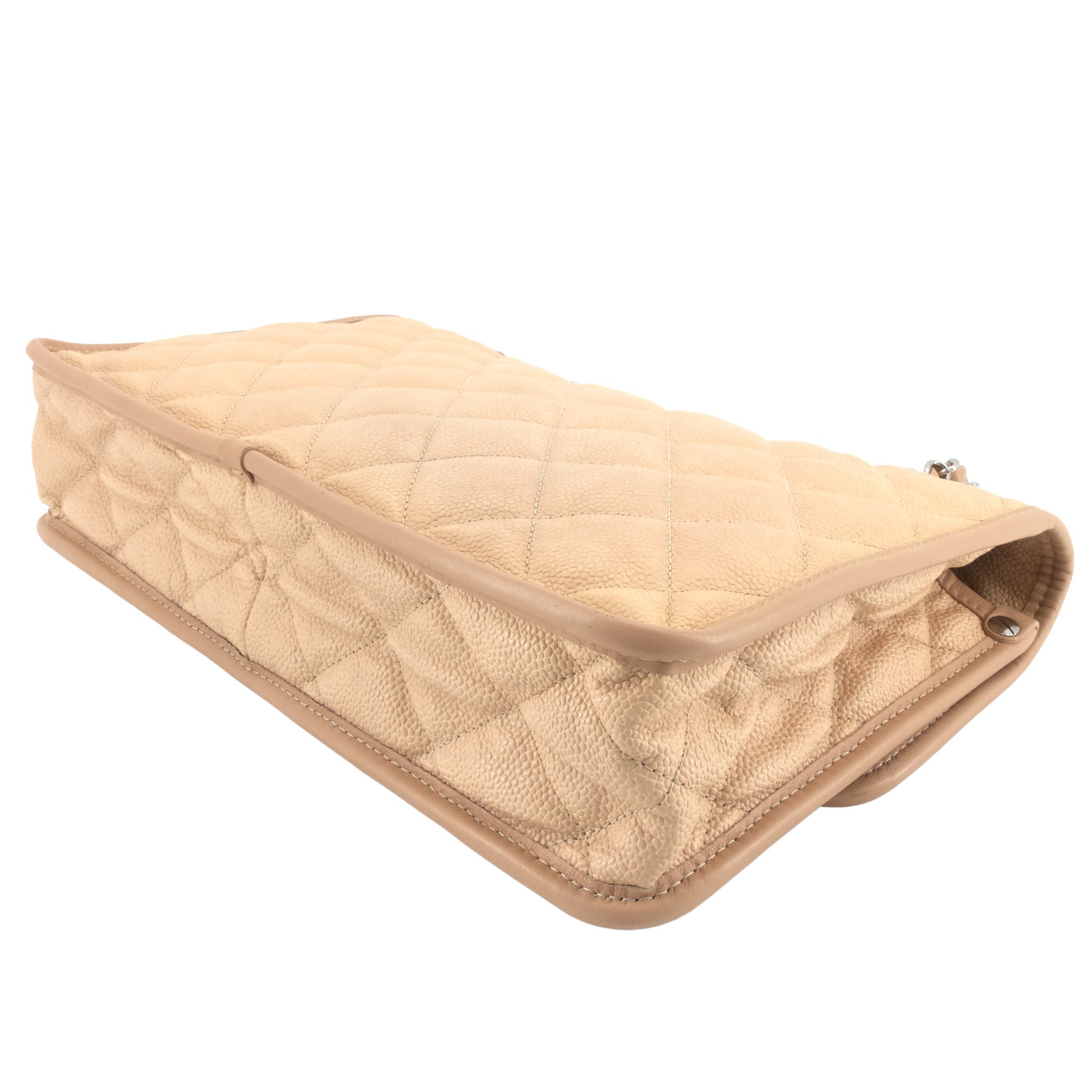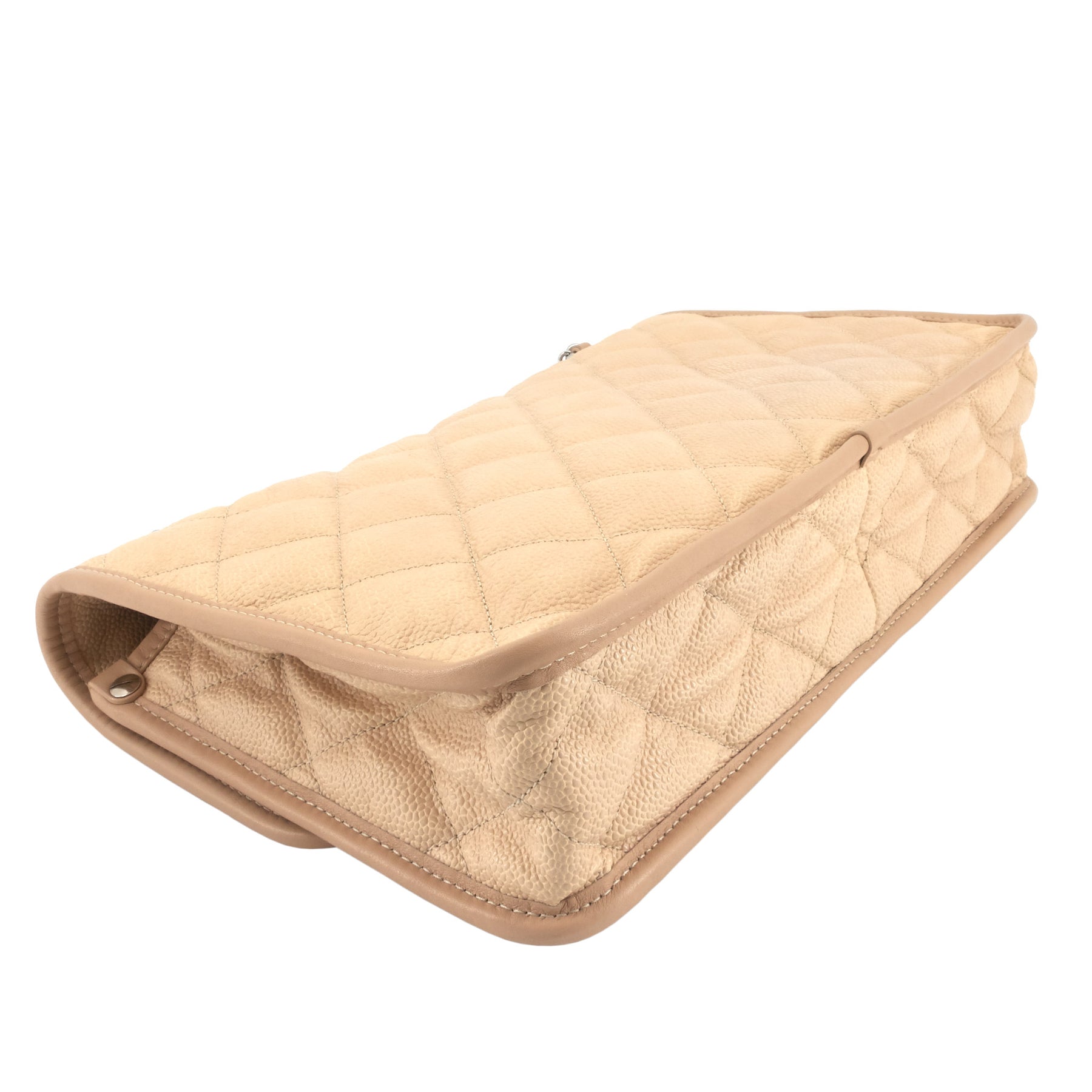 A Chanel Flap Bag in caviar leather. The Flap Bag has a storied history: it was first debuted by Gabrielle “Coco” Chanel in the '50s and then later re-envisioned by Karl Lagerfeld in the '80s.