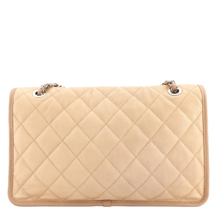 The Flap Bag comes in many different styles. The most common materials are calfskin, lambskin and caviar, although it is available in more exotic leathers such as lizard and ostrich. The most common sizes are Mini, Small, Medium, Jumbo and Maxi. Lagerfeld's design—to which this particular bag belongs—features a leather-woven chain strap and the Double-C turnlock closure, while Coco's original design has a chain-link strap and the iconic Mademoiselle lock.