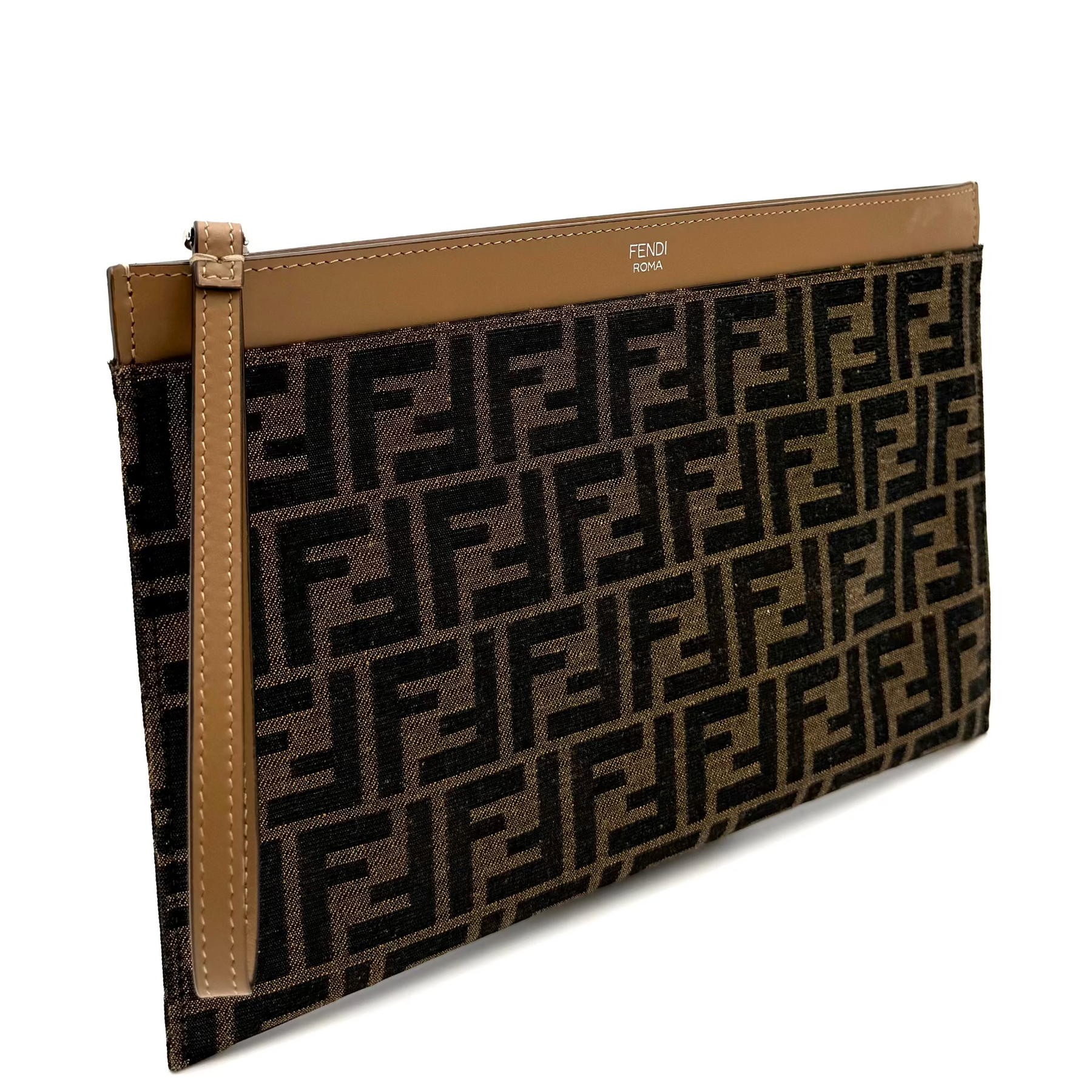 Made from brown and tobacco jacquard patterned with Fendi's iconic FF logos, this slim pouch is fitted with a wrist strap for easy hands free carrying.
