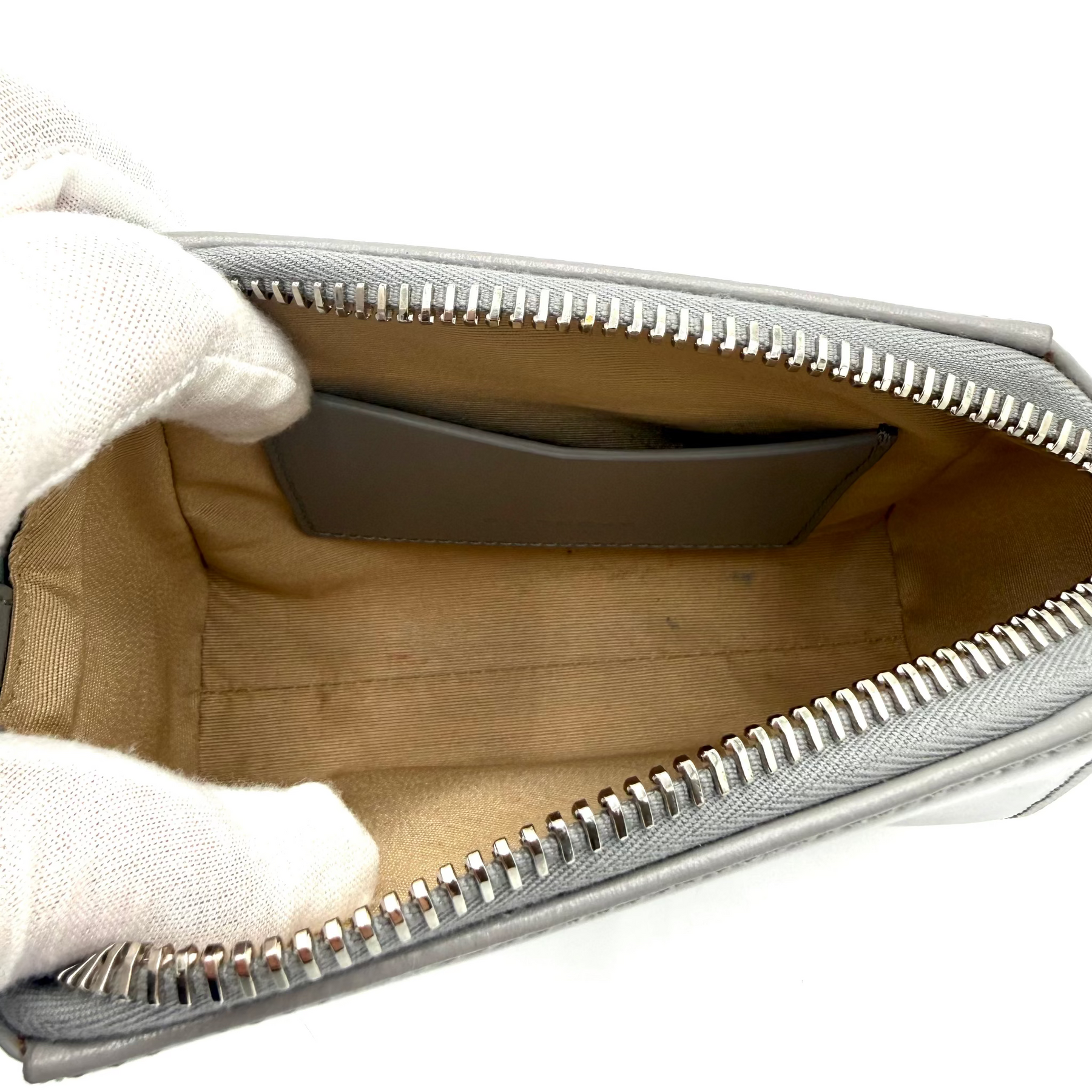 Overall: The exterior leather shows a few light scratches and minor scuff marks, but it remains clean overall and free from significant wear. The interior textile has the most visible wear, with several noticeable stains concentrated at the bottom of the bag. The metal hardware remains bright and polished, with no signs of tarnishing or wear.