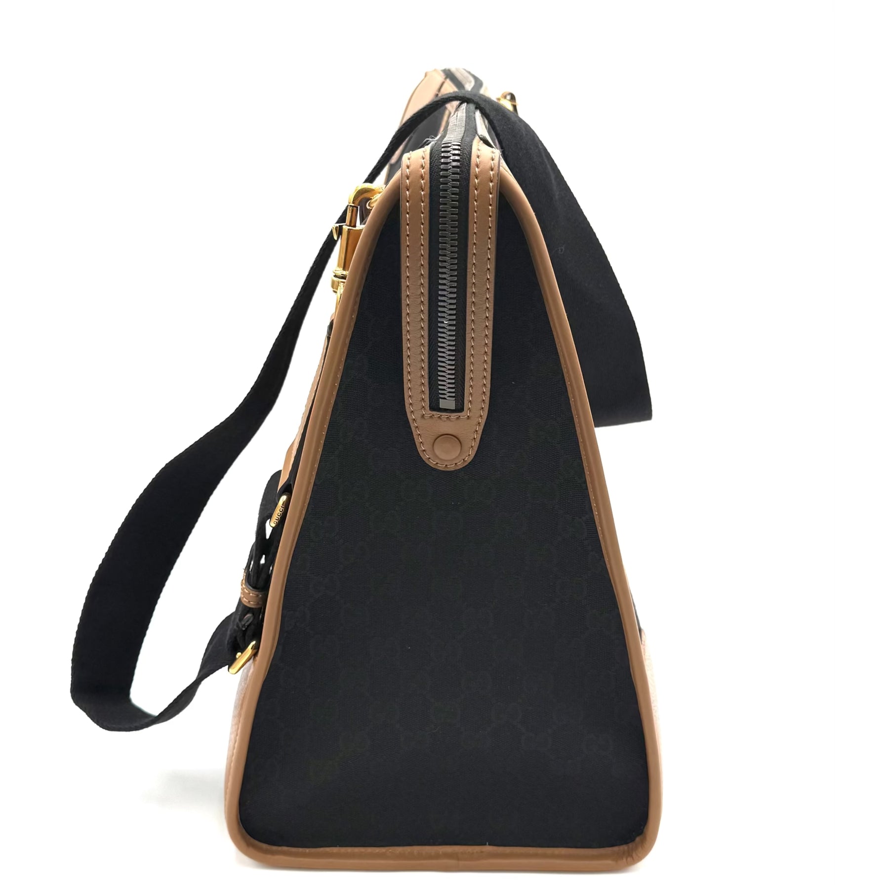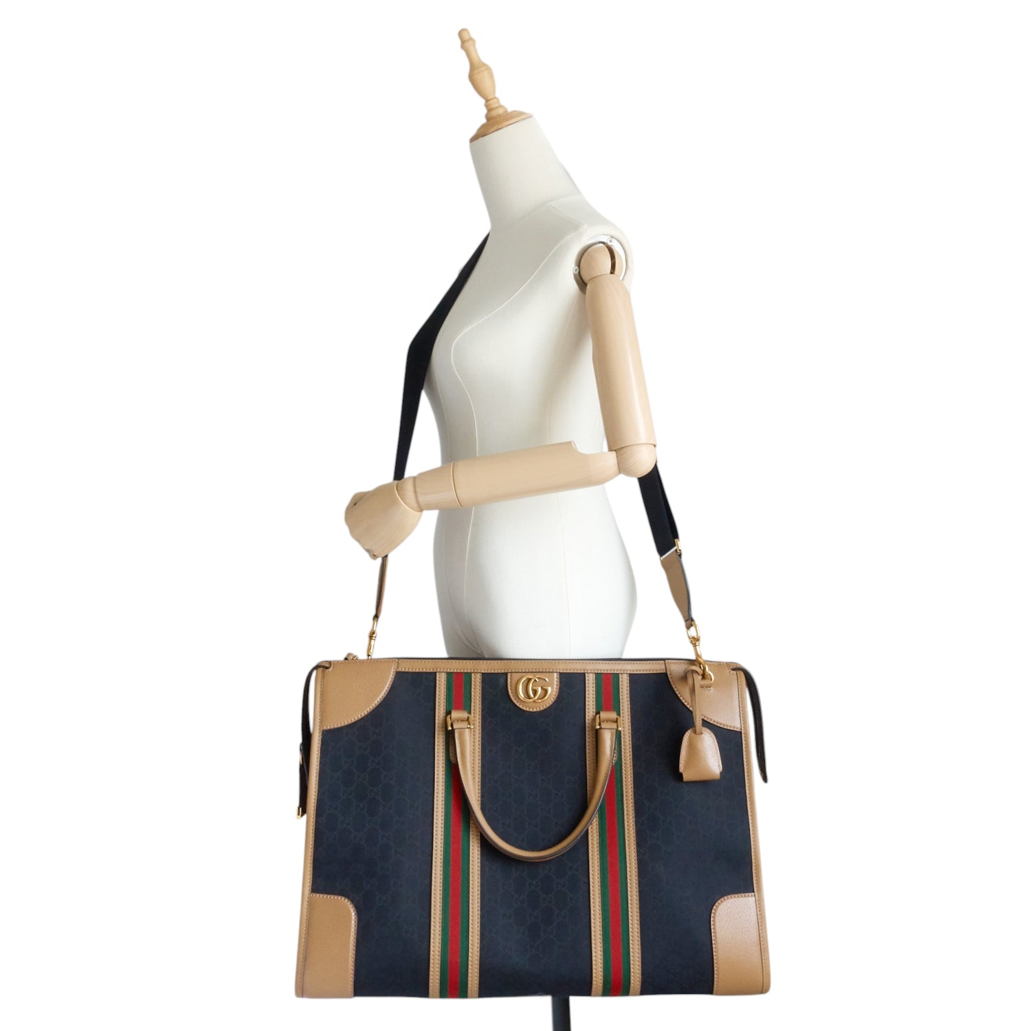Spacious and structured, this this extra-large Gucci duffle is made from GG canvas with luxe leather trim. Green-and-red web stripes enhance the signature look, while an optional strap lets you sling it over your shoulder for hands-free wear.