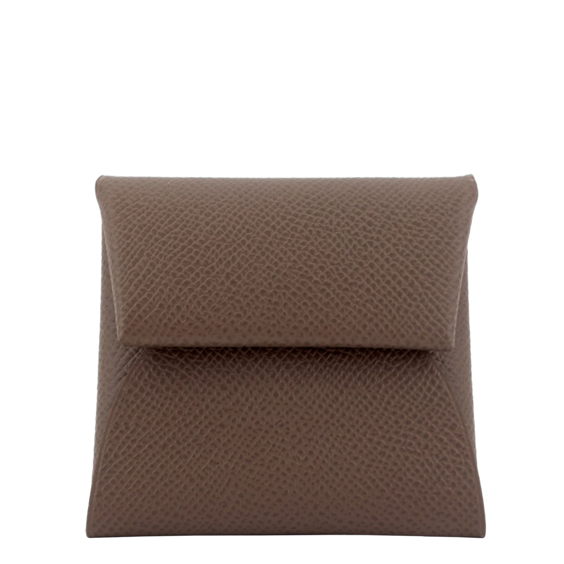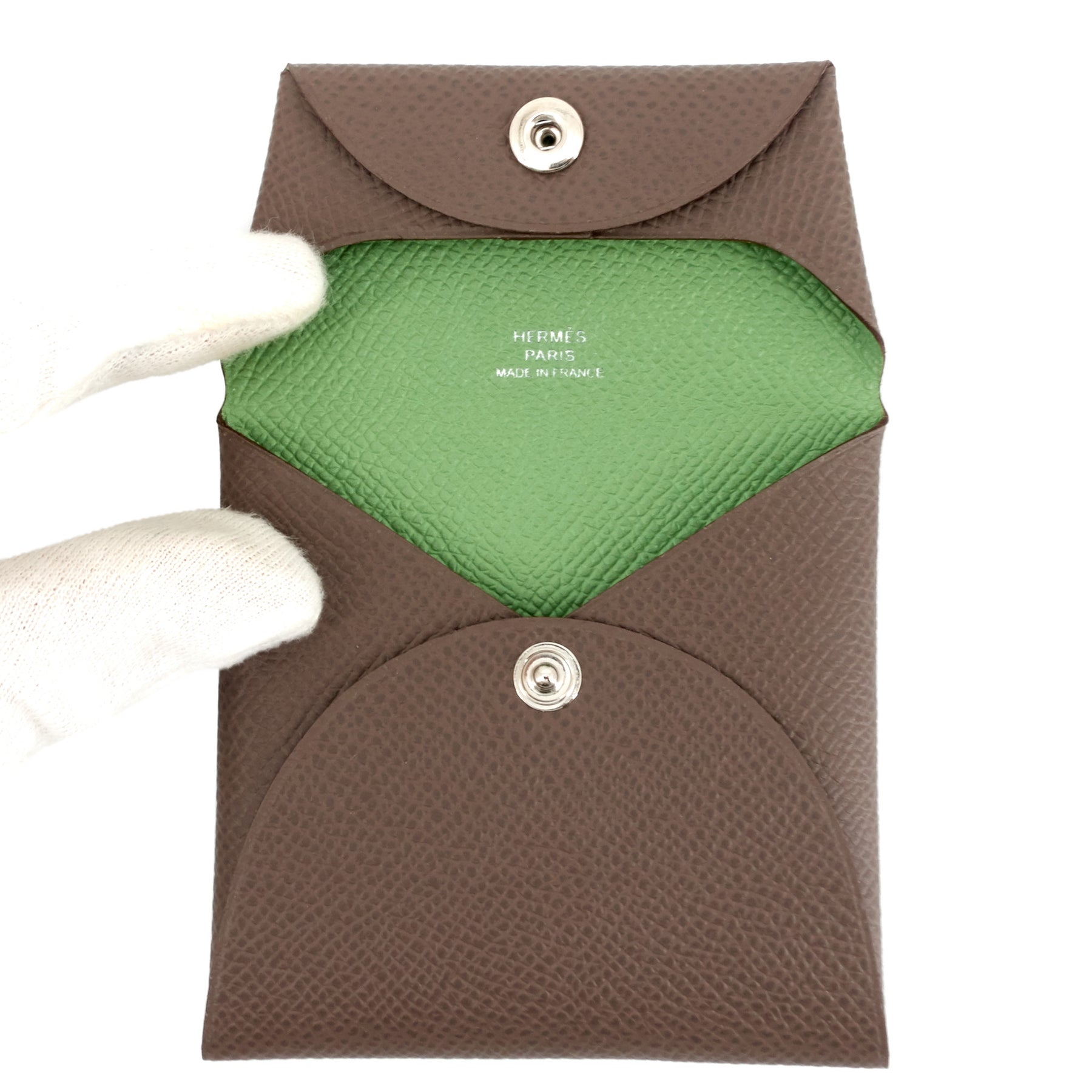Cut entirely from Epsom leather, this simply designed case is ideal for storing your spare change. The exterior is a pewter gray color known as Gris Etain, while the vibrant interior is a lively shade of green known as Vert Criquet. Its fine, regular grain is obtained through machine-printing.