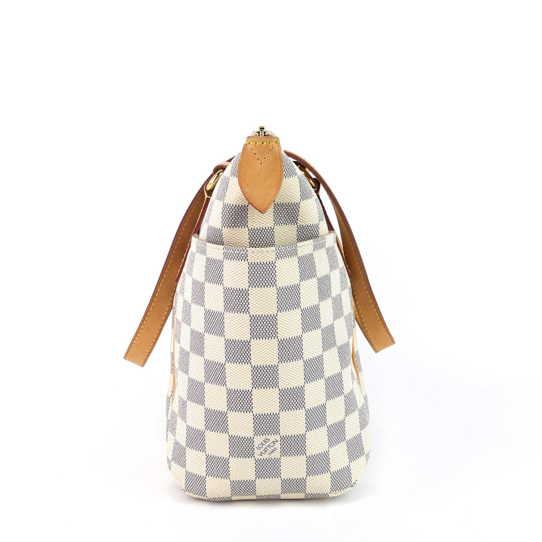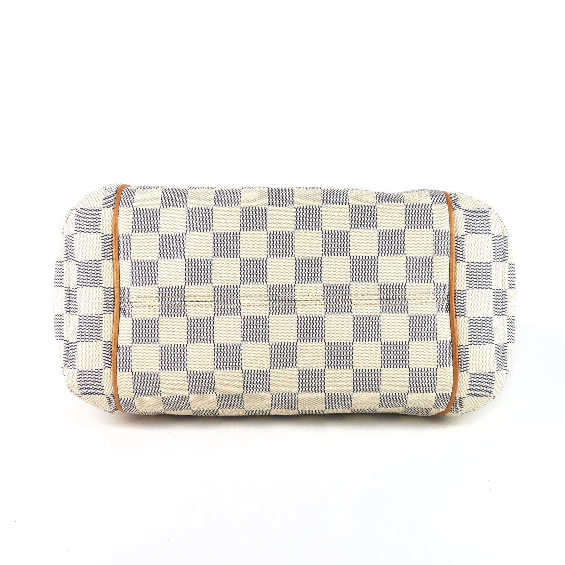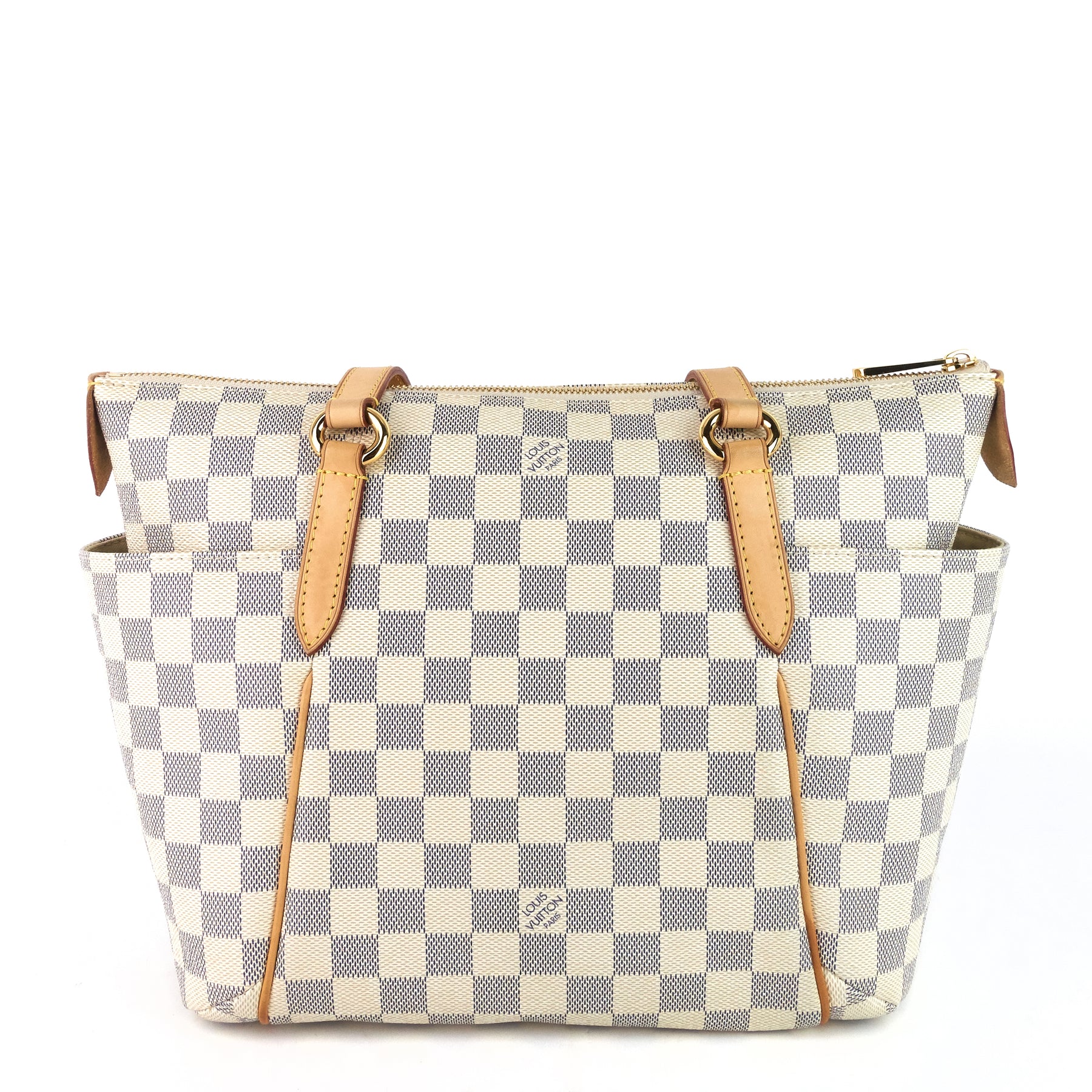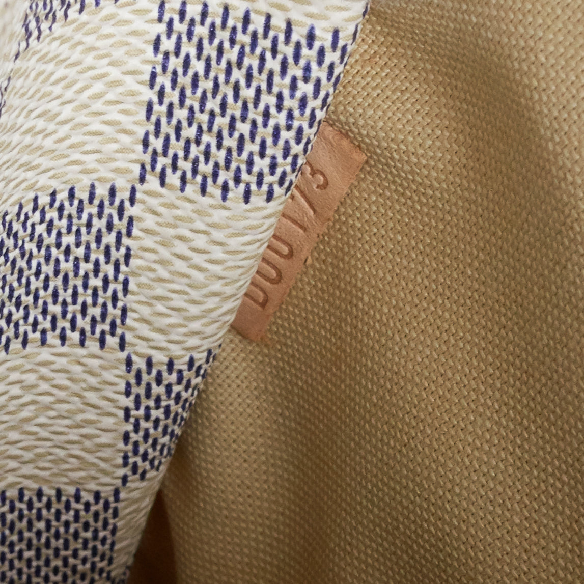 This authentic Louis Vuitton Totally PM bag is made of Damier Azur canvas with natural cowhide leather trim and gold-tone hardware. Prized for its light weight, it opens to a beige textile interior. Two exterior pockets offer additional space for your belongings. It can be carried by hand, on the elbow, or over the shoulder thanks to its slim cowhide leather straps.