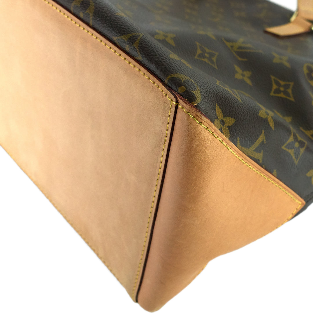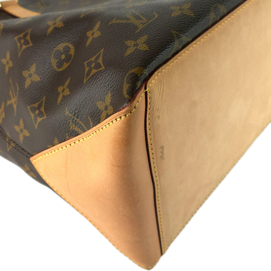 Overall: Both the exterior canvas and interior lining are in excellent condition, showing no noticeable signs of wear. The cowhide leather shows a patina along with scratches and a few stains. The glazing along the sides of one of the straps is frayed. The leather on the bottom of the bag has a lighter shade of patina than the rest of the trim.