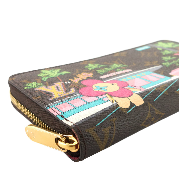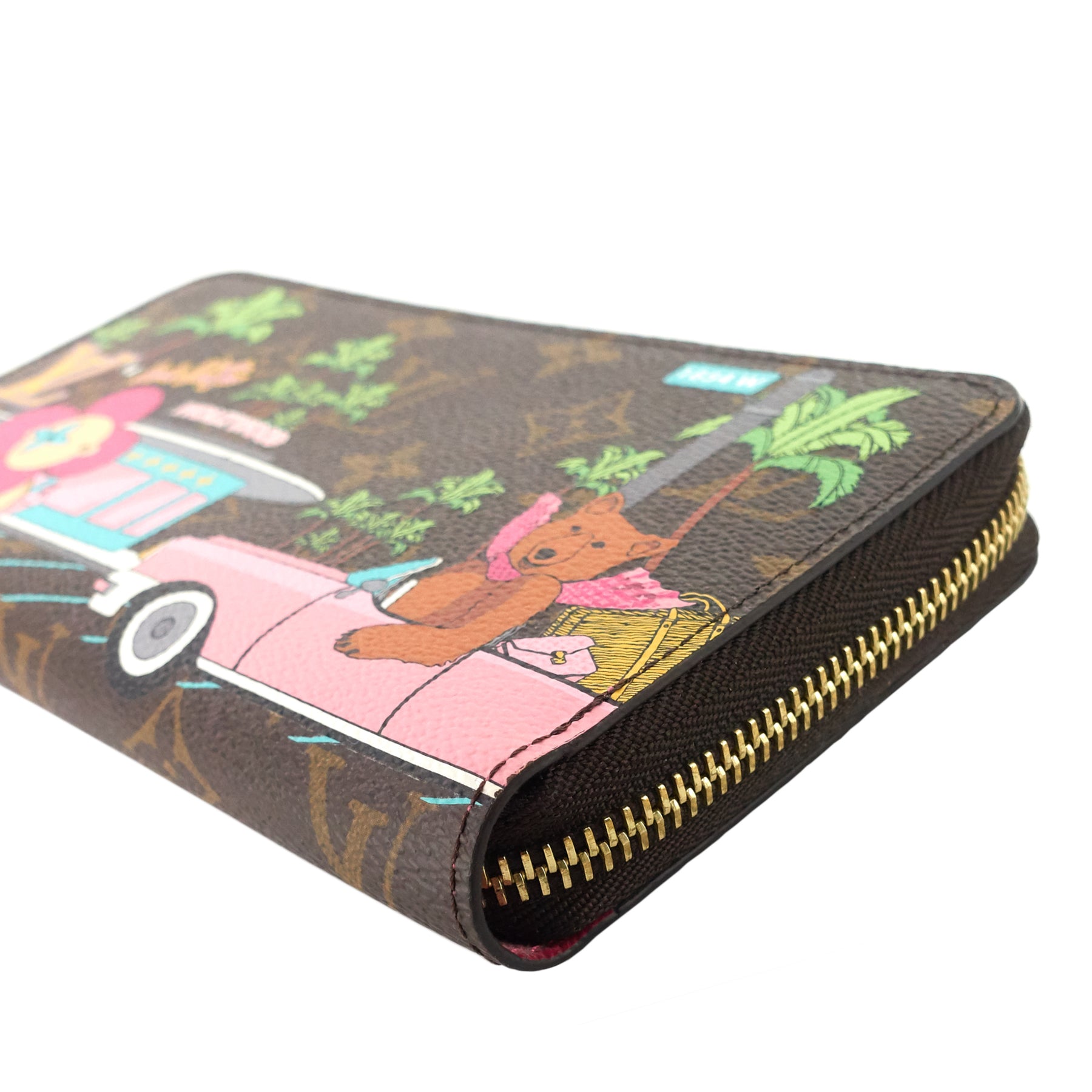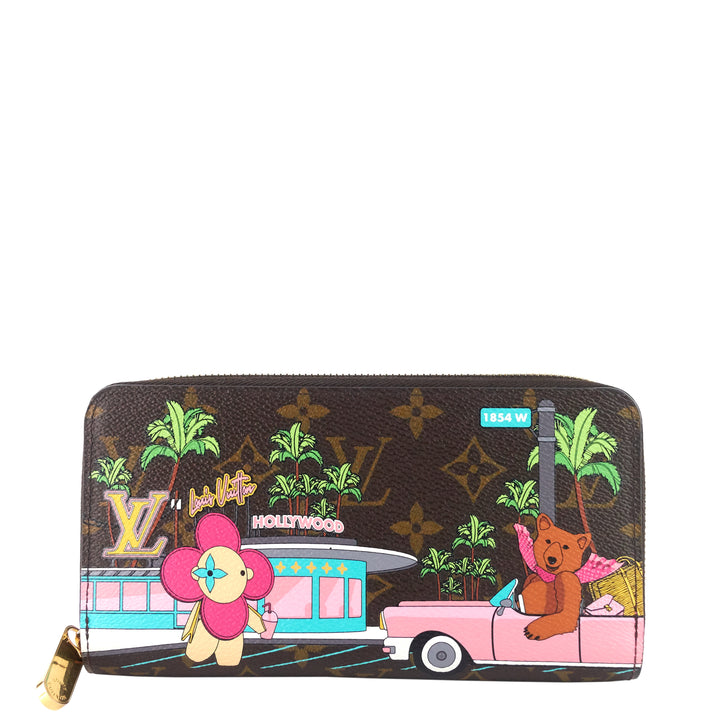 Carry your cards and cash in style with this sleek wallet made from monogrammed canvas. It features an illustration of House mascot Vivienne's visit to Hollywood, where she watches a bear roll up in a classic car outside the LV Diner. Marketed as a 'small bag in a wallet,' it is large enough to serve as a clutch.