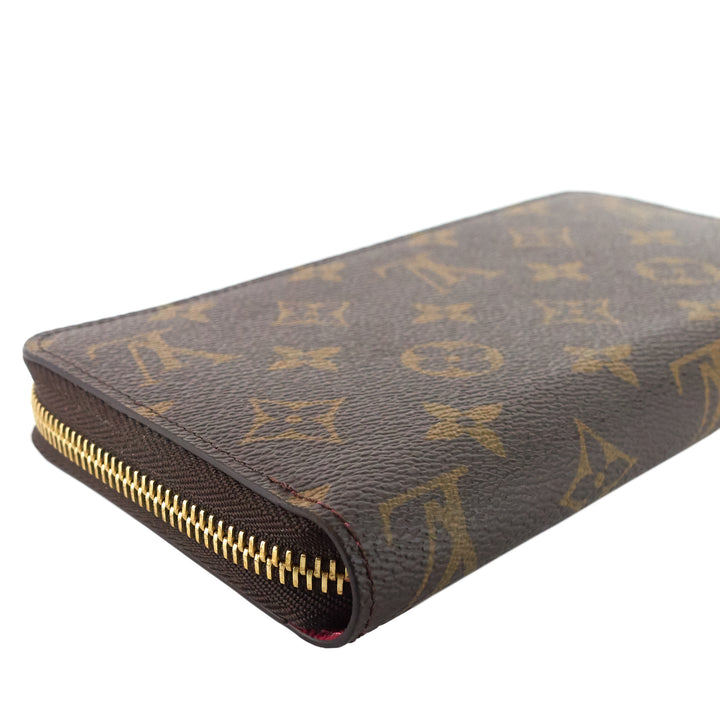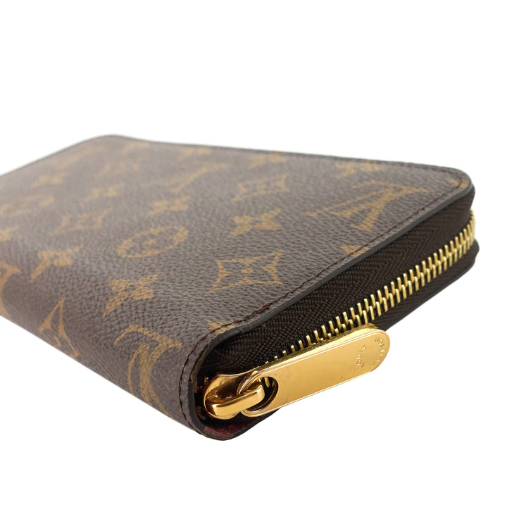 Overall: The outer canvas looks like-new, except for one spot where the glazing along the side is peeling near a bend in the wallet. The inner leather is also like-new, with only some faint darkening (possibly colour transfer) inside the zipped pocket. The hardware maintains its colour with no visible wear.