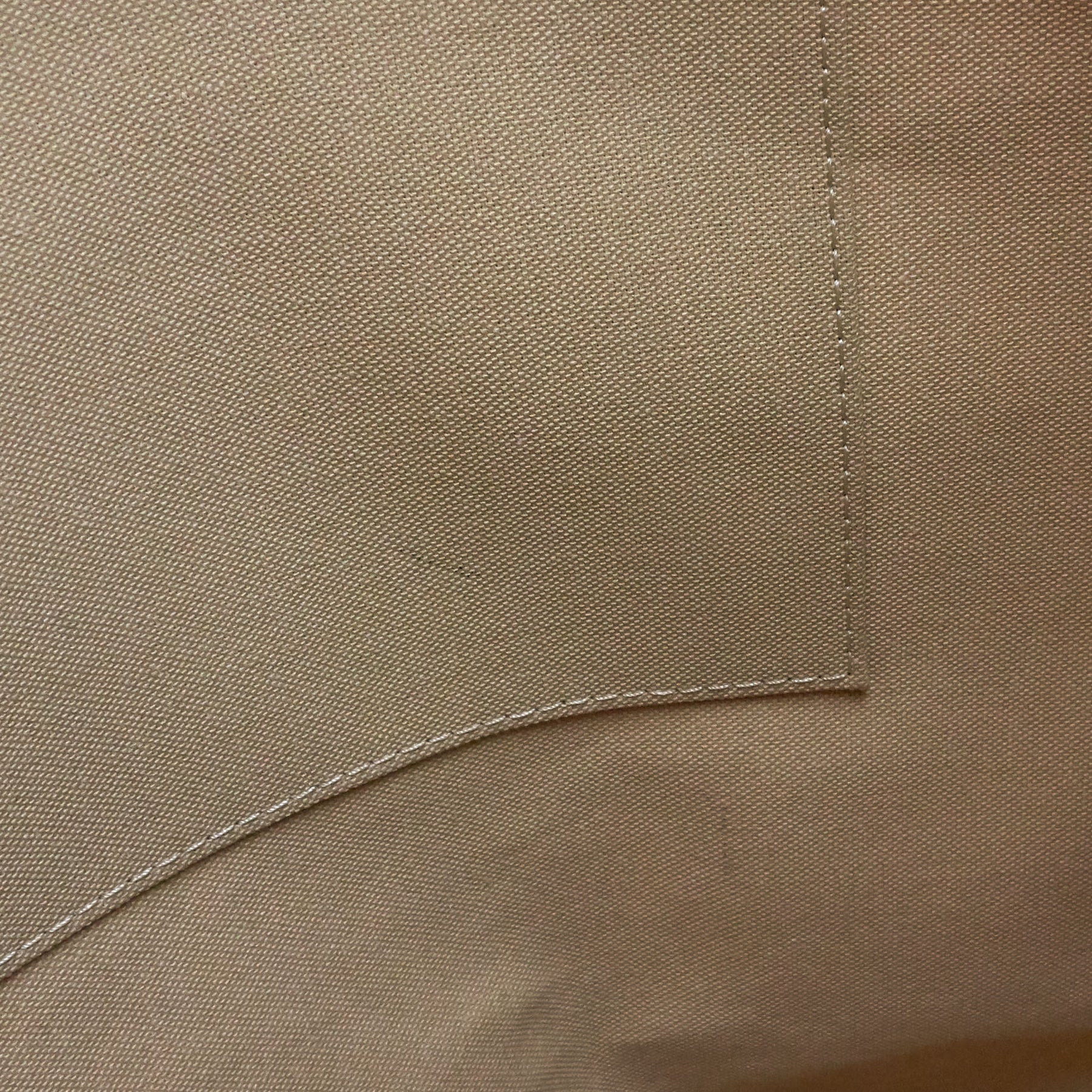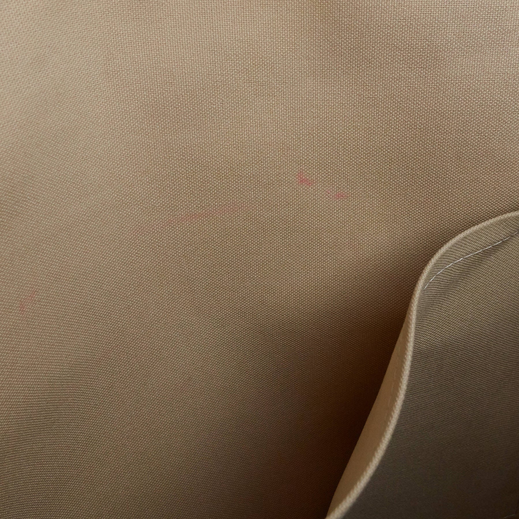 Overall: The exterior canvas has no noticeable signs of wear. The interior lining is clean but shows faint staining throughout. The hardware shows signs of age, with fading and discolouring to the zipper. The cowhide leather has a well-developed patina, with scuffing to the piping and faint water stains to the straps.