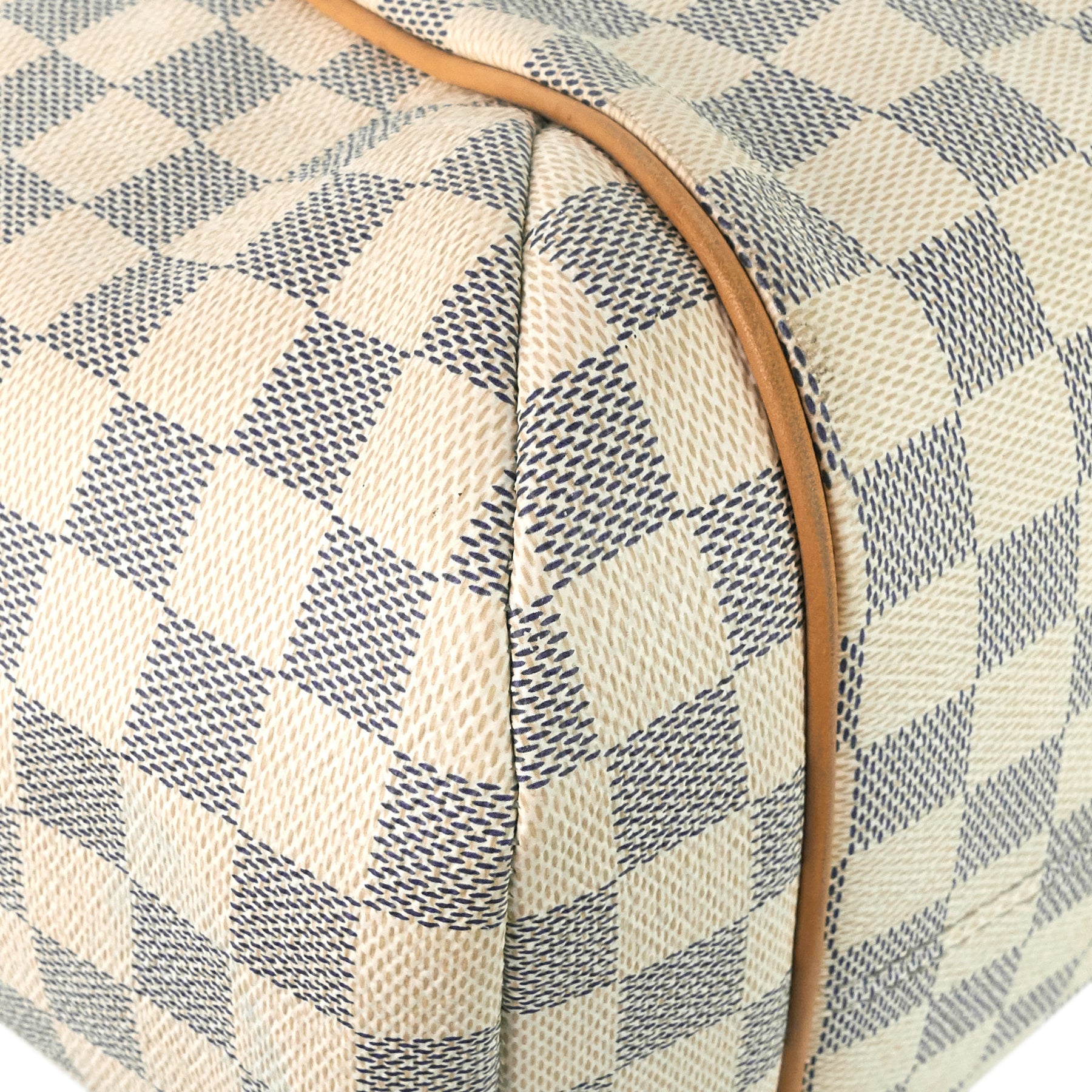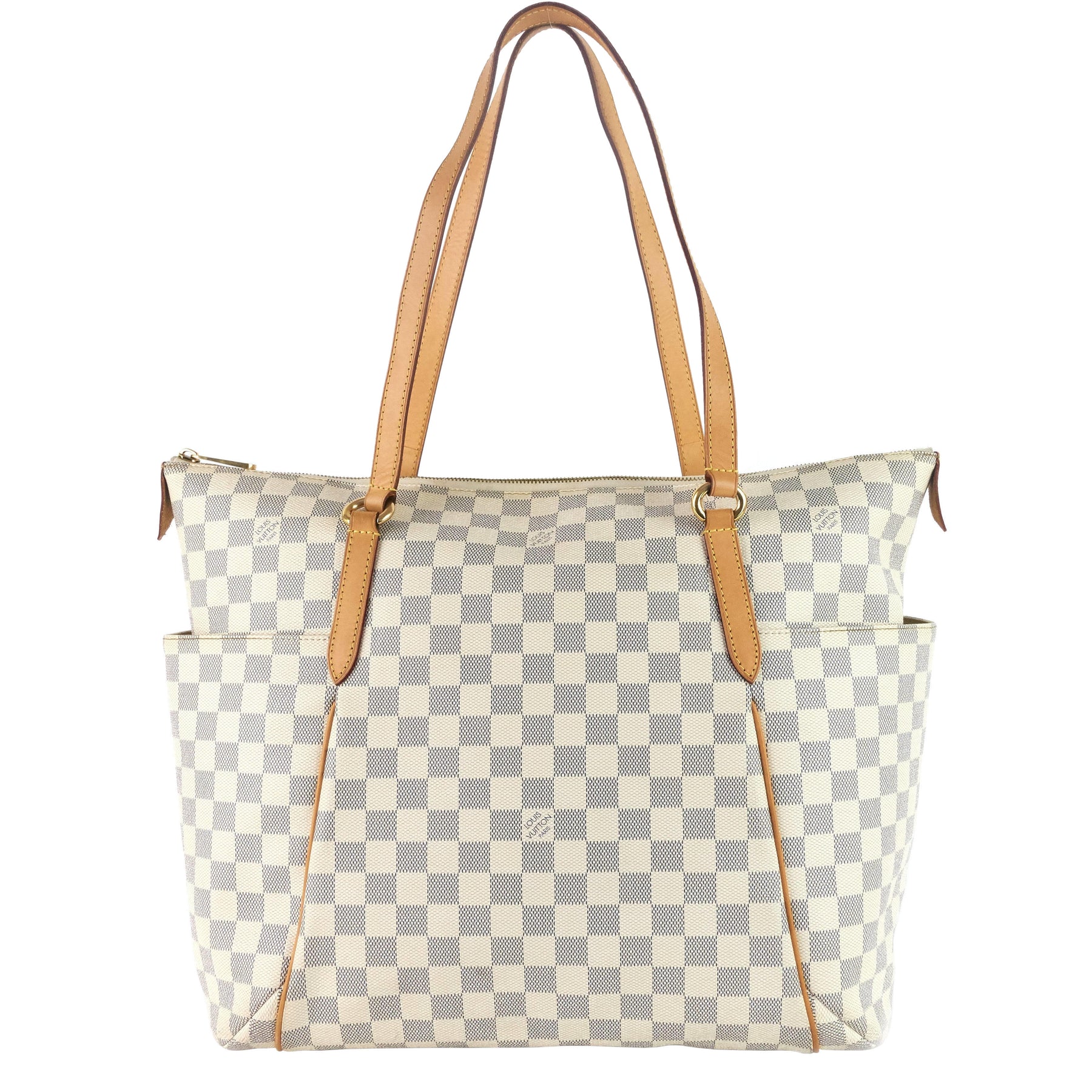 Crafted from Damier Azur coated canvas with natural vachetta cowhide leather trim, this spacious, discontinued tote makes for a chic everyday carryall. A roomy, textile-lined interior easily accommodates the day's essentials, while two exterior side pockets offer places to stash frequently used or on-the-go items.