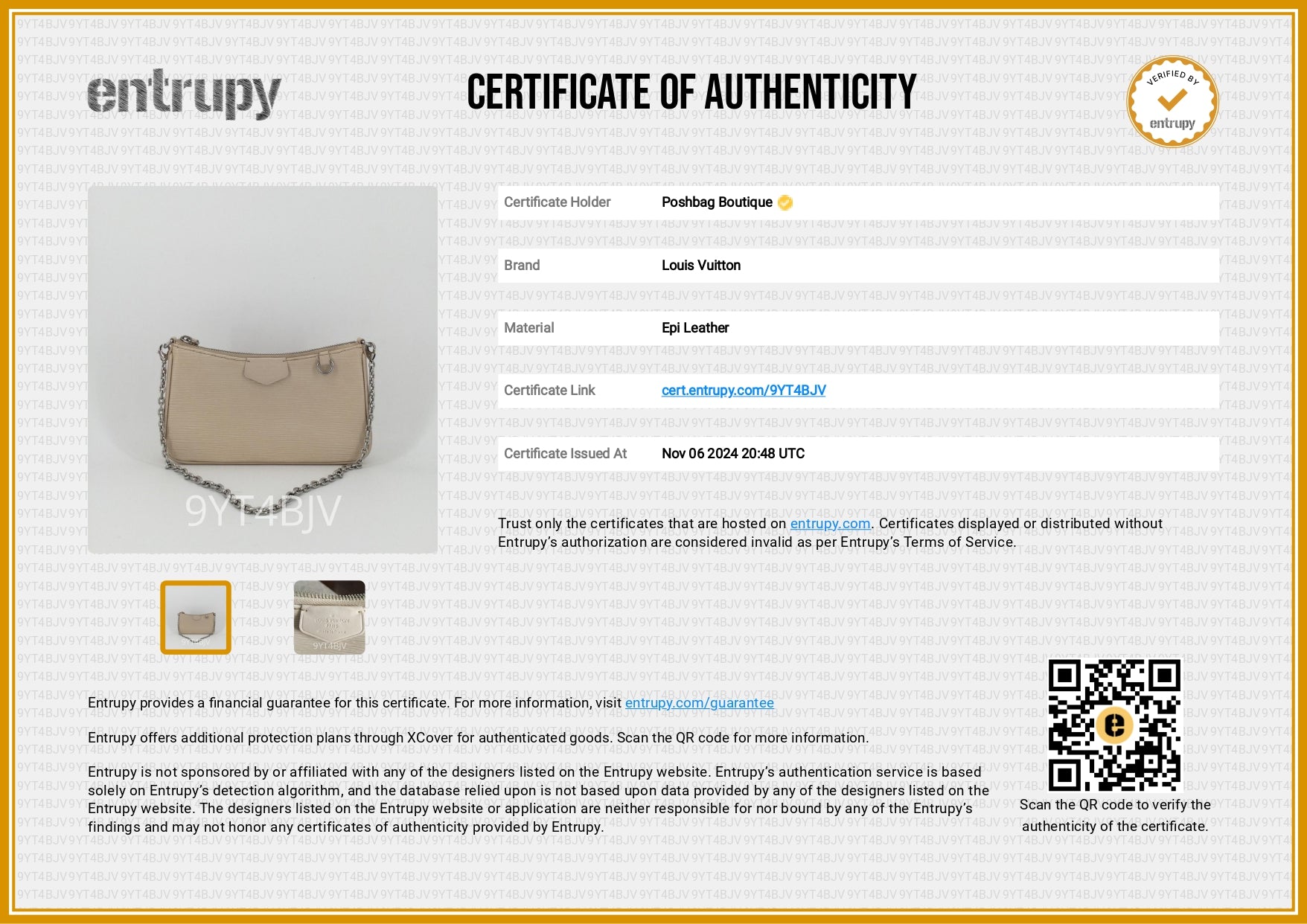 This compact bag, crafted from embossed Epi cowhide leather, is perfect for carrying your phone, keys, and other small essentials. It comes with two interchangeable straps for versatile styling.