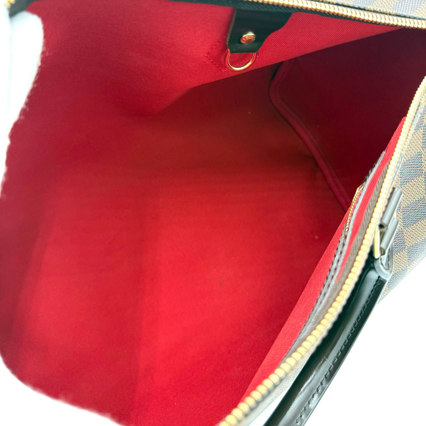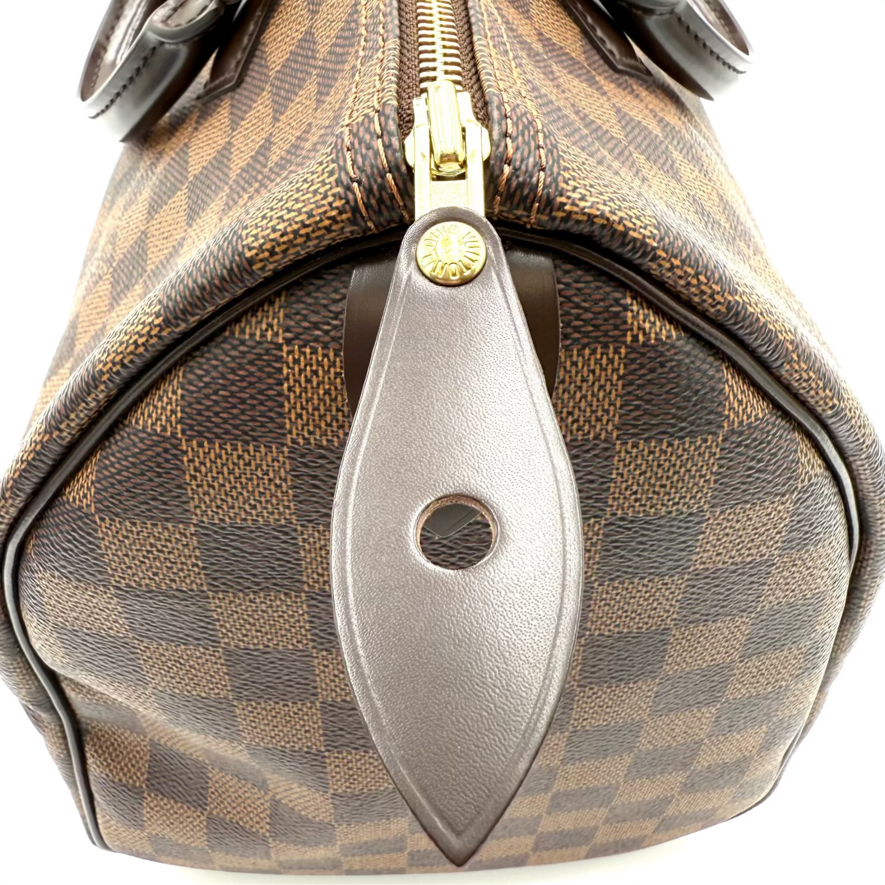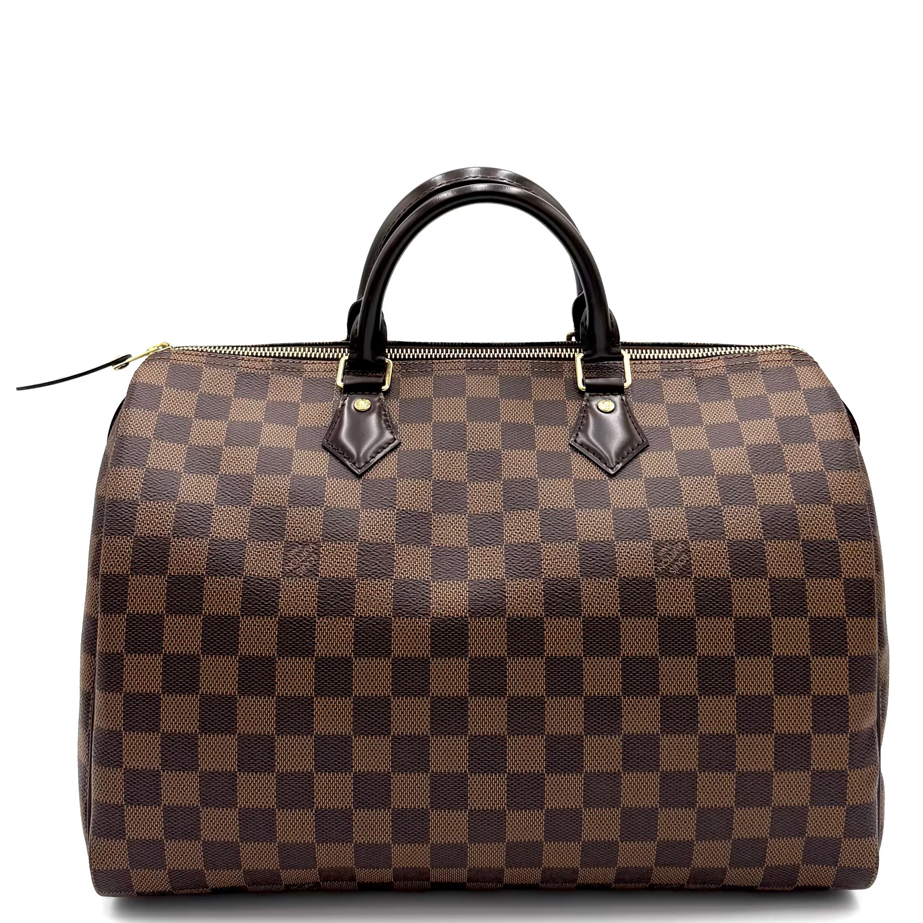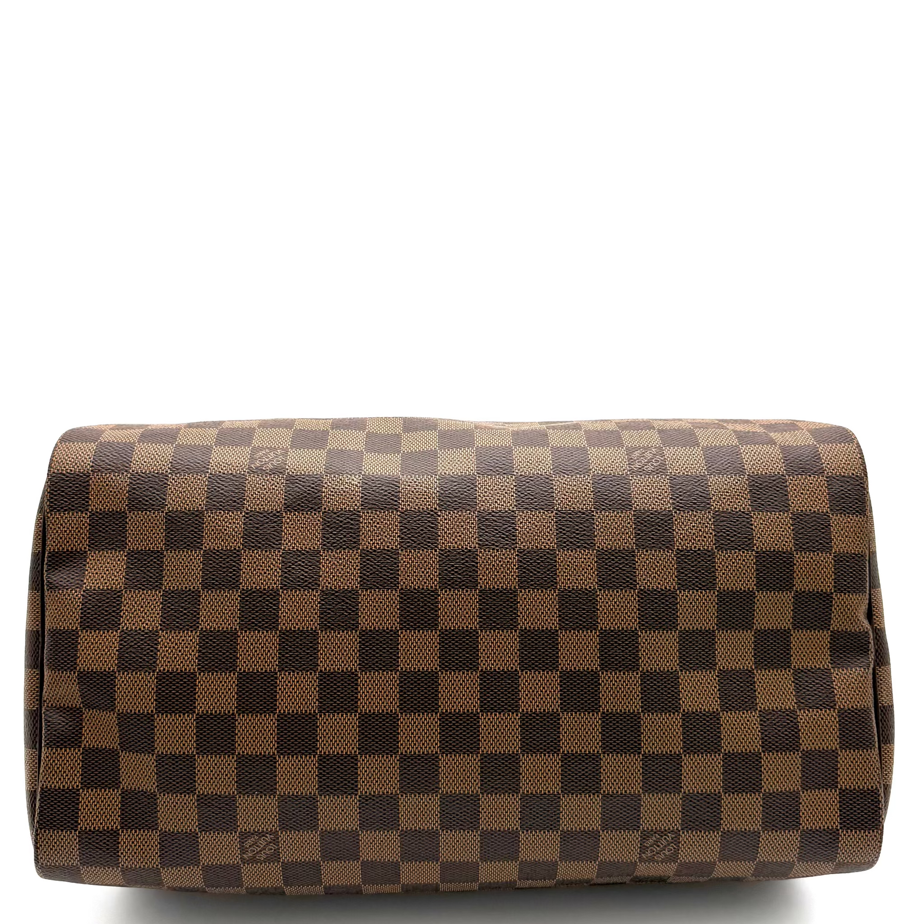 First debuted in the '30s, the Louis Vuitton Speedy has enjoyed lasting popularity thanks to a distinct silhouette reimagined time and again in many different canvases and leathers. This particular style is crafted from Damier Ebene canvas with chocolate brown cowhide leather trim and golden hardware.