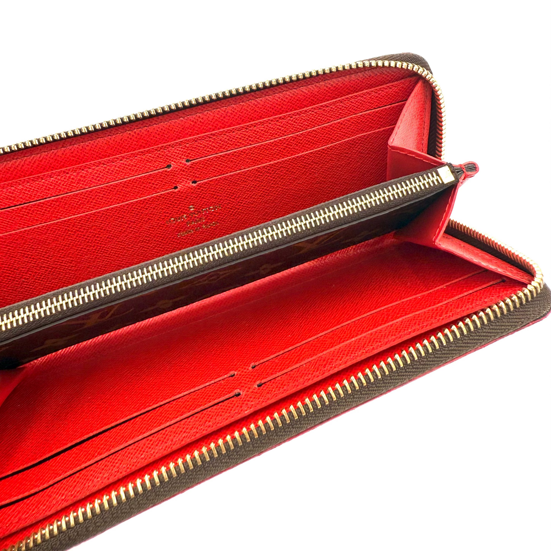 Louis Vuitton monogram full zip wallet with red leather blooming flower charm. Bright red interior with plenty of organizational space. Slight patina on the zipper but otherwise wallet looks barely carried.
