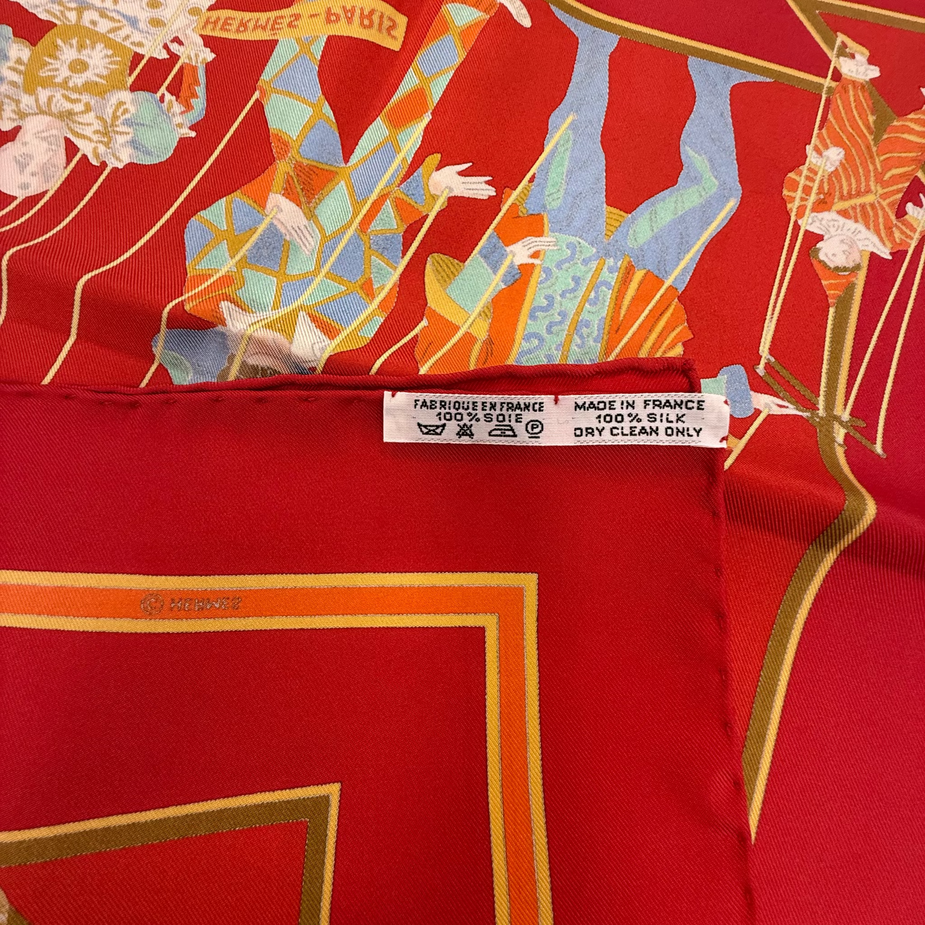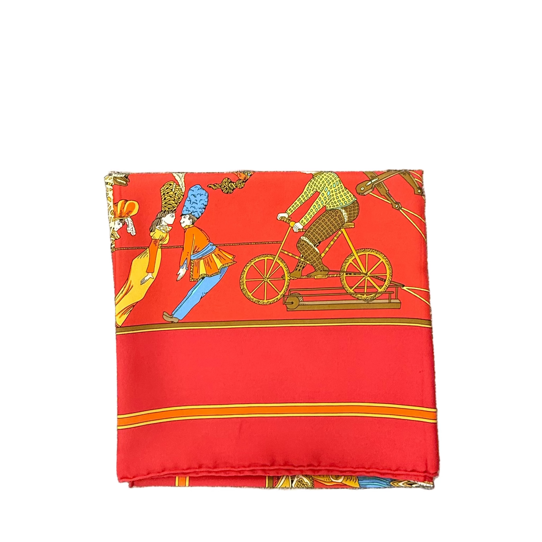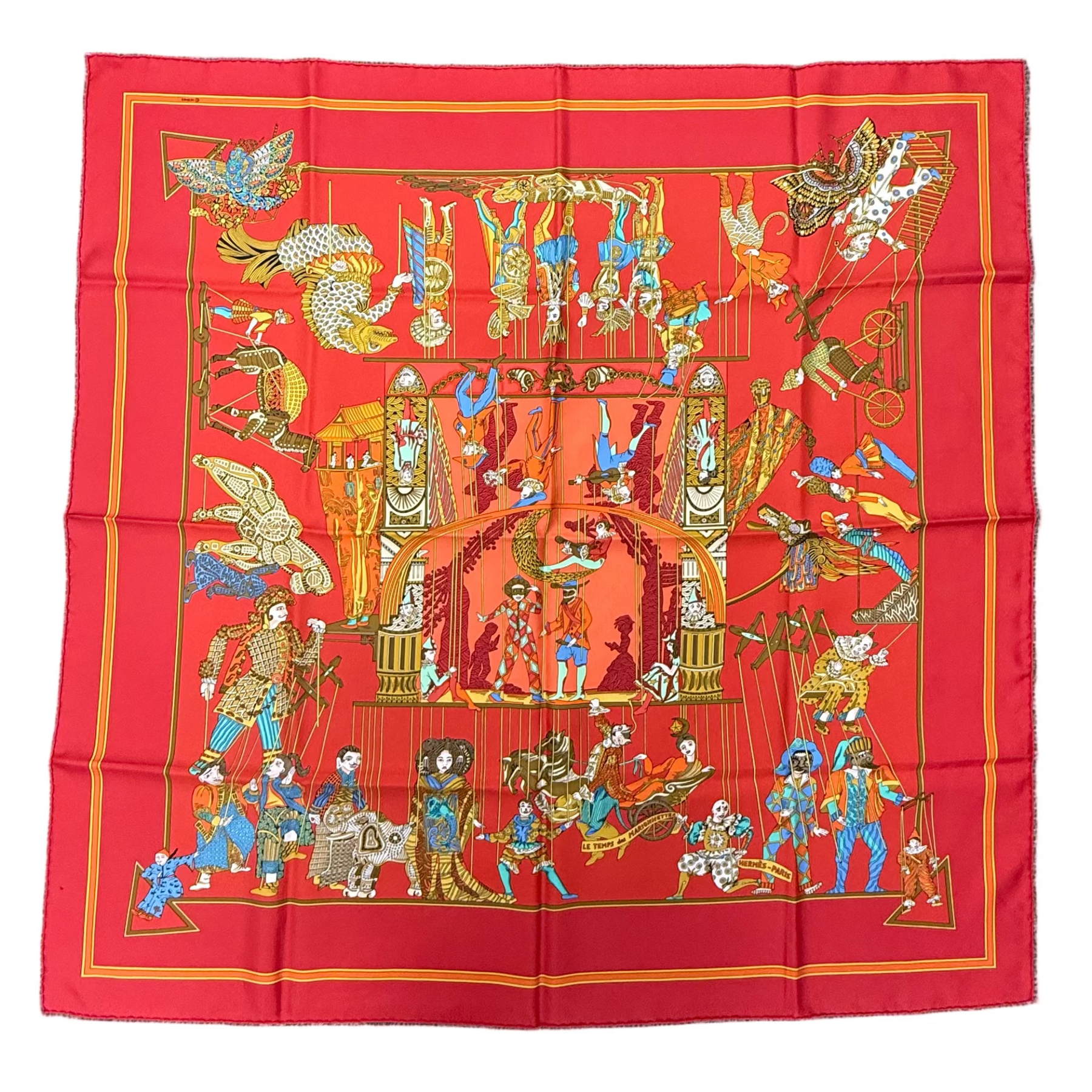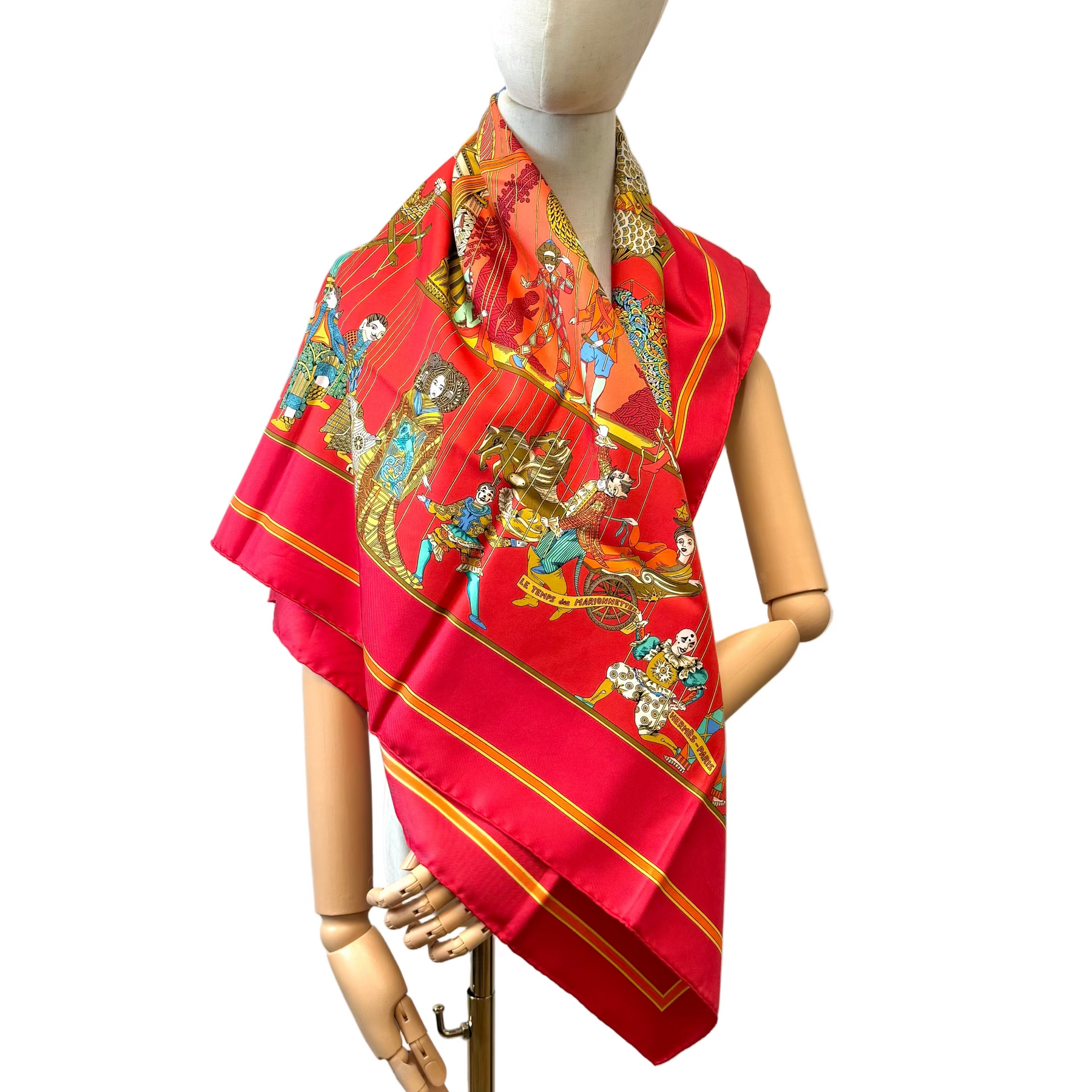 A vibrant celebration of imagination and artistry, the Le Temps des Marionnettes silk scarf by Annie Faivre showcases the playful, theatrical world of marionettes through her signature detailed illustration style. Presented here in a striking red colourway, this carré transforms a classic Hermès motif into a bold, expressive statement piece.