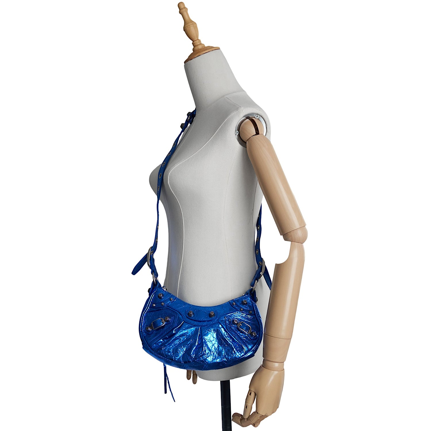 Textured hardware and crinkled metallic blue leather double the signature style of a sleek crossbody bag that easily transitions to a clutch thanks to its removable leather strap.