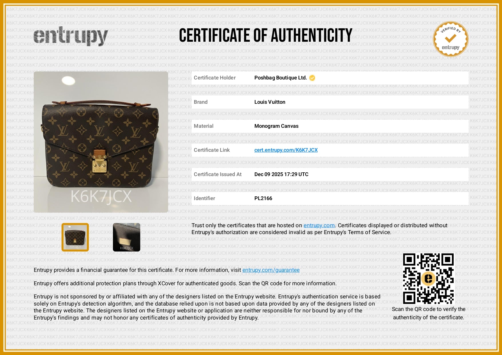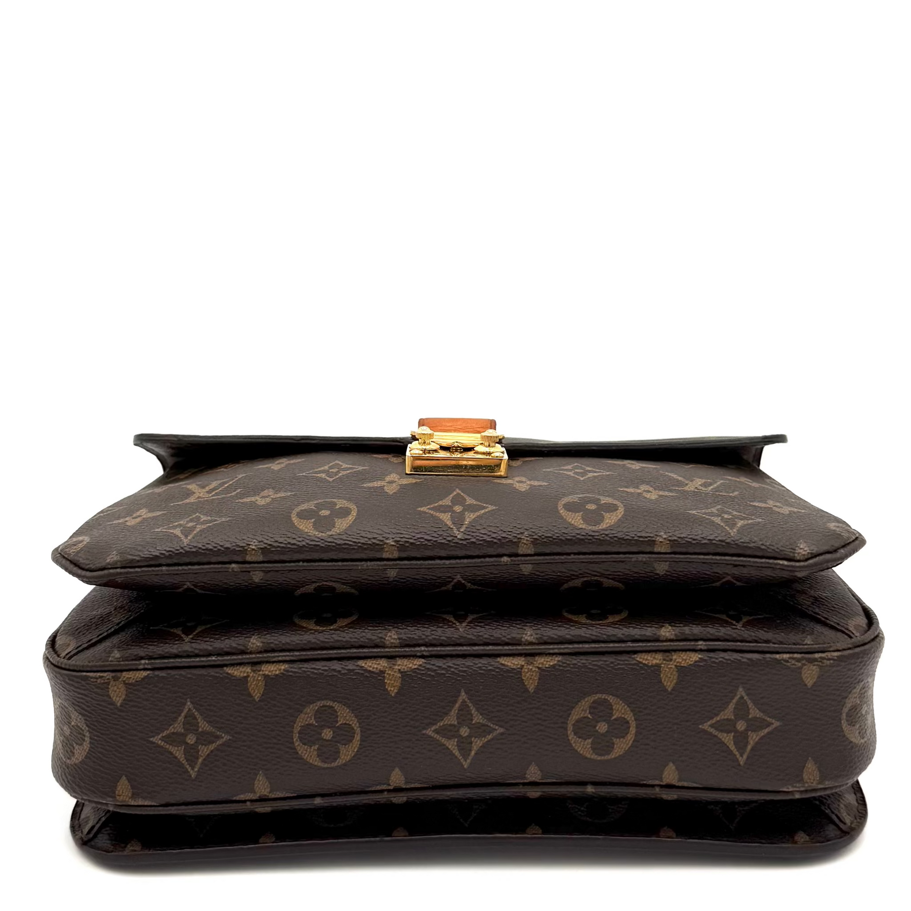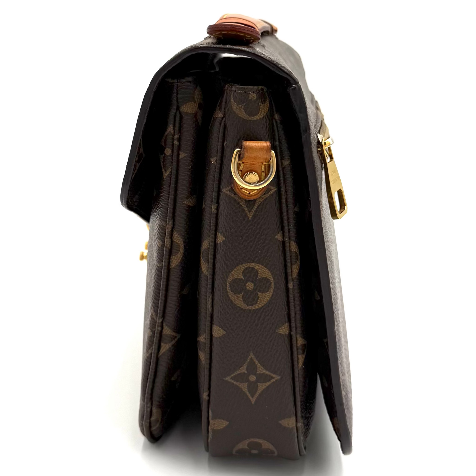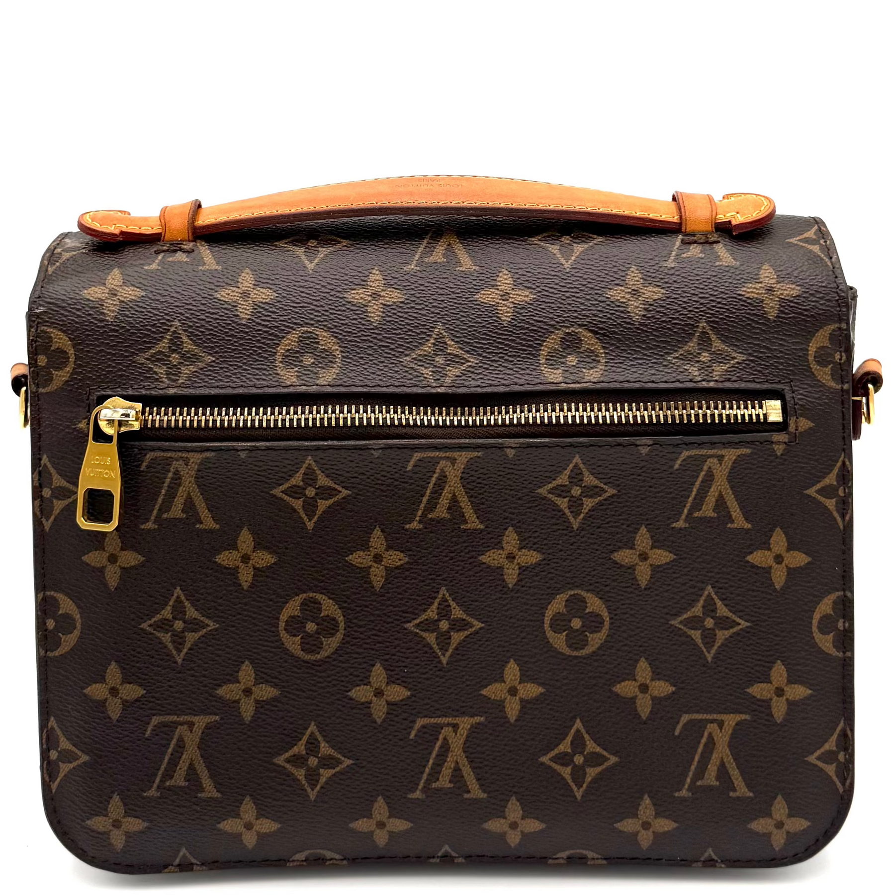 Crafted in classic Monogram canvas with natural vachetta leather trim, the Pochette Métis features a structured silhouette, signature S-lock closure, and a trio of interior compartments for easy organization. It is topped with a vachetta leather top-handle and coated canvas strap for shoulder or crossbody wear.