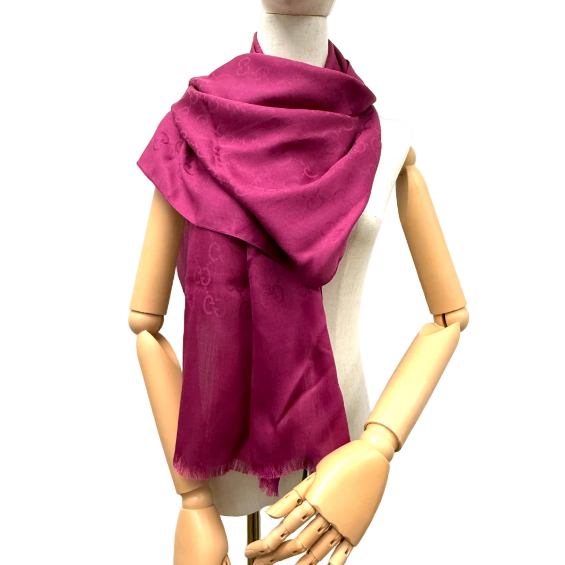 The rich fuchsia hue brings a pop of colour to any ensemble—perfect for draping over the shoulders, tying at the neck, or styling as a headscarf. Subtly branded with Gucci’s signature sophistication, this accessory combines modern glamour with classic Italian craftsmanship.
