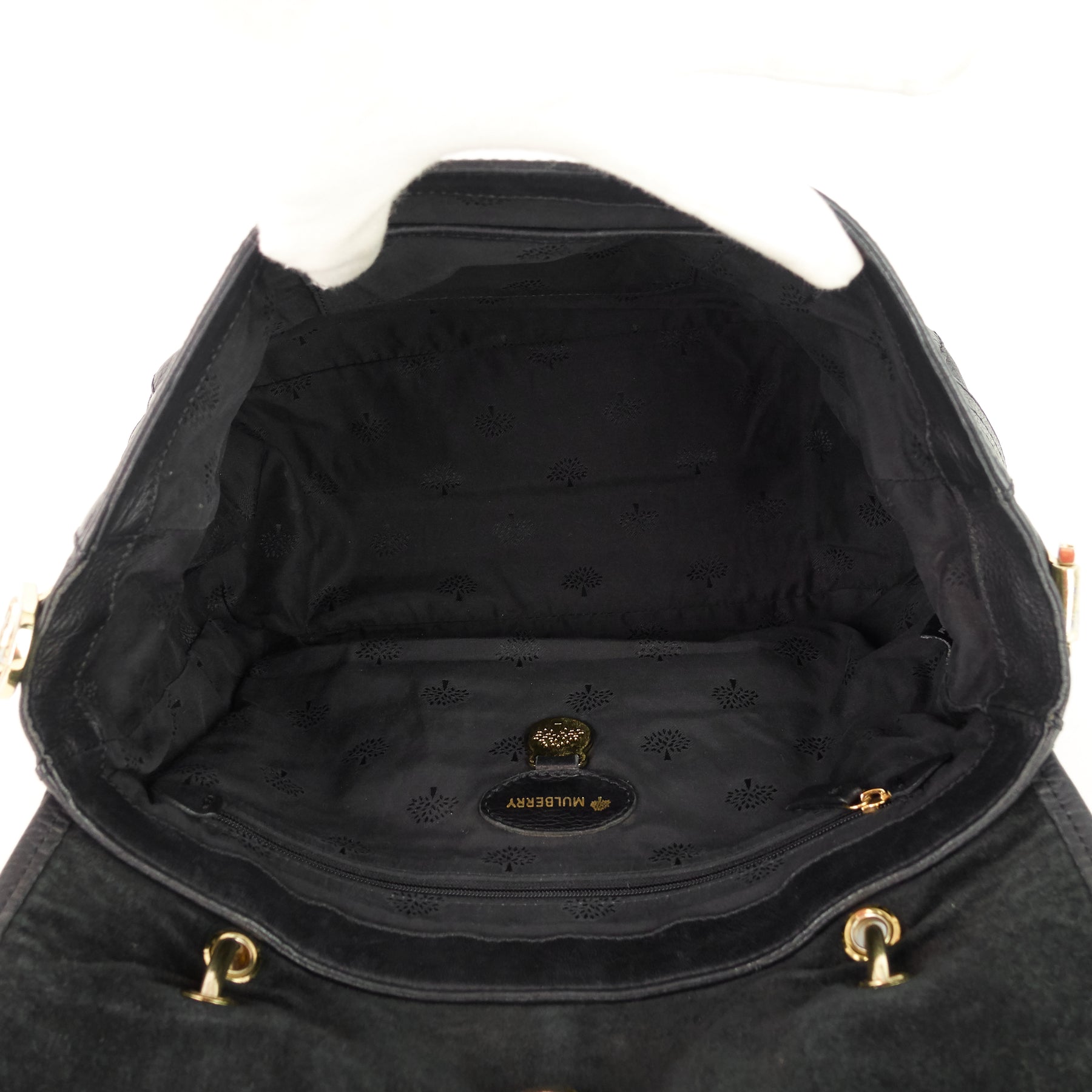 Black logo-fabric, black suede (underside of flap) |