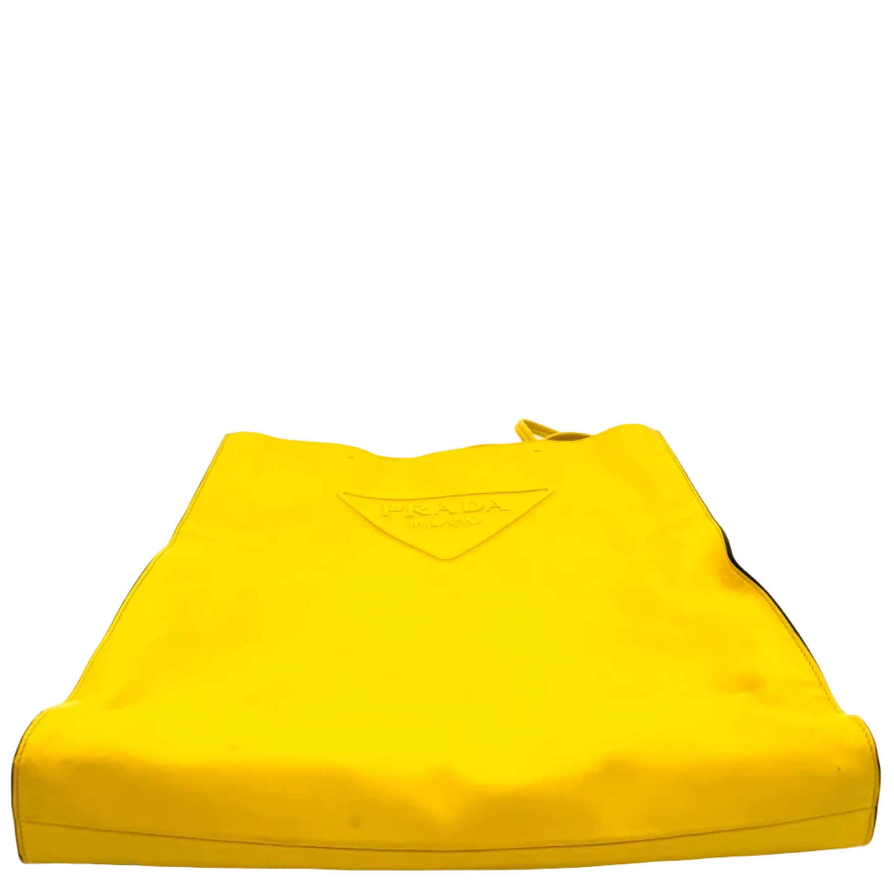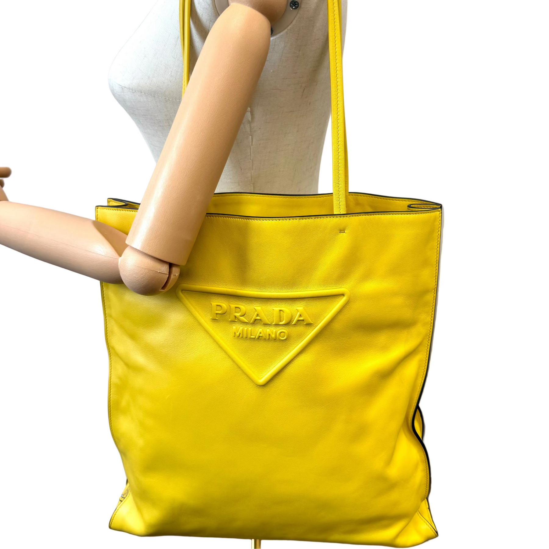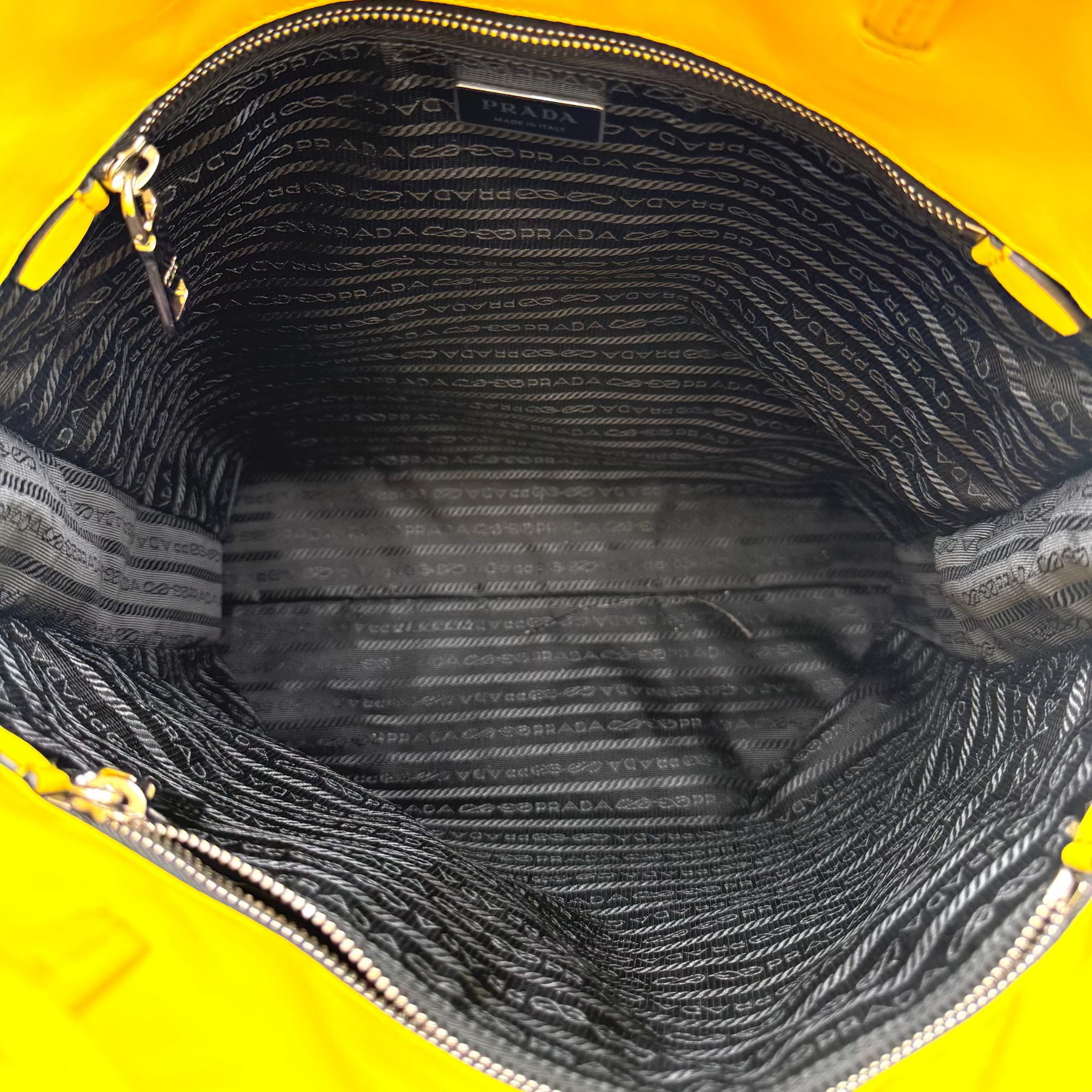 The vibrant lemon yellow hue is balanced by clean lines and subtle Prada branding, making it both eye-catching and sophisticated. Designed for everyday ease, the spacious interior comfortably holds daily essentials, while sturdy top handles allow for comfortable shoulder or hand carry.