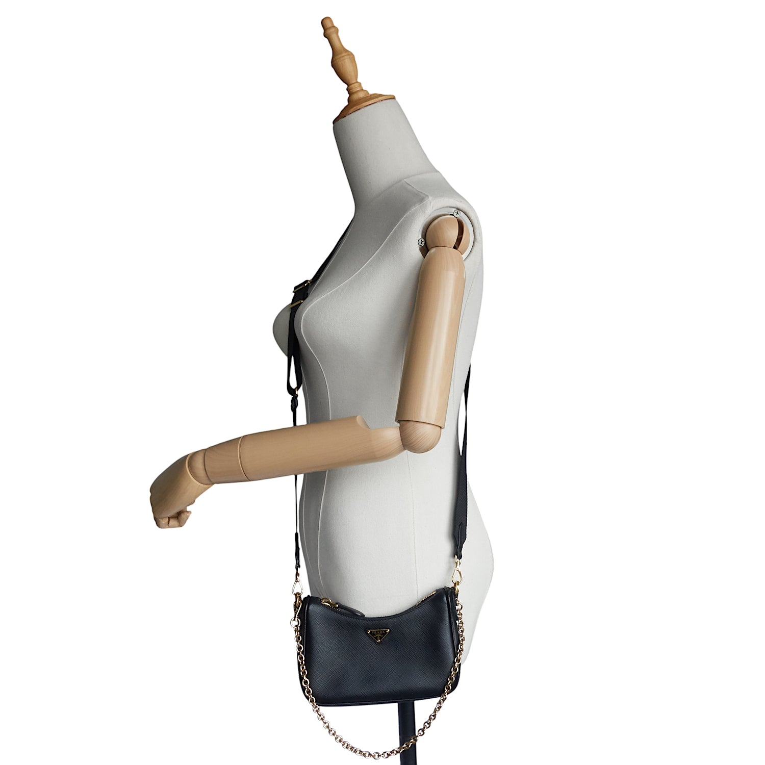 Crafted from Prada's iconic crosshatch-textured Saffiano leather in black, this shoulder bag is outfitted with a short chain-link strap as well as a longer nylon strap. Both straps are removable, letting you carry the look in hand.