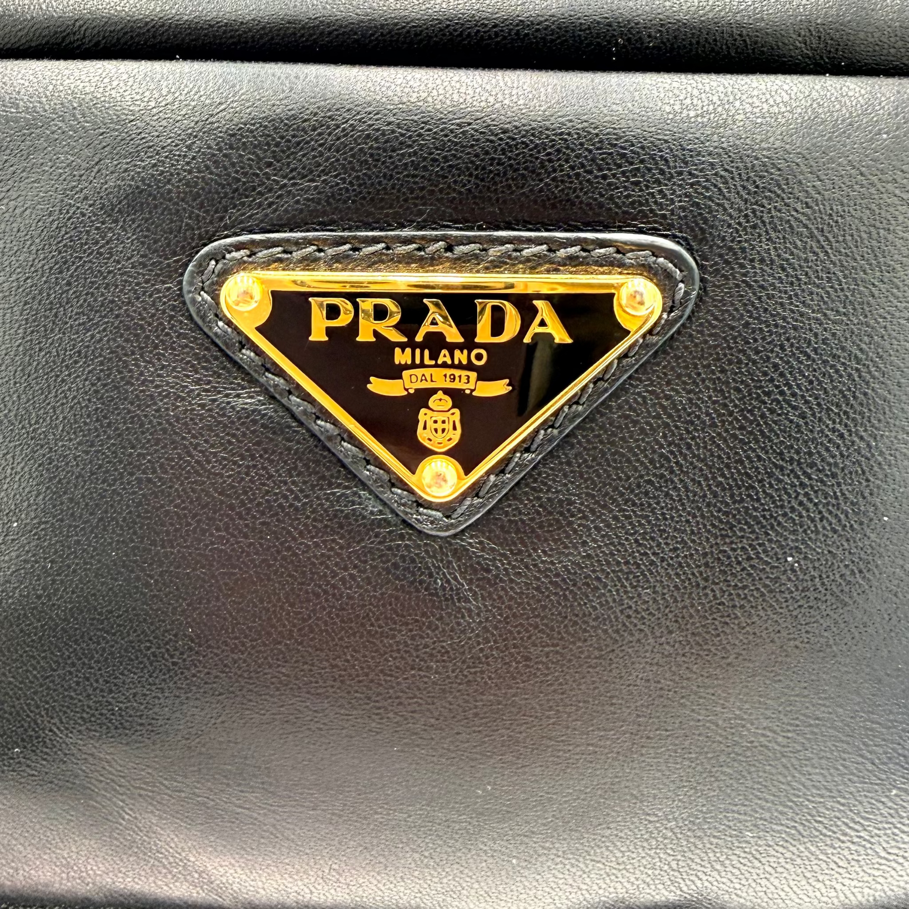 Soft, pillowy lambskin leather gives this sleek clutch a luxe feel, while Prada’s enameled triangle logo adds a bit of signature branding to an otherwise low-profile design.