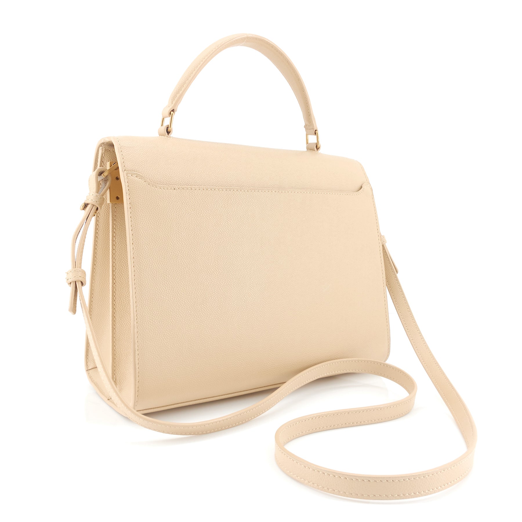 A pivoting monogram clasp adds a polished finishing touch on a structured handbag constructed from durable grain de poudre embossed leather.