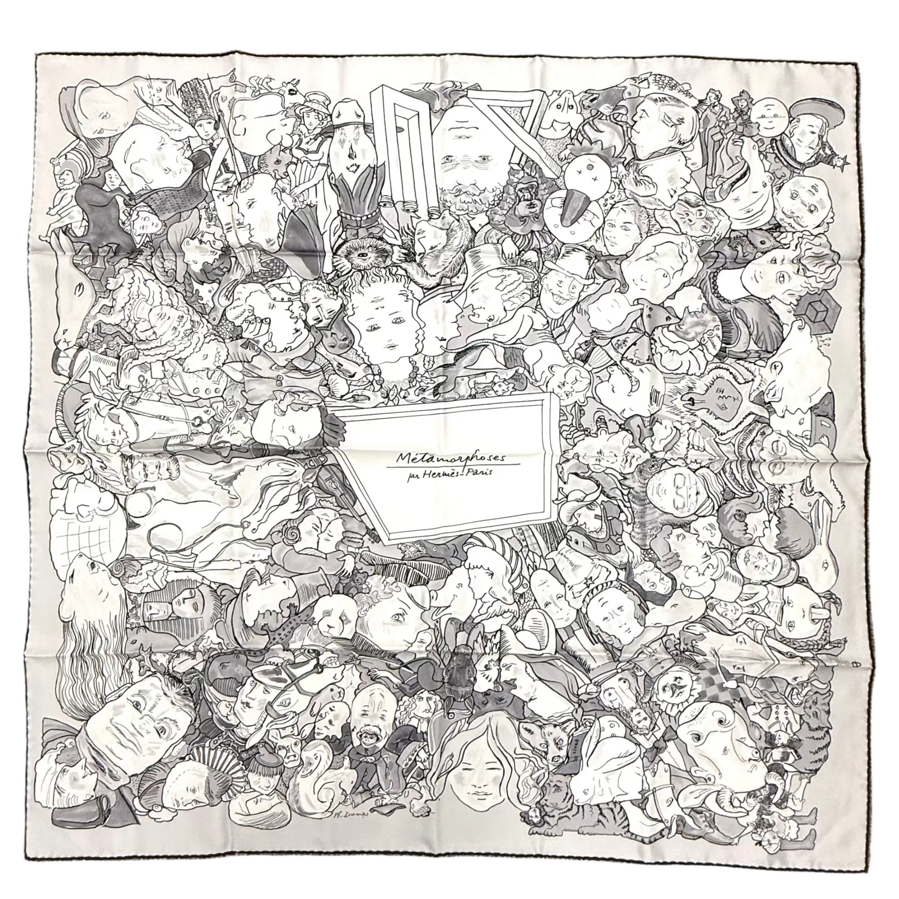 An Hermès scarf designed by Philippe Dumas. First issued in 2014 and inspired by historic optical illusion portrait puzzles from the Émile Hermès collection, the faces and figures on the scarf seem to change with perspective.