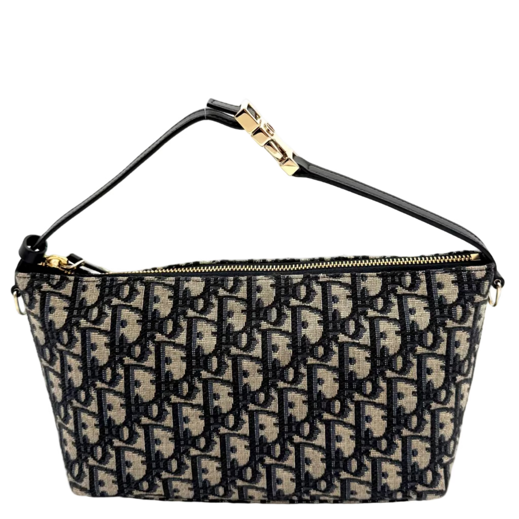 Topped with a military-inspired CD buckle, this durable pouch in blue Dior Oblique jacquard offers a stylish and safe way to carry your toiletries and makeup during your travels.