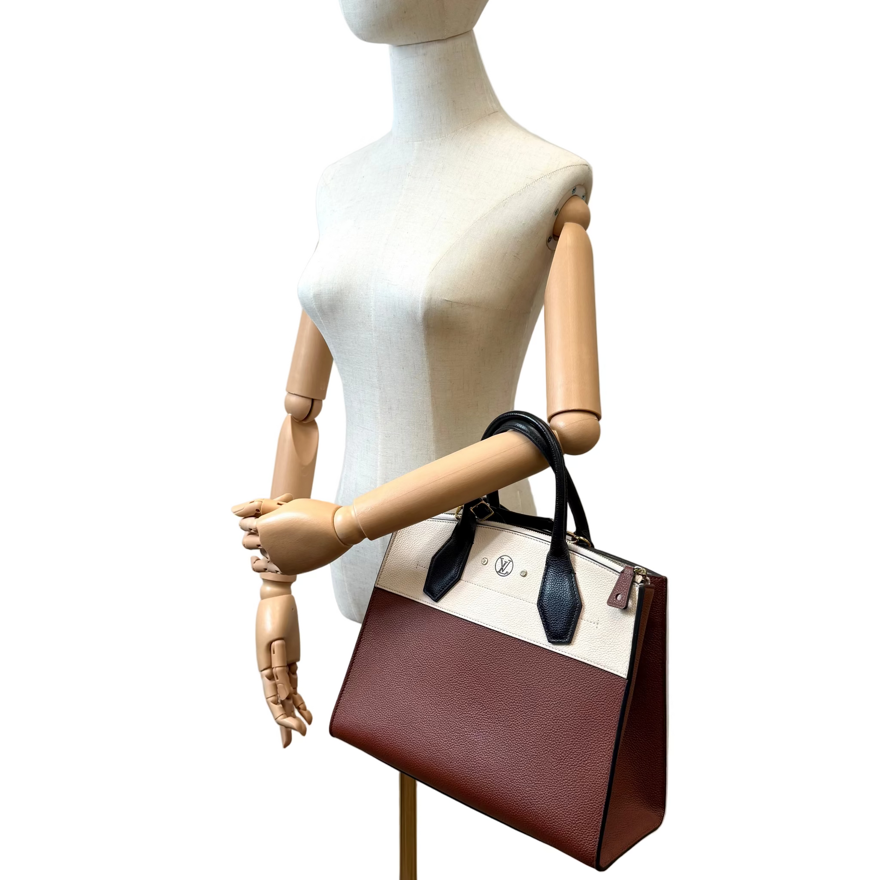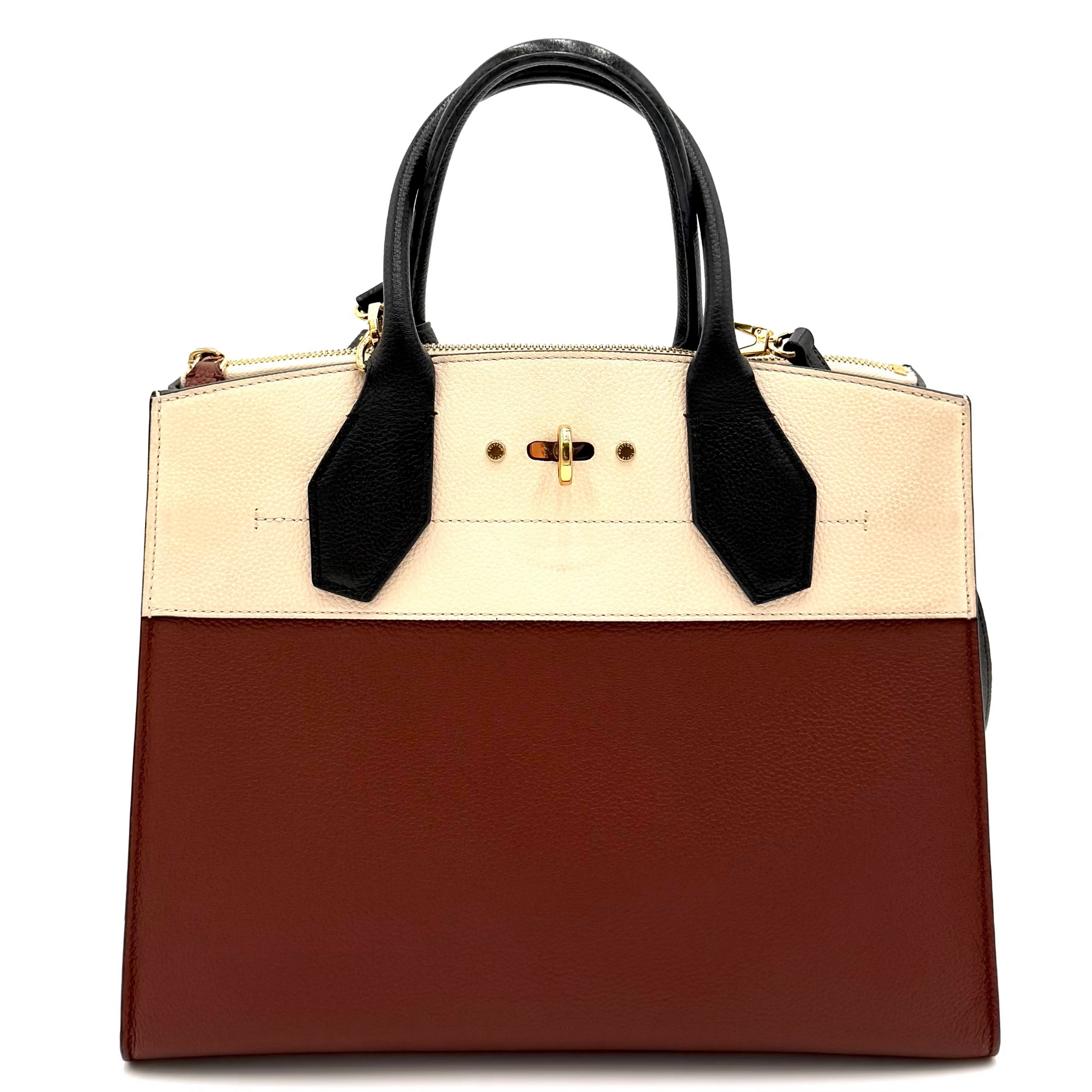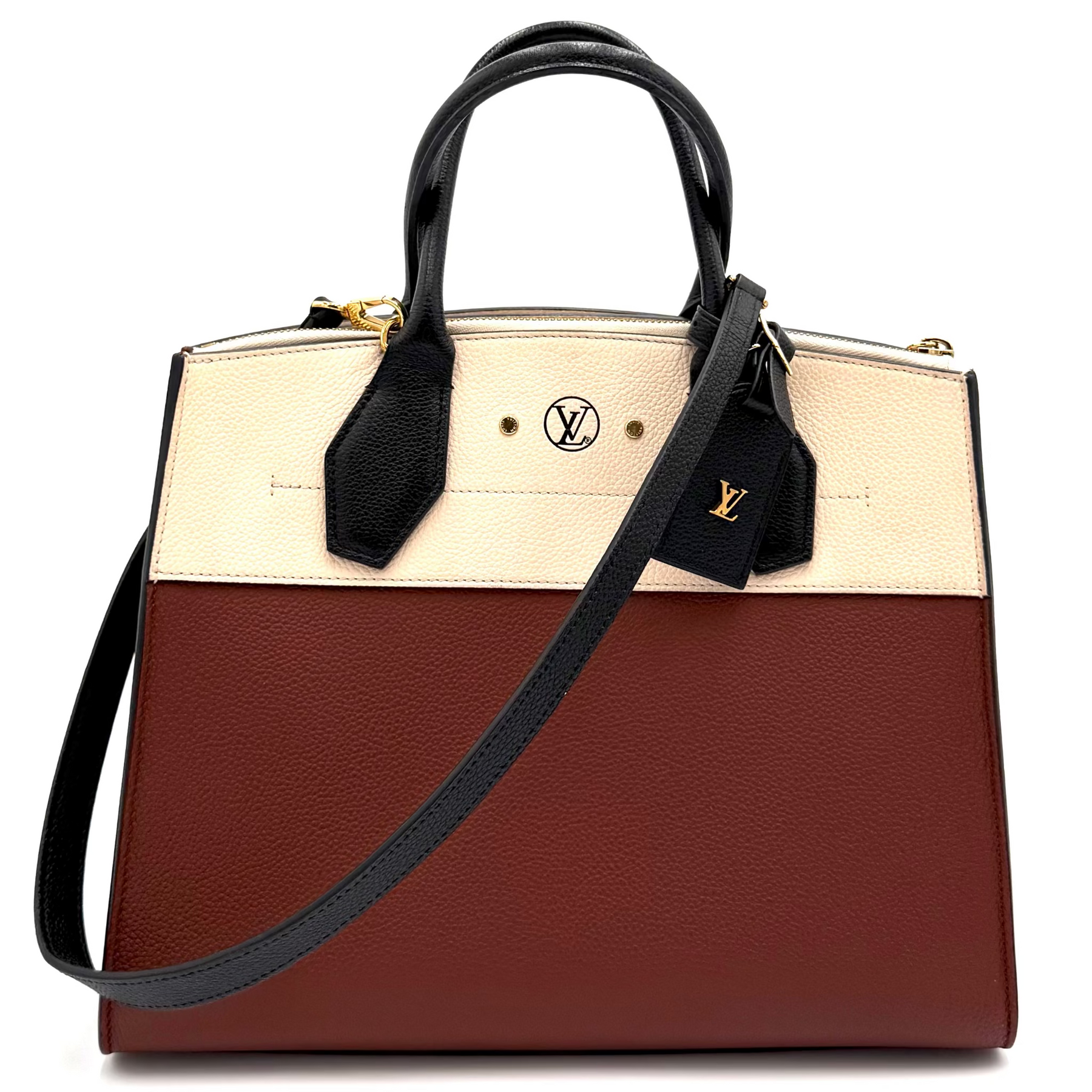 Bold, structured, and effortlessly sophisticated, the Louis Vuitton City Steamer PM in tri-colour leather is a striking modern classic. Crafted from smooth calfskin in a refined mix of complementary hues, it showcases the bag’s signature architectural silhouette with a fresh, fashion-forward edge.