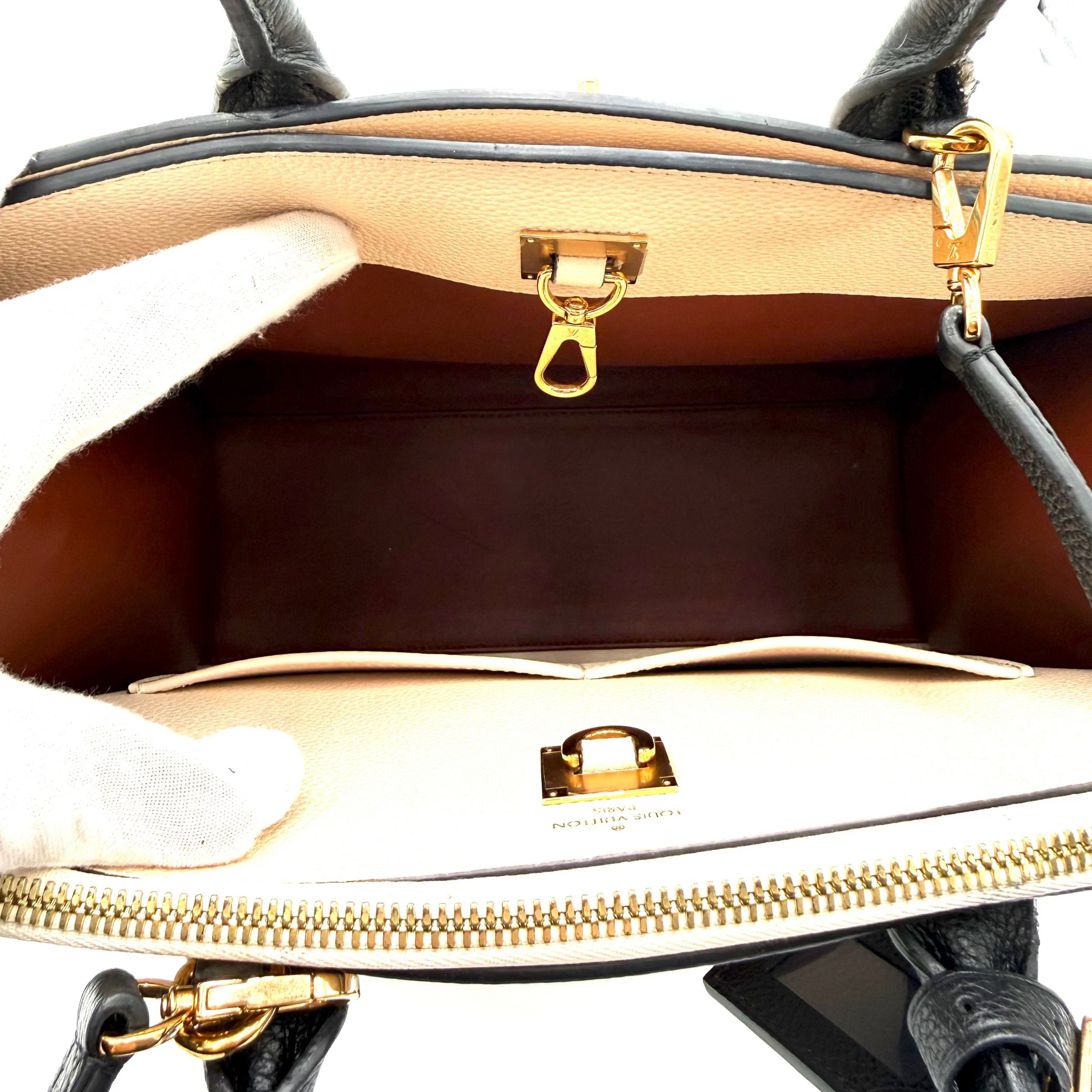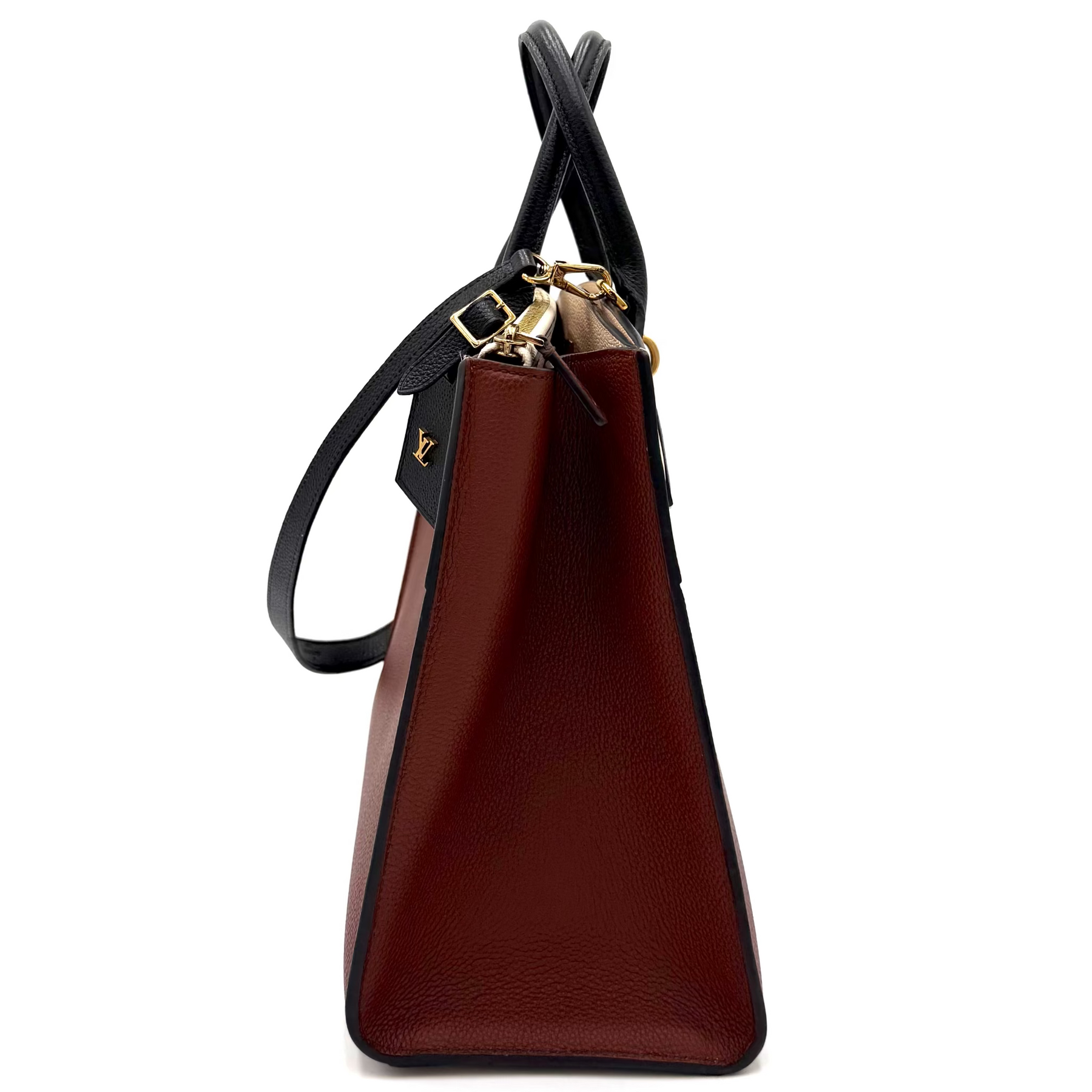 Polished hardware, engraved details, and the iconic LV padlock add heritage appeal, while rolled top handles and a detachable shoulder strap offer versatile styling. The thoughtfully organized interior features multiple compartments for everyday functionality without compromising elegance.