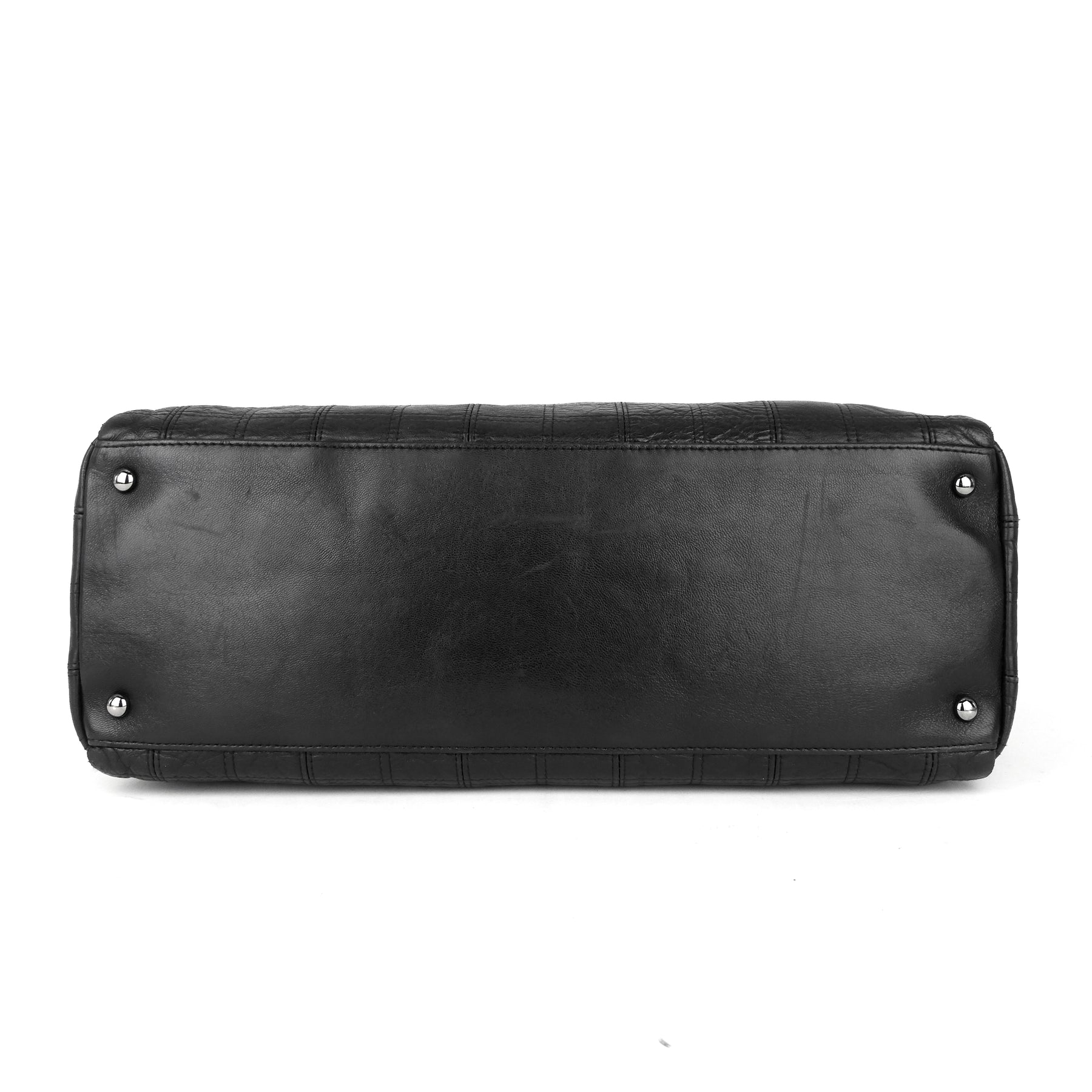Soft square-stitched lambskin leather with tubular handles comprise this slouchy Chanel shoulder bag. It features a total of three interior compartments - each lined with gray textile and fitted with a magnetic snap closure. The middle compartment also includes three wall pockets (one zipped, two flat) and a lobster clasp on a strap.