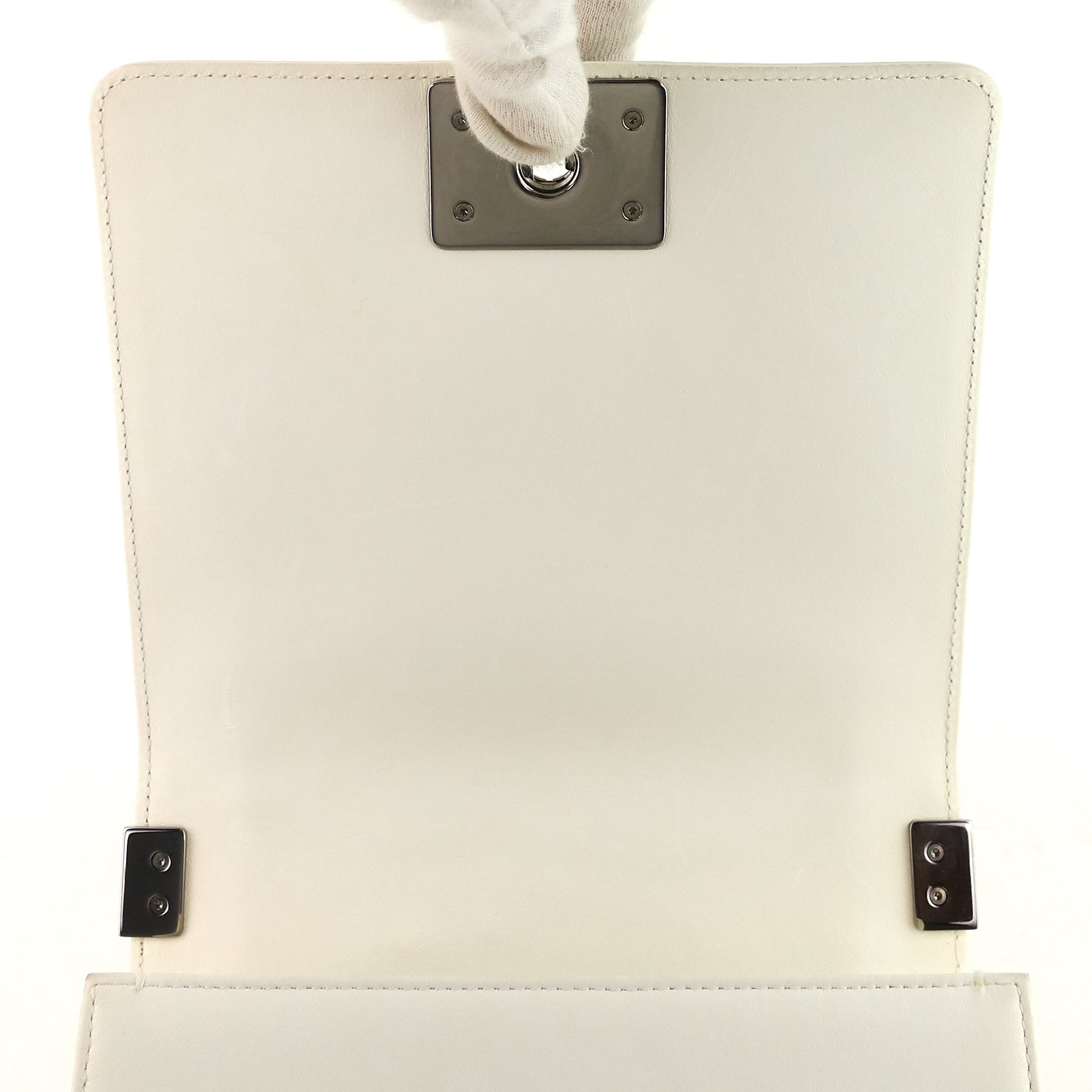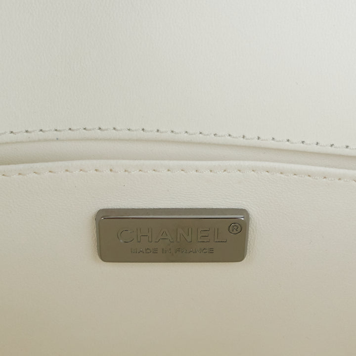 A Chanel Boy bag in lambskin leather detailed with Chanel No 5 graffiti. True to the style, it features a quilted border with sleek lines, a chunky chain strap, and an easily recognizable Double C clasp.