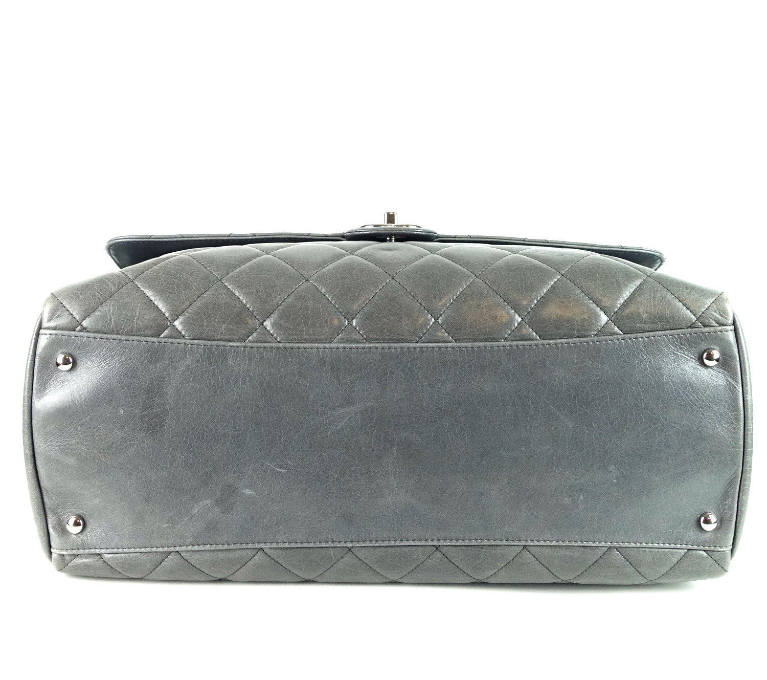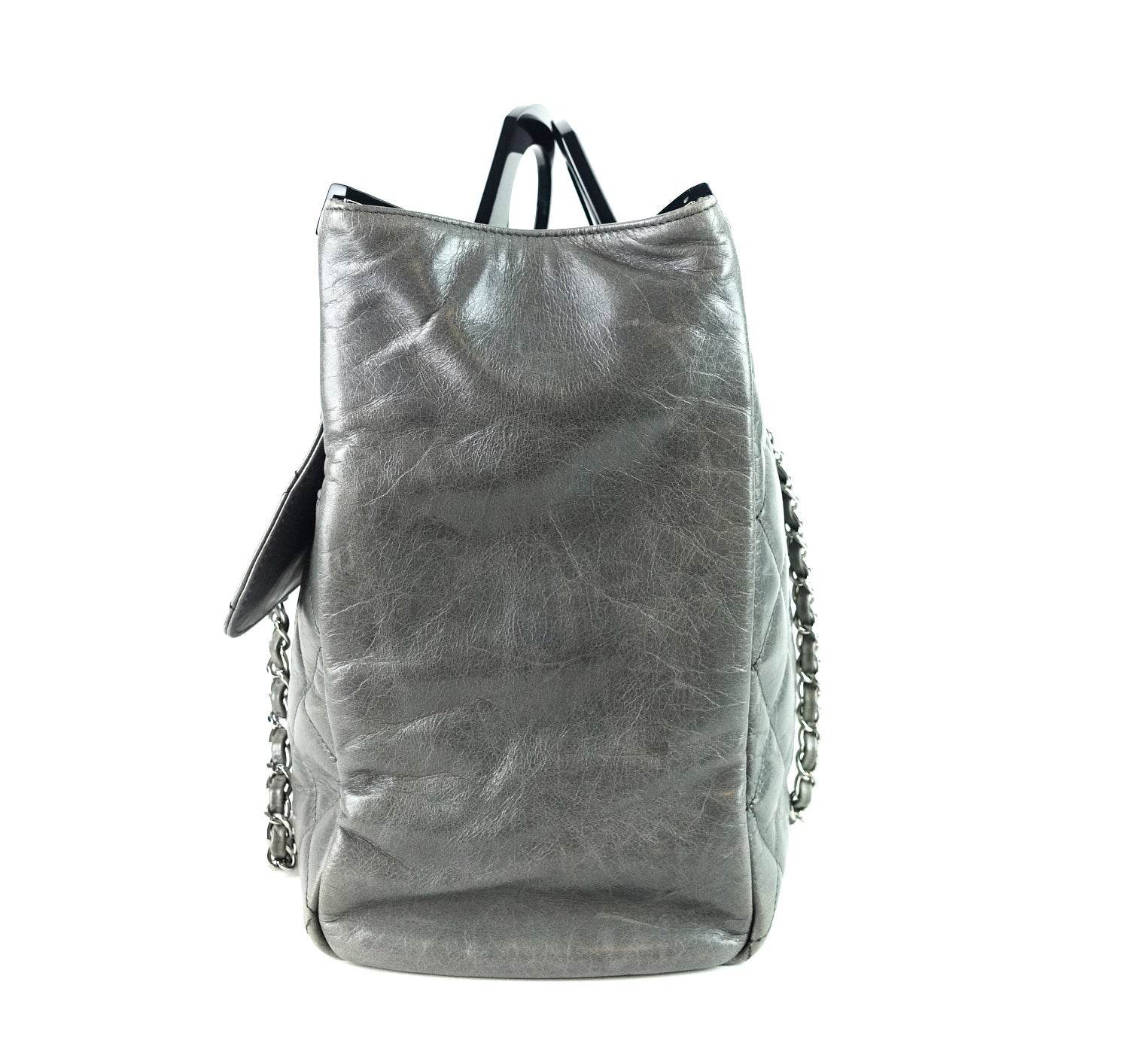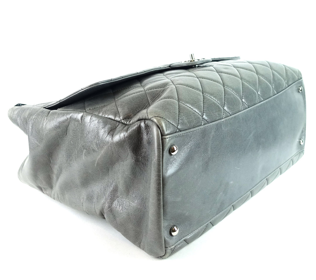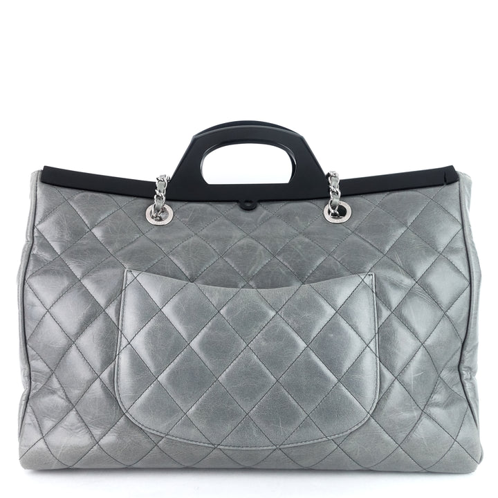 This authentic Chanel Delivery Large bag is crafted of luminous calf leather. This unique bag has a diamond stitch, black lacquer top handles, leather-woven chain straps, a slip rear pocket, and a front flap with a CC turn-lock closure. Its fabric interior has three pockets (two slip, one zippered). From Chanel's 2014 Fall/Winter Collection.