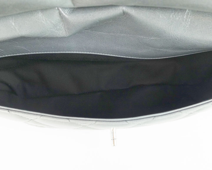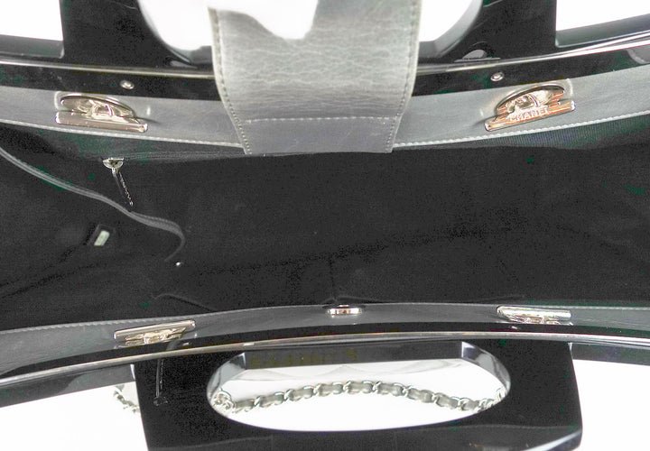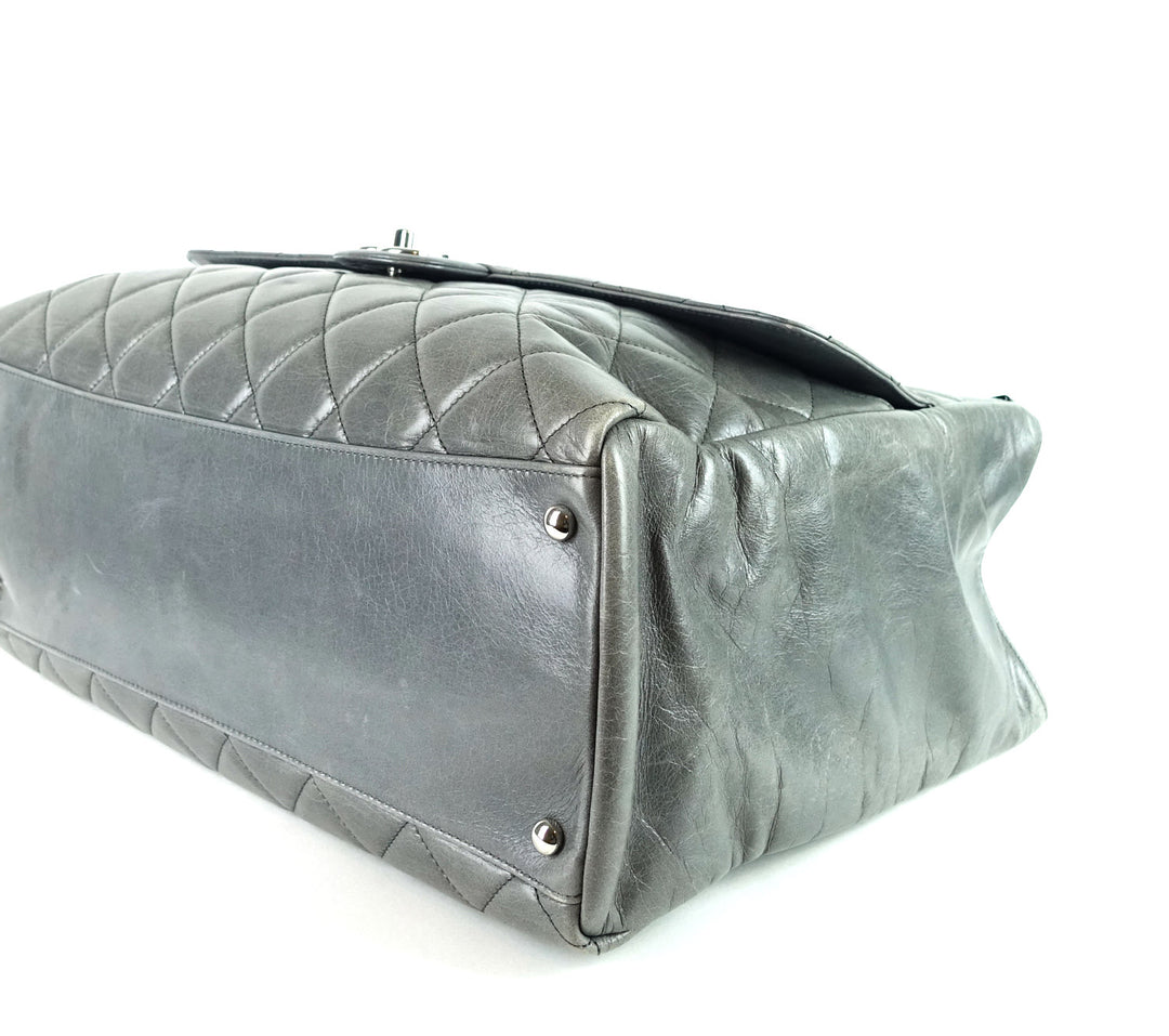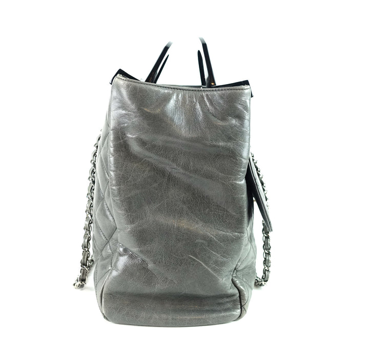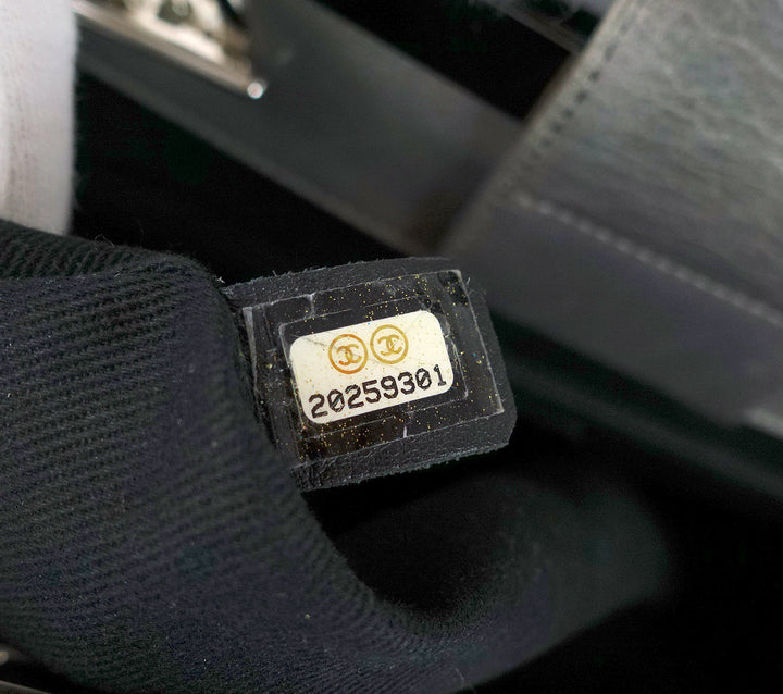This authentic Chanel Delivery Large bag is crafted of luminous calf leather. This unique bag has a diamond stitch, black lacquer top handles, leather-woven chain straps, a slip rear pocket, and a front flap with a CC turn-lock closure. Its fabric interior has three pockets (two slip, one zippered). From Chanel's 2014 Fall/Winter Collection.