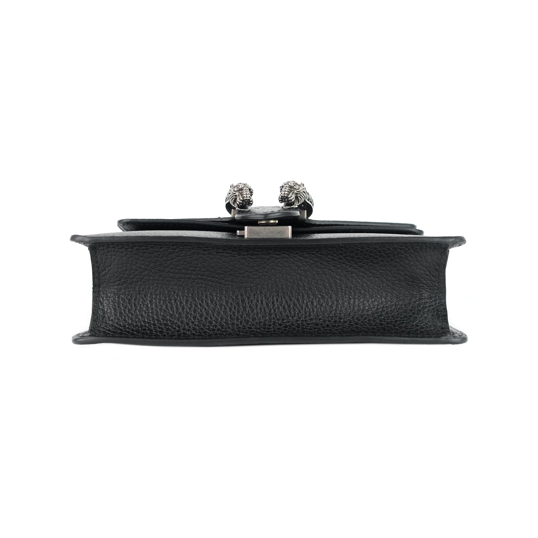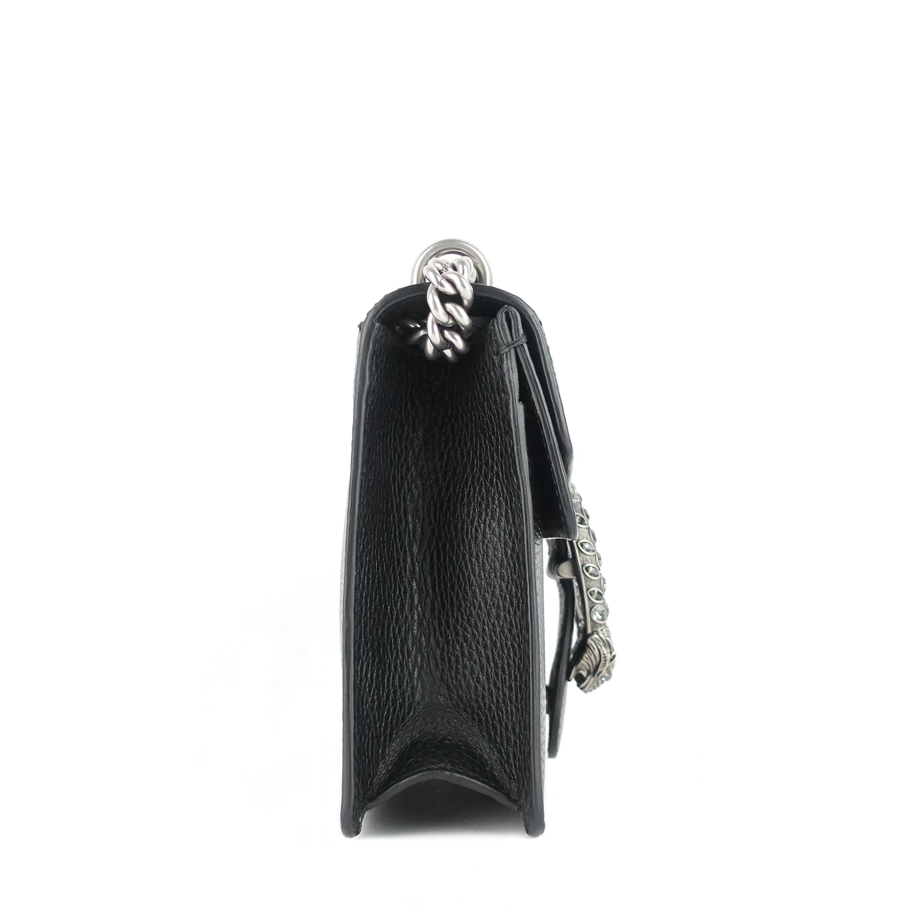 Inspired by the ancient Greek god Dionysus, a two-headed tiger spur embellished with crystals stands out on the front of a tanned leather bag outfitted with a sliding chain strap for over-the-shoulder or crossbody wear.