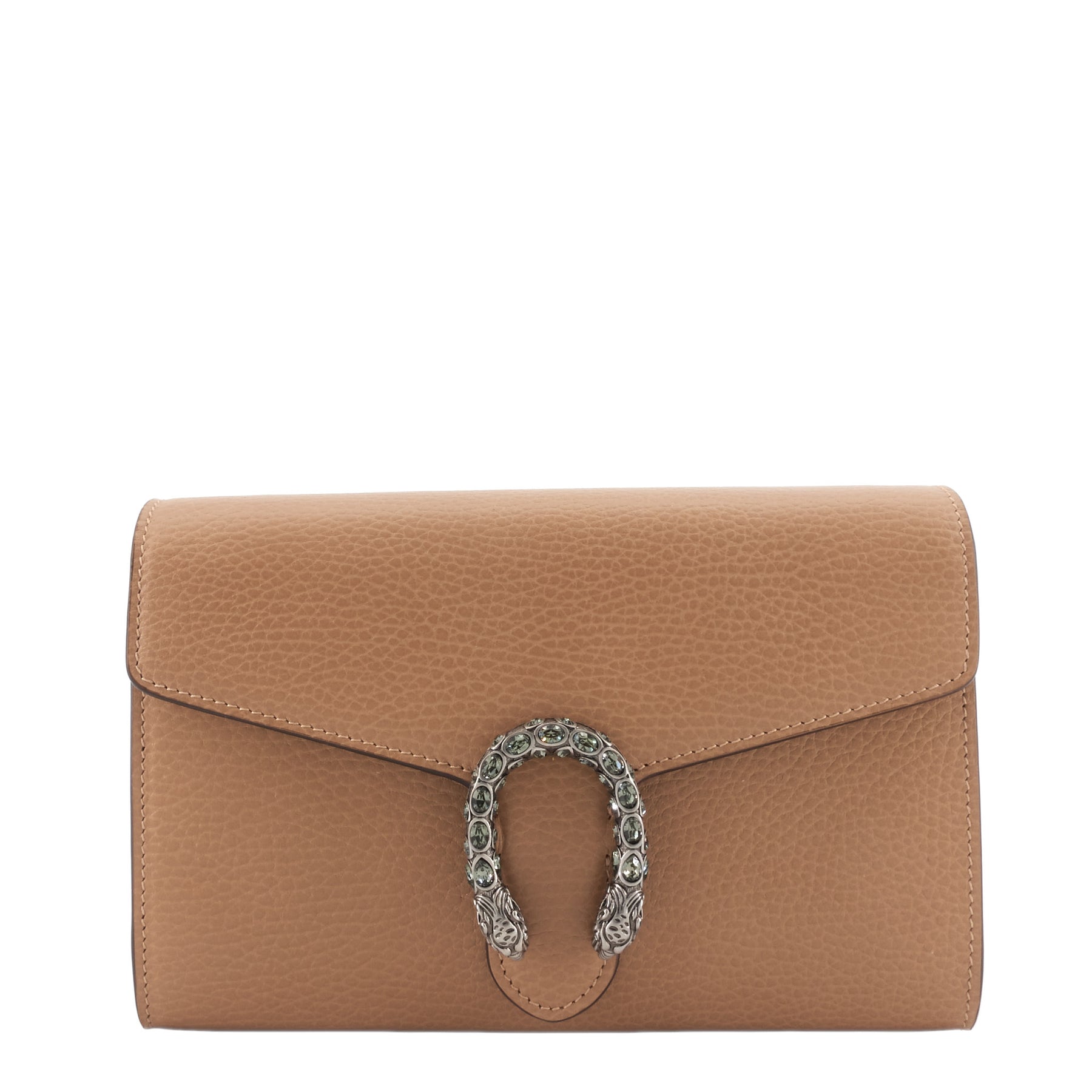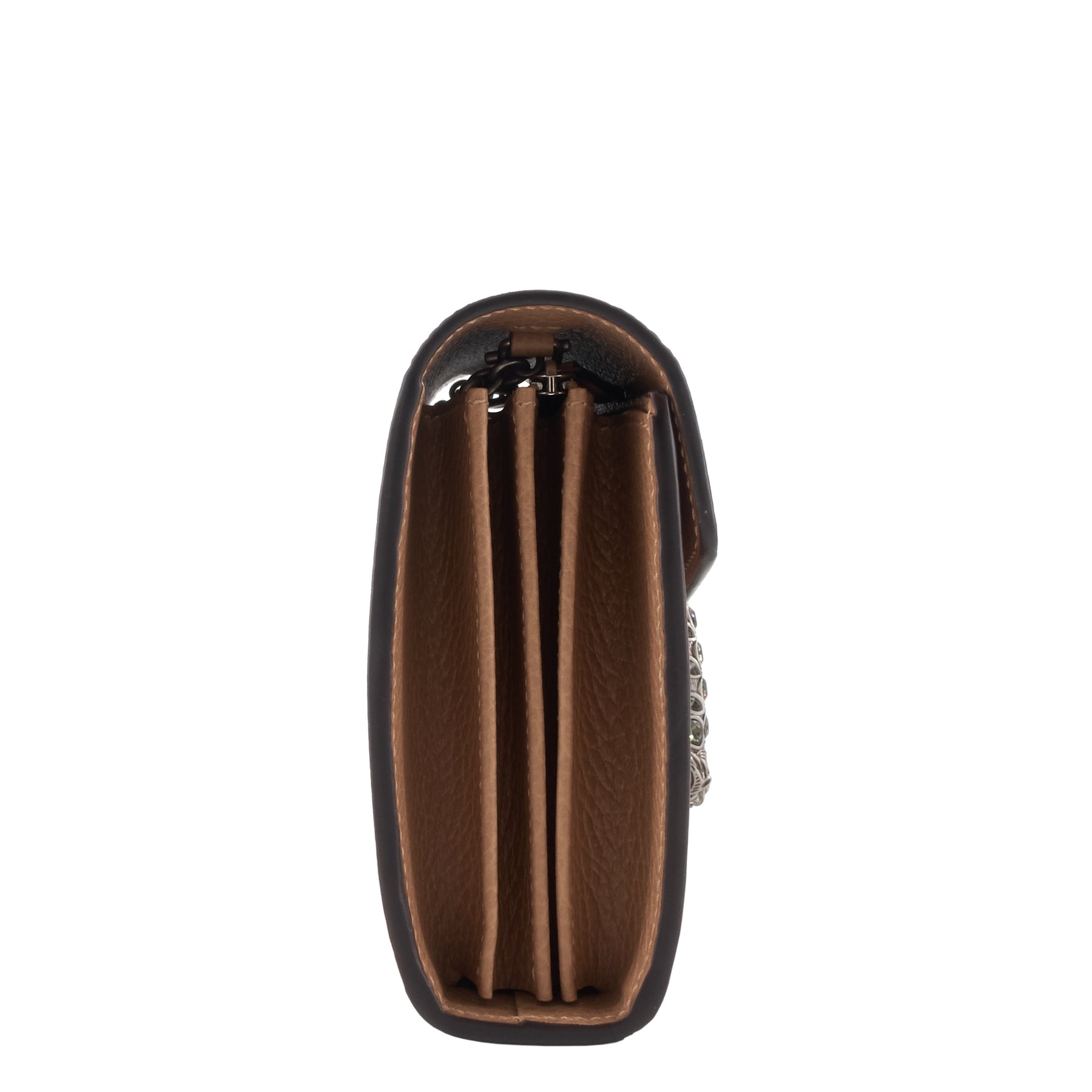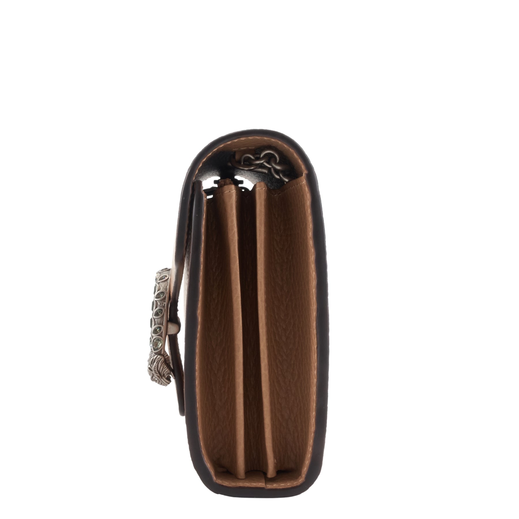The ancient Greek god of wine and revelry lends his name to a sleek shoulder bag made in Italy from textured leather. A double-headed tiger spur with crystal stones enhances the attractive modern look, while the divided interior allows for effortless organization.